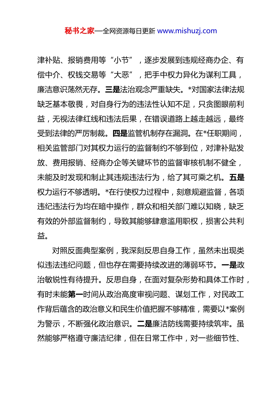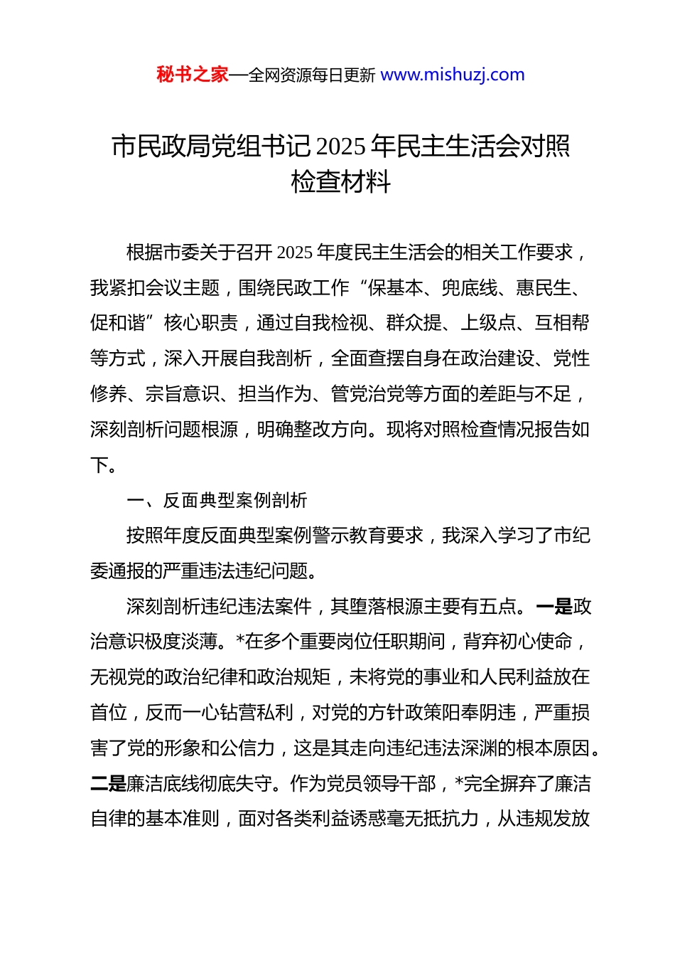 秘书之家—全网资源每日更新 www.mishuzj.com市民政局党组书记 2025 年民主生活会对照检查材料 根据市委关于召开 2025 年度民主生活会的相关工作要求,我紧扣会议主题,围绕民政工作“保基本、兜底线、惠民生、促和谐”核心职责,通过自我检视、群众提、上级点、互相帮等方式,深入开展自我剖析,全面查摆自身在政治建设、党性修养、宗旨意识、担当作为、管党治党等方面的差距与不足,深刻剖析问题根源,明确整改方向。现将对照检查情况报告如下。一、反面典型案例剖析按照年度反面典型案例警示教育要求,我深入学习了市纪委通报的严重违法违纪问题。深刻剖析违纪违法案件,其堕落根源主要有五点。一是政治意识极度淡薄。*在多个重要岗位任职期间,背弃初心使命,无视党的政治纪律和政治规矩,未将党的事业和人民利益放在首位,反而一心钻营私利,对党的方针政策阳奉阴违,严重损害了党的形象和公信力,这是其走向违纪违法深渊的根本原因。二是廉洁底线彻底失守。作为党员领导干部,*完全摒弃了廉洁自律的基本准则,面对各类利益诱惑毫无抵抗力,从违规发放秘书之家—全网资源每日更新 www.mishuzj.com津补贴、报销费用等“小节”,逐步发展到违规经商办企、有偿中介、权钱交易等“大恶”,把手中权力异化为谋利工具,廉洁意识荡然无存。三是法治观念严重缺失。*对国家法律法规缺乏基本敬畏,对自身行为的违法性认知不足,只贪图眼前利益,无视法律红线和违法后果,在错误道路上越走越远,最终受到法律的严厉制裁。四是监管机制存在漏洞。在*任职期间,相关监管部门对其权力运行的监督制约不够到位,对津补贴发放、费用报销、经商办企等关键环节的监督审核机制不健全,未能及时发现和制止其违规违法行为,给了其可乘之机。五是权力运行不够透明。*在行使权力过程中,刻意规避监督,各项违纪违法行为均在暗中操作,群众和相关部门难以知晓,缺乏有效的外部监督制约,导致其能够肆意滥用职权,损害公共利益。对照反面典型案例,我深刻反思自身工作,虽然未出现类似违法违纪问题,但也存在需要持续改进的薄弱环节。一是政治敏锐性有待提升。反思自身,在面对复杂形势和具体工作时,有时未能第一时间从政治高度审视问题、谋划工作,对民政工作背后蕴含的政治意义和民生价值把握不够精准,需要以*案例为警示,不断强化政治意识。二是廉洁防线需要持续筑牢。虽然能够严格遵守廉洁纪律,但在日常工作中,对一些细节性、秘书之家—全网资源每日更新 www.mishuzj.com苗头性问题的警惕性不够,对分管领域廉政风险的排查不够全面深入,需要以*案例为镜鉴,时刻绷紧廉洁自律这根弦。三是法治履职能力有待加强。在推进民政业务规范化建设过程中,对相关法律法规的学习应用不够深入,运用法治思维和法治方式解决民政领域复杂问题的能力有待提升,需要汲取*法治观念缺失的教训,不断强化法治意识。二、对照检查存在的主要问题(一)带头强化政治忠诚、提高政治能力方面。一是政治理论学习深度不足。虽然能够按时跟进学习习近平新时代中国特色社会主义思想、党的二十大及二十届历次全会精神及习近平总书记关于民政工作的重要论述,但学习存在“表层化、碎片化”问题。对理论知识的核心要义、精神实质、丰富内涵和实践要求钻研不深,多停留在“读过学过”的层面,缺乏系统性、深层次的思考领悟,未能完全做到学深悟透、融会贯通。例如,在学习习近平总书记关于“保障和改善民生是一项长期工作,没有终点站,只有连续不断的新起点”的重要论述时,仅满足于理解字面意思,对其蕴含的民生工作政治立场、价值导向把握不够精准,未能及时将其转化为推动民政工作高质量发展的具体思路和举措。二是政治能力与岗位职责匹配度不够。在统筹推进民政领域重大工作时,政治站位不够高,全局观念秘书之家—全网资源每日更新 www.mishuzj.com不够强,未能充分站在党和国家事业发展全局的高度谋划推进工作,有时存在“就民政抓民政”的局限思维。比如,在推进养老服务体系建设、社会救助精准化等重点工作时,更多关注本领域任务完成情况,对如何更好地对接乡村振兴、共同富裕等国家战略思考不足,未能充分发...