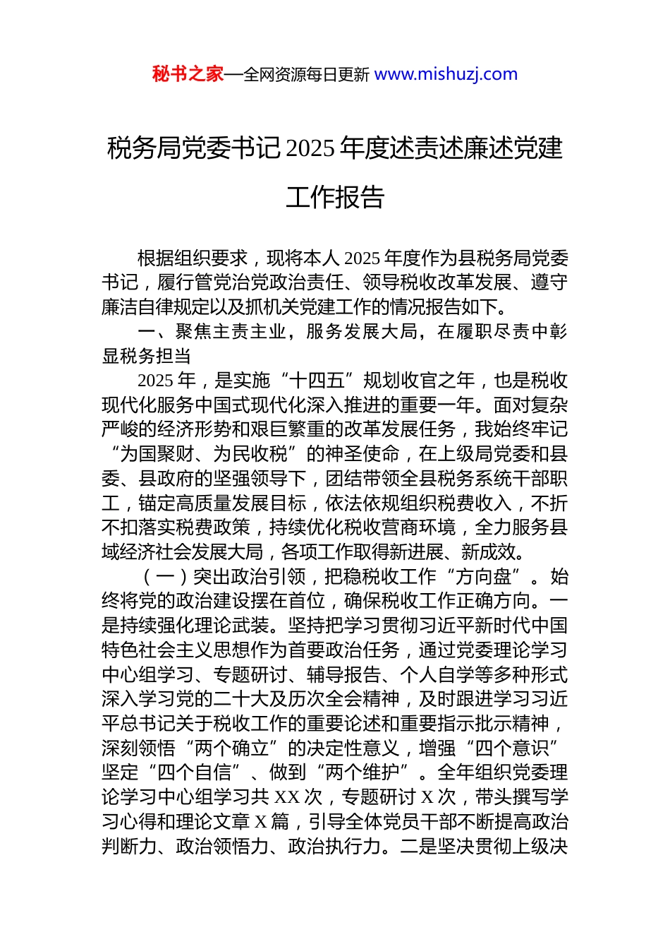 秘书之家—全网资源每日更新 www.mishuzj.com税务局党委书记 2025 年度述责述廉述党建工作报告根据组织要求,现将本人 2025 年度作为县税务局党委书记,履行管党治党政治责任、领导税收改革发展、遵守廉洁自律规定以及抓机关党建工作的情况报告如下。一、聚焦主责主业,服务发展大局,在履职尽责中彰显税务担当2025 年,是实施“十四五”规划收官之年,也是税收现代化服务中国式现代化深入推进的重要一年。面对复杂严峻的经济形势和艰巨繁重的改革发展任务,我始终牢记“为国聚财、为民收税”的神圣使命,在上级局党委和县委、县政府的坚强领导下,团结带领全县税务系统干部职工,锚定高质量发展目标,依法依规组织税费收入,不折不扣落实税费政策,持续优化税收营商环境,全力服务县域经济社会发展大局,各项工作取得新进展、新成效。(一)突出政治引领,把稳税收工作“方向盘”。始终将党的政治建设摆在首位,确保税收工作正确方向。一是持续强化理论武装。坚持把学习贯彻习近平新时代中国特色社会主义思想作为首要政治任务,通过党委理论学习中心组学习、专题研讨、辅导报告、个人自学等多种形式深入学习党的二十大及历次全会精神,及时跟进学习习近平总书记关于税收工作的重要论述和重要指示批示精神,深刻领悟“两个确立”的决定性意义,增强“四个意识”坚定“四个自信”、做到“两个维护”。全年组织党委理论学习中心组学习共 XX 次,专题研讨 X 次,带头撰写学习心得和理论文章 X 篇,引导全体党员干部不断提高政治判断力、政治领悟力、政治执行力。二是坚决贯彻上级决秘书之家—全网资源每日更新 www.mishuzj.com策部署。不折不扣贯彻落实党中央、国务院重大决策部署以及上级局党委、县委县政府的工作要求,确保政令畅通令行禁止。围绕服务国家重大发展战略和县域经济社会发展重点,研究制定具体落实措施,将政治要求贯穿于税收政策落实、组织收入、征管改革、纳税服务、队伍建设等各方面、全过程。三是严守政治纪律规矩。教育引导全体税务干部旗帜鲜明讲政治,严格遵守党的政治纪律和政治规矩,在大是大非面前保持清醒头脑,在关键时刻站稳政治立场,自觉在思想上政治上行动上同以习近平同志为核心的党中央保持高度一致,确保全县税收事业始终沿着正确方向前进。(二)依法组织收入,筑牢县域发展“财力基”。坚持依法依规征税收费,为县域高质量发展提供坚实财力保障。一是科学研判收入形势。密切关注宏观经济走势和县域经济发展动态,加强税收经济分析,精准研判税源变化趋势,科学预测收入目标,牢牢把握组织收入主动权。定期召开收入形势分析会,及时解决组织收入工作中遇到的困难和问题。二是依法规范征收管理。坚决贯彻依法征税原则,严守组织收入纪律,坚决防止和纠正收“过头税费”、虚收空转等行为。加强重点税源监控,深化税收风险分析应对,加大欠税清缴力度,确保税款及时足额入库全年组织各项税费收入 XX 亿元,同比增长 X%,完成年度预期目标,收入质量稳步提升。三是加强非税收入征管。按照职责划转要求,平稳有序做好各项非税收入的征收工作,不断完善征管流程,提升征管效能,确保非税收入依法规范、应收尽收。(三)精准落实政策,激活市场主体“动力源”。将落实落细税费支持政策作为服务大局的关键之举,全力助企纾困、激发活力。一是政策宣传广覆盖。充分利用纳税人学堂、税企交流群、办税服务厅、官方网站、微信公众号等线上线下渠道,开展形式多样、精准滴灌的政策宣传秘书之家—全网资源每日更新 www.mishuzj.com辅导,确保纳税人缴费人应知尽知、应享尽享。全年组织开展专题政策宣讲会 XX 场,推送政策解读信息 X 余条。二是政策落实快准稳。依托税收大数据,精准识别符合优惠政策条件的纳税人缴费人,主动推送政策信息,简化办理流程,推行“自行判别、申报享受、相关资料留存备查”的办理方式,确保各项减税降费、退税缓税政策第一时间直达快享。全年累计落实新增减税降费及退税缓费 XX亿元,惠及市场主体 X 万余户(次),有效减轻了企业负担,提振了市场信心。三是政策效应深分析。加强对税费政策落实情况的跟踪...