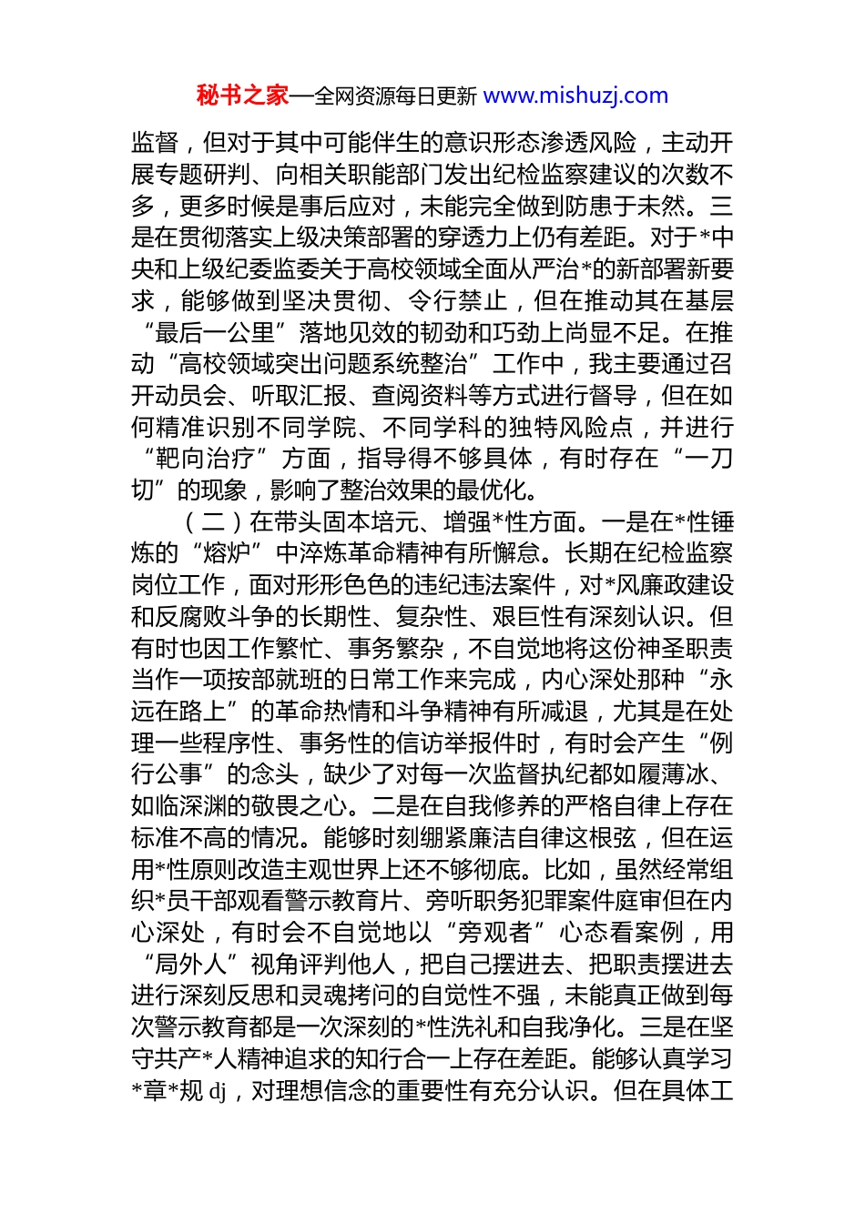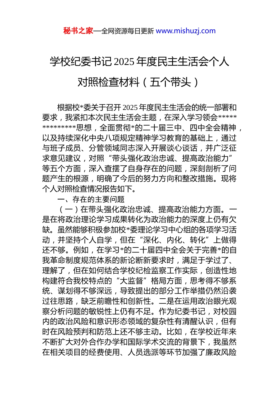 秘书之家—全网资源每日更新 www.mishuzj.com学校纪委书记 2025 年度民主生活会个人对照检查材料(五个带头)根据校*委关于召开 2025 年度民主生活会的统一部署和要求,我紧扣本次民主生活会主题,在深入学习领会**************思想,全面贯彻*的二十届三中、四中全会精神,以及持续深化中央八项规定精神学习教育的基础上,通过与班子成员、分管领域同志深入开展谈心谈话,并广泛征求意见建议,对照“带头强化政治忠诚、提高政治能力”等五个方面,深入查摆了自身存在的问题,深刻剖析了问题产生的根源,明确了今后的努力方向和整改措施。现将个人对照检查情况报告如下。一、存在的主要问题(一)在带头强化政治忠诚、提高政治能力方面。一是在将政治理论学习成果转化为政治能力的深度上仍有欠缺。虽然能够积极参加校*委理论学习中心组的各项学习活动,并坚持个人自学,但在“深化、内化、转化”上做得还不够。例如,在学习*的二十届四中全会关于完善*的自我革命制度规范体系的新论断新要求时,满足于学过了、理解了,但在如何结合学校纪检监察工作实际,创造性地构建符合我校特点的“大监督”格局方面,思考得不够系统、谋划得不够深远,导致提出的部分工作举措仍然沿袭过往思路,缺乏前瞻性和创新性。二是在运用政治眼光观察分析问题的敏锐性上仍有不足。作为纪委书记,对校园内的政治风险和意识形态领域的复杂性有清醒认识,但有时在风险预判和防范上还不够主动。比如,在学校近年来不断扩大对外合作办学和国际学术交流的背景下,我虽然在相关项目的经费使用、人员选派等环节加强了廉政风险秘书之家—全网资源每日更新 www.mishuzj.com监督,但对于其中可能伴生的意识形态渗透风险,主动开展专题研判、向相关职能部门发出纪检监察建议的次数不多,更多时候是事后应对,未能完全做到防患于未然。三是在贯彻落实上级决策部署的穿透力上仍有差距。对于*中央和上级纪委监委关于高校领域全面从严治*的新部署新要求,能够做到坚决贯彻、令行禁止,但在推动其在基层“最后一公里”落地见效的韧劲和巧劲上尚显不足。在推动“高校领域突出问题系统整治”工作中,我主要通过召开动员会、听取汇报、查阅资料等方式进行督导,但在如何精准识别不同学院、不同学科的独特风险点,并进行“靶向治疗”方面,指导得不够具体,有时存在“一刀切”的现象,影响了整治效果的最优化。(二)在带头固本培元、增强*性方面。一是在*性锤炼的“熔炉”中淬炼革命精神有所懈怠。长期在纪检监察岗位工作,面对形形色色的违纪违法案件,对*风廉政建设和反腐败斗争的长期性、复杂性、艰巨性有深刻认识。但有时也因工作繁忙、事务繁杂,不自觉地将这份神圣职责当作一项按部就班的日常工作来完成,内心深处那种“永远在路上”的革命热情和斗争精神有所减退,尤其是在处理一些程序性、事务性的信访举报件时,有时会产生“例行公事”的念头,缺少了对每一次监督执纪都如履薄冰、如临深渊的敬畏之心。二是在自我修养的严格自律上存在标准不高的情况。能够时刻绷紧廉洁自律这根弦,但在运用*性原则改造主观世界上还不够彻底。比如,虽然经常组织*员干部观看警示教育片、旁听职务犯罪案件庭审但在内心深处,有时会不自觉地以“旁观者”心态看案例,用“局外人”视角评判他人,把自己摆进去、把职责摆进去进行深刻反思和灵魂拷问的自觉性不强,未能真正做到每次警示教育都是一次深刻的*性洗礼和自我净化。三是在坚守共产*人精神追求的知行合一上存在差距。能够认真学习*章*规 dj,对理想信念的重要性有充分认识。但在具体工秘书之家—全网资源每日更新 www.mishuzj.com作中,对一些“软性”的作风问题不够“较真”。例如,在参加一些工作会议时,发现有的同志发言材料空话套话较多,结合实际不紧密,虽然心里不认同,但考虑到要维护团结、不影响会议进程,大多时候没有当场予以严肃指出,实质上是对不良风气的妥协和纵容,未能将坚定的*性原则时时刻刻体现到一言一行之中。(三)在带头敬畏人民、敬畏组织、敬畏法纪方面。一是在践行新时代*的群众路线上深入基层不够。虽然按照学校*委的要求,定期深入基层联系...