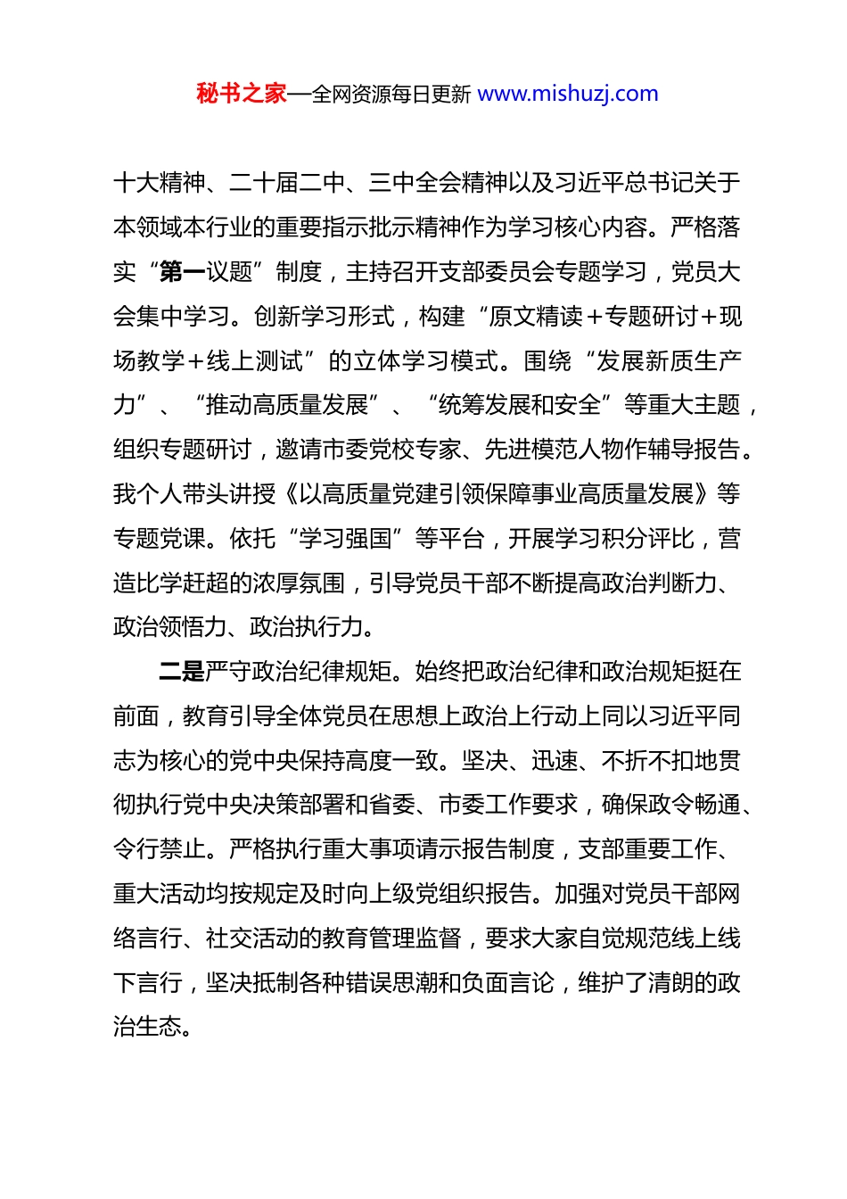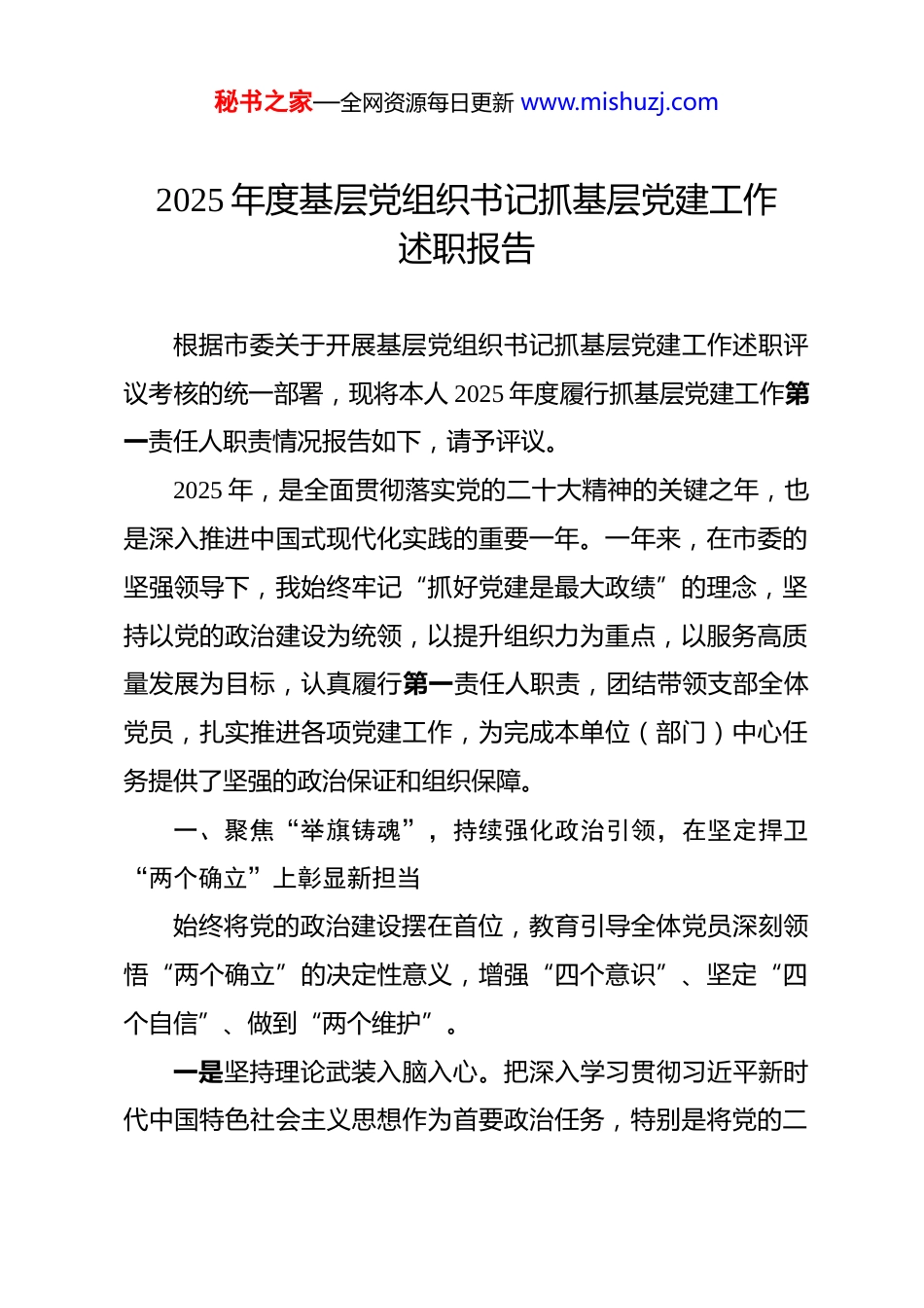 秘书之家—全网资源每日更新 www.mishuzj.com2025 年度基层党组织书记抓基层党建工作述职报告 根据市委关于开展基层党组织书记抓基层党建工作述职评议考核的统一部署,现将本人 2025 年度履行抓基层党建工作第一责任人职责情况报告如下,请予评议。2025 年,是全面贯彻落实党的二十大精神的关键之年,也是深入推进中国式现代化实践的重要一年。一年来,在市委的坚强领导下,我始终牢记“抓好党建是最大政绩”的理念,坚持以党的政治建设为统领,以提升组织力为重点,以服务高质量发展为目标,认真履行第一责任人职责,团结带领支部全体党员,扎实推进各项党建工作,为完成本单位(部门)中心任务提供了坚强的政治保证和组织保障。一、聚焦“举旗铸魂”,持续强化政治引领,在坚定捍卫“两个确立”上彰显新担当始终将党的政治建设摆在首位,教育引导全体党员深刻领悟“两个确立”的决定性意义,增强“四个意识”、坚定“四个自信”、做到“两个维护”。一是坚持理论武装入脑入心。把深入学习贯彻习近平新时代中国特色社会主义思想作为首要政治任务,特别是将党的二秘书之家—全网资源每日更新 www.mishuzj.com十大精神、二十届二中、三中全会精神以及习近平总书记关于本领域本行业的重要指示批示精神作为学习核心内容。严格落实“第一议题”制度,主持召开支部委员会专题学习,党员大会集中学习。创新学习形式,构建“原文精读+专题研讨+现场教学+线上测试”的立体学习模式。围绕“发展新质生产力”、“推动高质量发展”、“统筹发展和安全”等重大主题,组织专题研讨,邀请市委党校专家、先进模范人物作辅导报告。我个人带头讲授《以高质量党建引领保障事业高质量发展》等专题党课。依托“学习强国”等平台,开展学习积分评比,营造比学赶超的浓厚氛围,引导党员干部不断提高政治判断力、政治领悟力、政治执行力。二是严守政治纪律规矩。始终把政治纪律和政治规矩挺在前面,教育引导全体党员在思想上政治上行动上同以习近平同志为核心的党中央保持高度一致。坚决、迅速、不折不扣地贯彻执行党中央决策部署和省委、市委工作要求,确保政令畅通、令行禁止。严格执行重大事项请示报告制度,支部重要工作、重大活动均按规定及时向上级党组织报告。加强对党员干部网络言行、社交活动的教育管理监督,要求大家自觉规范线上线下言行,坚决抵制各种错误思潮和负面言论,维护了清朗的政治生态。秘书之家—全网资源每日更新 www.mishuzj.com三是压实管党治党政治责任。认真履行第一责任人职责,主持制定《支部 2025 年度党建工作要点和责任清单》,将重点任务分解落实到每位支委和党小组。坚持每季度至少召开一次支委会专题研究党建工作,分析研判形势,解决突出问题。建立健全党建工作督查考核机制,将党建责任落实情况纳入党员民主评议和年度考核的重要内容,推动形成“书记抓、抓书记,一级抓一级、层层抓落实”的工作格局。二、聚焦“强基固本”,着力锻造坚强堡垒,在提升组织功能上实现新突破牢固树立大抓基层的鲜明导向,以提升组织力为重点,持续推进党支部标准化规范化建设。一是严格规范组织生活。严格执行“三会一课”、组织生活会、民主评议党员、谈心谈话、主题党日等基本制度,着力提升组织生活质量和实效。召开支部党员大会,研究决定重要事项;召开支委会,部署具体工作;党小组会常态化开展。高质量召开年度组织生活会和开展民主评议党员工作,会前广泛征求意见、深入谈心谈话,会上严肃认真开展批评和自我批评,查摆支部层面问题、党员个人问题,均建立整改台账,明确整改时限和责任人。精心设计主题党日活动,先后组织“追寻红色足迹,传承革命精神”赴 XX 教育基地学习、“对标先进找秘书之家—全网资源每日更新 www.mishuzj.com差距,服务发展当先锋”赴先进单位交流、“立足岗位作贡献,我为群众办实事”志愿服务等特色鲜明的主题党日活动,增强了活动的吸引力和感染力。二是加强党员队伍建设。严格按照“控制总量、优化结构、提高质量、发挥作用”的总要求做好党员发展工作,年内接收预备党员 XX 名,按期转正党员 XX 名,均为业务骨干和优秀青年。...