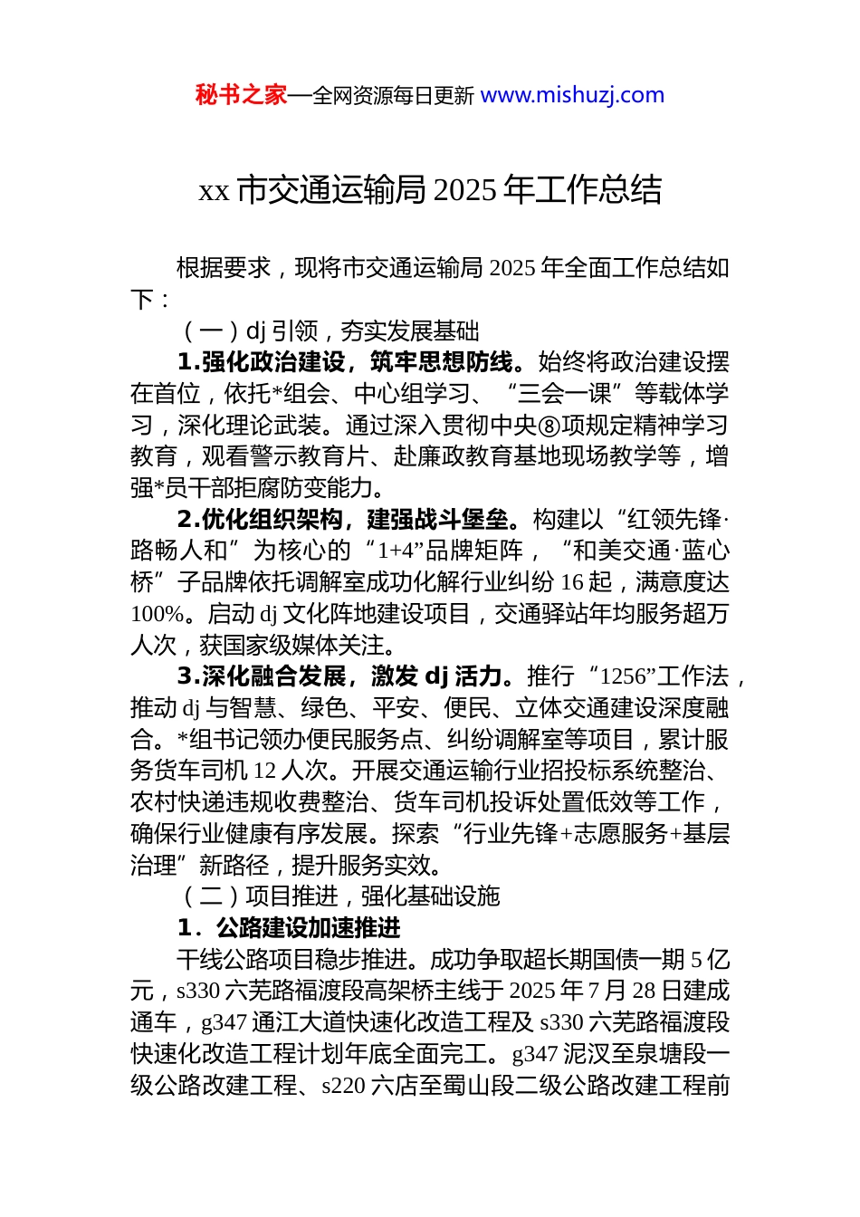 秘书之家—全网资源每日更新 www.mishuzj.comxx 市交通运输局 2025 年工作总结根据要求,现将市交通运输局 2025 年全面工作总结如下:(一)dj 引领,夯实发展基础1.强化政治建设,筑牢思想防线。始终将政治建设摆在首位,依托*组会、中心组学习、“三会一课”等载体学习,深化理论武装。通过深入贯彻中央⑧项规定精神学习教育,观看警示教育片、赴廉政教育基地现场教学等,增强*员干部拒腐防变能力。2.优化组织架构,建强战斗堡垒。构建以“红领先锋·路畅人和”为核心的“1+4”品牌矩阵,“和美交通·蓝心桥”子品牌依托调解室成功化解行业纠纷 16 起,满意度达100%。启动 dj 文化阵地建设项目,交通驿站年均服务超万人次,获国家级媒体关注。3.深化融合发展,激发 dj 活力。推行“1256”工作法,推动 dj 与智慧、绿色、平安、便民、立体交通建设深度融合。*组书记领办便民服务点、纠纷调解室等项目,累计服务货车司机 12 人次。开展交通运输行业招投标系统整治、农村快递违规收费整治、货车司机投诉处置低效等工作,确保行业健康有序发展。探索“行业先锋+志愿服务+基层治理”新路径,提升服务实效。(二)项目推进,强化基础设施1.公路建设加速推进干线公路项目稳步推进。成功争取超长期国债一期 5 亿元,s330 六芜路福渡段高架桥主线于 2025 年 7 月 28 日建成通车,g347 通江大道快速化改造工程及 s330 六芜路福渡段快速化改造工程计划年底全面完工。g347 泥汊至泉塘段一级公路改建工程、s220 六店至蜀山段二级公路改建工程前秘书之家—全网资源每日更新 www.mishuzj.com期工作基本完成,力争 2026 年开工。高速地方协调高效保障。铜商高速 xx 塔桥至巢湖沐集段提前 3 个月通车, 天天高速安庆至 xx 段路基工程完成,预计 12 月建成通车,较原计划提前 6 个月。南九高速和县至 xx 段建设稳步推进,巢黄高速合肥至 xx(石涧)段初步设计通过评审。农村公路建养有序进行。2025 年农村公路提质改造工程 91.2 公里,其中联网路 35.1 公里,双车道项目 6.6 公里,县乡道升级项目 49.5 公里。目前,联网路已全部完工。双车道和县乡道升级项目完工路面工程约 15 公里,完成工程量约 75%。农村公路养护工程约 210 公里,其中我局实施7.567 公里已完成,全市各镇完成工程量约 95%,力争 12 月上旬前完工。2.水运航空齐头并进水运基础设施:启动芜湖港高沟码头多式联运基地建设,配合城投公司做好前期工作。高沟港区疏港公路现状良好,可满足一期工程通行需求。航空基础设施:xx 通用机场选址材料已上报,争取年底前取得军方及民航批复。社稳评估已备案,节能审查已批复,土地预审通过评审待批复,正积极对接申报 2 亿元国防动员资金。3.跨部门协同深化配合发改部门推动北沿江高铁、合芜宣城际铁路、常芜合城际铁路西延等铁路项目纳入上位规划;xx 北外环高速公路预工可报告已上报,正争取纳入省高速公路网规划配合芜湖市交通运输局推动 xx 高速北环线前期工作;配合合肥市做好兆西河一级航道和凤凰颈船闸项目地方性工作。(三)行业管理,提升服务品质1.审批效能显著提升。共受理并办结各类行政审批事项 5922 件,按时办结率 100%。优化审批流程,整合“一件事”集成服务,压缩办理时限 90%以上。深化“一网通办”,线上办件量占比达 80%,减少群众跑动次数约秘书之家—全网资源每日更新 www.mishuzj.com90%。2.公交网络结构优化。开通 xx 至庐江、xx 至巢湖 2 条毗邻公交线路, 延伸镇村公交至张庙、沙湾、黄金坝等 8个村,开通临江街道、新陆路至福渡 2 个村级综合运输物流点,开通福渡、石涧 2 个镇级综合运输服务站,形成跨区域公共交通动脉。无六路公交停泊场、城东公交枢纽相继建成投用,城西公交站完成可行性论证,初步提出迁移方案待报政府审议。启动全市公交网络规划设计,重点优化全市毗邻、城市、城乡、镇村公交线路,着力构建“覆盖广泛、层次分明、换乘便捷”的立体化公交服务体系。3.邮政快递业转型升级。分拣环节实现全域自动化,建成 4 个分拣中心及 6 套自动化设...