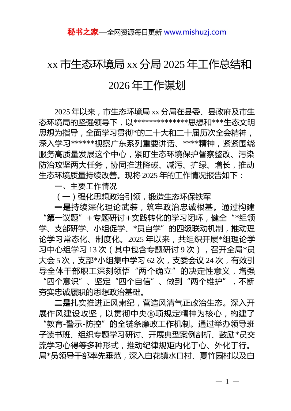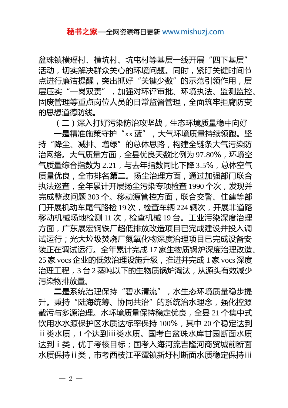 秘书之家—全网资源每日更新 www.mishuzj.comxx 市生态环境局 xx 分局 2025 年工作总结和2026 年工作谋划2025 年以来,市生态环境局 xx 分局在县委、县政府及市生态环境局的坚强领导下,以**************思想和***生态文明思想为指导,全面学习贯彻*的二十大和二十届历次全会精神,深入学习******视察广东系列重要讲话、****精神,紧紧围绕服务高质量发展这个中心,紧盯生态环境保护督察整改、污染防治攻坚两大任务,协同推进降碳、减污、扩绿、增长,推动生态环境质量持续改善。现将 2025 年的工作情况报告如下:一、主要工作情况(一)强化思想政治引领,锻造生态环保铁军一是持续深化理论武装,筑牢政治忠诚根基。通过构建“第一议题”+专题研讨+实践转化的学习闭环,健全“*组领学、支部研学、小组促学、*员自学”的四级联动机制,推动理论学习常态化、制度化。2025 年以来,共组织开展*组理论学习中心组学习 13 次(其中包含专题研讨 9 次),召开全局*员大会 5 次,支部*小组集中学习 62 次,支委会议 24 次,有效引导全体干部职工深刻领悟“两个确立”的决定性意义,增强“四个意识”、坚定“四个自信”、做到“两个维护”,不断夯实忠诚履职的思想政治基础。二是扎实推进正风肃纪,营造风清气正政治生态。深入开展作风建设攻坚,以贯彻中央⑧项规定精神为核心,构建了“教育-警示-防控”的全链条廉政工作机制。通过举办领导班子读书班、组织专题学习研讨、开展典型案例剖析、鼓励*员交流学习心得等多种形式,推动纪律规矩内化于心、外化于行。局*员领导干部率先垂范,深入白花镇水口村、夏竹园村以及白— 1 —秘书之家—全网资源每日更新 www.mishuzj.com盆珠镇横瑶村、横坑村、坑屯村等基层一线开展“四下基层”活动,切实解决群众关心的环境问题。同时,紧盯关键时间节点进行廉洁提醒,突出抓好“关键少数”的示范引领作用,层层压实“一岗双责”,加强对环评审批、环境执法、监测监控、固废管理等重点岗位人员的日常监督管理,全面筑牢拒腐防变的思想道德防线。(二)深入打好污染防治攻坚战,生态环境质量稳中向好一是精准施策守护“xx 蓝”,大气环境质量持续领跑。坚持“降尘、减排、增绿”的总体思路,构建全链条大气污染防治网络。大气质量方面,全县优良天数比例为 97.80%,环境空气质量综合指数为 2.21,与去年指数同比下降 3.5%,总体空气质量优良,全市排名第二。扬尘治理方面,通过加强部门联合执法巡查,全年累计开展扬尘污染专项检查 1990 个次,发现并完成整改问题 303 个。移动源管控方面,联合交警、住建等部门开展机动车尾气路检 19 次,检查车辆 224 辆次,开展非道路移动机械场地检测 11 次,检查机械 19 台。工业污染深度治理方面,广东展宏钢铁厂超低排放改造项目已完成建设并投入调试运行;光大垃圾焚烧厂氮氧化物深度治理项目已完成设备安装正在调试运行。全年累计完成 17 家生物质锅炉深度治理改造、25 家 vocs 企业的低效治理设施升级,推进并完成 1 家 vocs 深度治理工程,3 台 2 蒸吨以下的生物质锅炉淘汰,从源头有效减少污染物排放量。二是系统治理保持“碧水清流”,水生态环境质量稳步提升。秉持“陆海统筹、协同共治”的系统治水理念,强化控源截污与多源治理。水环境质量保持稳定优良,全县 21 个集中式饮用水水源保护区水质达标率保持 100%,其中 20 个稳定达到ⅱ类水质,1 个达到ⅲ类水质。国考白盆珠水库甘园断面水质达到ⅰ类,优于考核目标;国考入海河流吉隆河商贸城前断面水质保持ⅱ类,市考西枝江平潭镇新圩村断面水质稳定保持ⅲ— 2 —秘书之家—全网资源每日更新 www.mishuzj.com类,均达到或优于考核要求。西枝江、沿海诸小河 20 条主要支流的控制断面水质达标率为 90%(18 条达标)。近岸海域国省控监测站位水质全部达到 i 至 ii 类优良标准。重点流域治理方面,吉隆镇水质提升工程(一期)已完成总工程量的 98%;吉隆河流域水环境综合整治(三期:黄埠段)工程已全面完工。农村生活污水治理工作取得决定性进展,2025 年新增完成 98 个自然村...