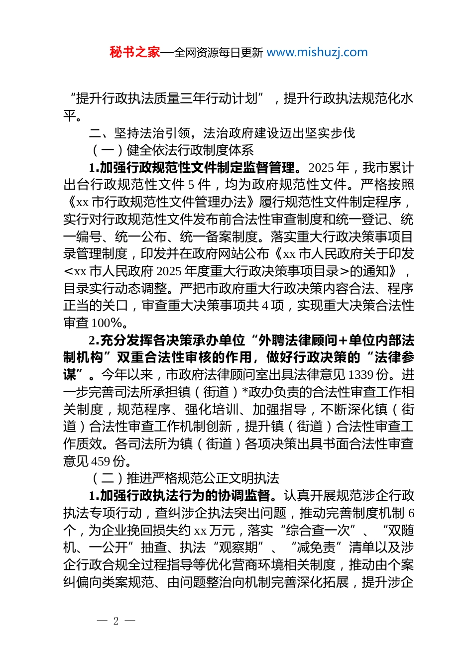 秘书之家—全网资源每日更新 www.mishuzj.comxx 市司法局 2025 年工作总结和 2026 年工作计划2025 年,xx 市司法局在市委、市政府领导下,坚持以**************思想为指导,深入贯彻*的二十大及中央系列会议精神,全面落实***法治思想及对广东重要讲话****精神,对标省委“1310”具体部署与阳江市委“433”安排,着力提升依法行政、优化法律服务、深化普法治理,为全市高质量发展提供坚实的法治保障。现将工作总结如下:一、深入学习贯彻***法治思想,推进法治建设纵深发展(一)落实“第一议题”制度,深入学习贯彻***法治思想。我局落实常态化学习机制、“第一议题”等制度,始终把学习贯彻******系列重要讲话精神作为首要政治任务。通过局*组会议、*组理论学习中心组、*支部“三会一课”学习*的二十大和二十届二中、三中、四中全会精神以及***法治思想,持续增强法治观念,推动各项工作依法有序开展。(二)履行推进法治建设第一责任人职责,靠前指挥确保落地见效。我局*政主要负责人切实履行推进法治建设第一责任人职责,对法治建设重要工作亲自部署、重大问题亲自过问、重点环节亲自协调、重要任务亲自督办。统筹协调推进全面依法治市、严格规范行政执法等各项重点工作,确保法治建设任务落到实处、取得实效。(三)发挥统筹协调职能,推进“一规划两纲要”任务落地落实。发挥市委依法治市办统筹协调职能,推动我市各部门抓好法治建设“一规划两纲要”实施方案各项任务落地落实。按时向市政府报送 2024 年度法治政府建设情况报告,开展 2025年法治政府建设督察,全面抓好法治政府建设各项工作。聚焦— 1 —秘书之家—全网资源每日更新 www.mishuzj.com“提升行政执法质量三年行动计划”,提升行政执法规范化水平。二、坚持法治引领,法治政府建设迈出坚实步伐(一)健全依法行政制度体系1.加强行政规范性文件制定监督管理。2025 年,我市累计出台行政规范性文件 5 件,均为政府规范性文件。严格按照《xx 市行政规范性文件管理办法》履行规范性文件制定程序,实行对行政规范性文件发布前合法性审查制度和统一登记、统一编号、统一公布、统一备案制度。落实重大行政决策事项目录管理制度,印发并在政府网站公布《xx 市人民政府关于印发的通知》,目录实行动态调整。严把市政府重大行政决策内容合法、程序正当的关口,审查重大决策事项共 4 项,实现重大决策合法性审查 100%。2.充分发挥各决策承办单位“外聘法律顾问+单位内部法制机构”双重合法性审核的作用,做好行政决策的“法律参谋”。今年以来,市政府法律顾问室出具法律意见 1339 份。进一步完善司法所承担镇(街道)*政办负责的合法性审查工作相关制度,规范程序、强化培训、加强指导,不断深化镇(街道)合法性审查工作机制创新,提升镇(街道)合法性审查工作质效。各司法所为镇(街道)各项决策出具书面合法性审查意见 459 份。(二)推进严格规范公正文明执法1.加强行政执法行为的协调监督。认真开展规范涉企行政执法专项行动,查纠涉企执法突出问题,推动完善制度机制 6个,为企业挽回损失约 xx 万元,落实“综合查一次”、“双随机、一公开”抽查、执法“观察期”、“减免责”清单以及涉企行政合规全过程指导等优化营商环境相关制度,推动由个案纠偏向类案规范、由问题整治向机制完善深化拓展,提升涉企— 2 —秘书之家—全网资源每日更新 www.mishuzj.com执法效能。持续深化“阳江粤执法”的应用,我市平均网上办案率达到 90%以上。2.提升行政执法规范化水平。强化执法人员培训与管理,落实分类分层分级培训机制,举办行政执法人员综合法律知识培训班。组织行政执法人员约 80 人参加中央组织部、中央依法治国办、司法部以视频连线方式举办的学习贯彻***法治思想强化行政执法能力建设专题培训班,开展 3 期行政执法人员综合法律知识考试执法证考试,考试通过人数 586 人。落实持证上岗制度。2025 年以来,审核办理新证申领《中华人民共和国行政执法证》354 个,目前全市持有有效行政执法证件 1571 个(其中市直部门...