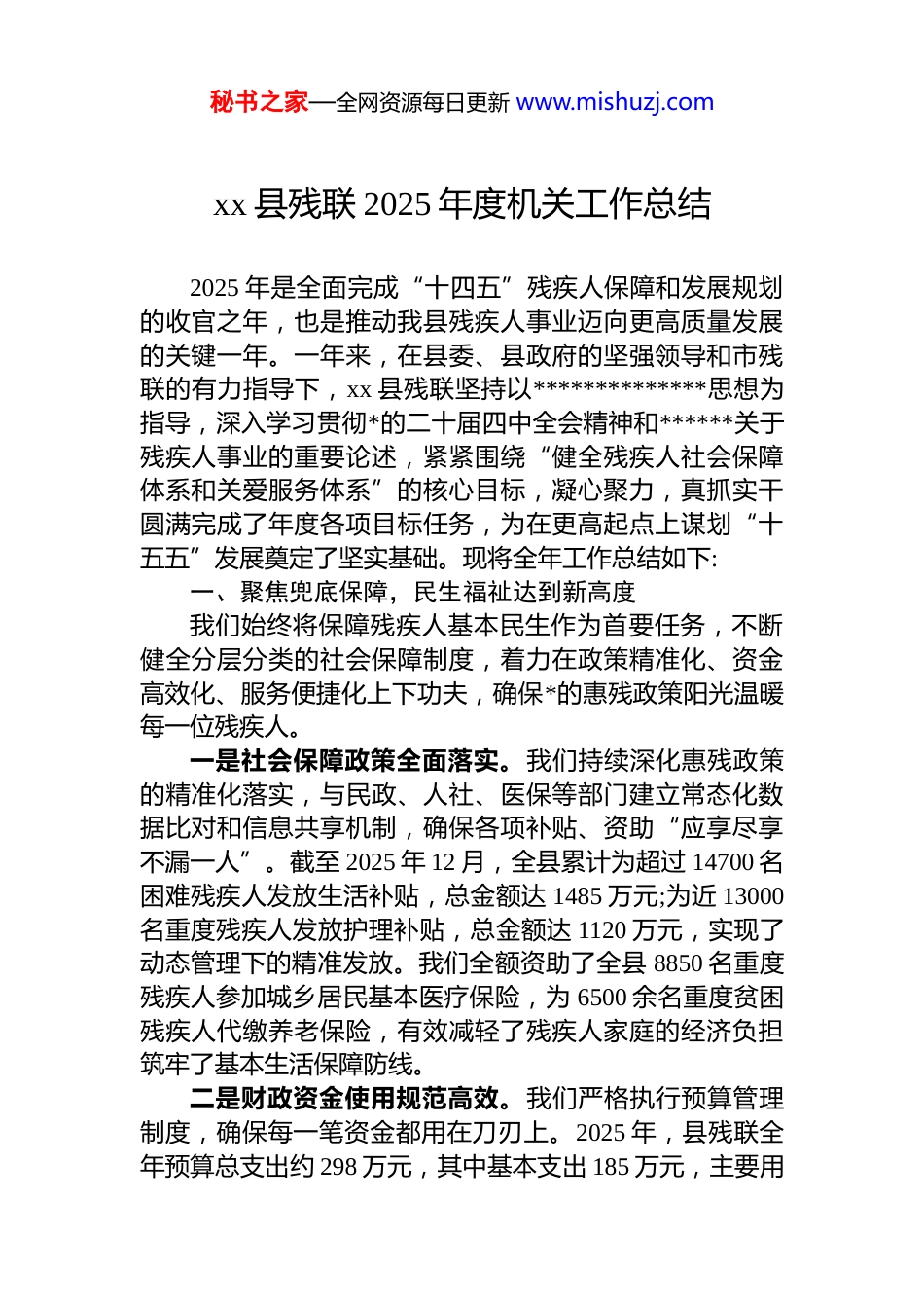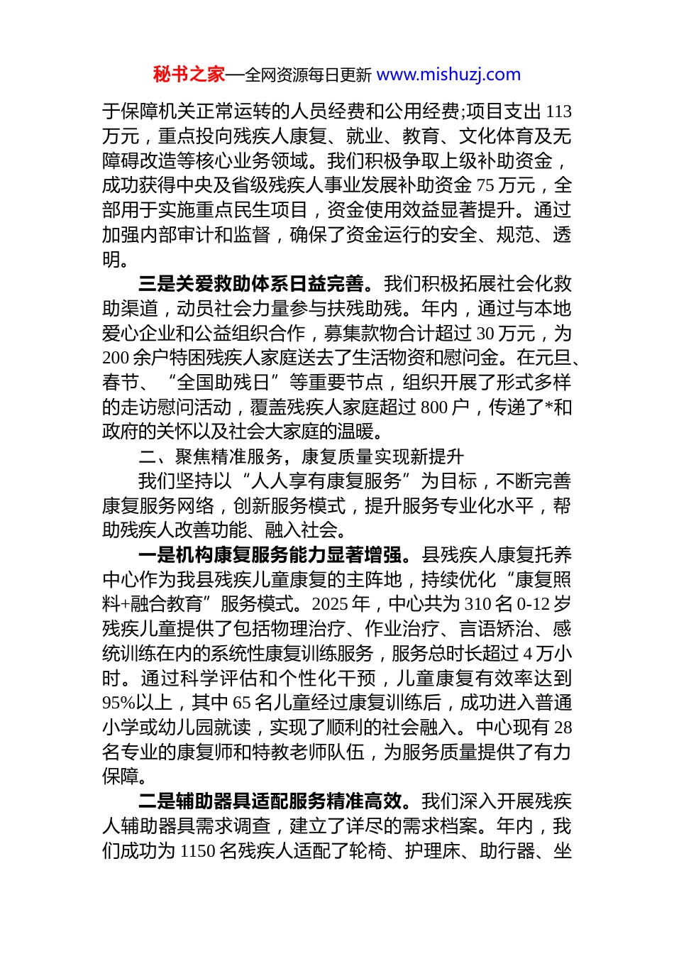 秘书之家—全网资源每日更新 www.mishuzj.comxx 县残联 2025 年度机关工作总结2025 年是全面完成“十四五”残疾人保障和发展规划的收官之年,也是推动我县残疾人事业迈向更高质量发展的关键一年。一年来,在县委、县政府的坚强领导和市残联的有力指导下,xx 县残联坚持以**************思想为指导,深入学习贯彻*的二十届四中全会精神和******关于残疾人事业的重要论述,紧紧围绕“健全残疾人社会保障体系和关爱服务体系”的核心目标,凝心聚力,真抓实干圆满完成了年度各项目标任务,为在更高起点上谋划“十五五”发展奠定了坚实基础。现将全年工作总结如下:一、聚焦兜底保障,民生福祉达到新高度我们始终将保障残疾人基本民生作为首要任务,不断健全分层分类的社会保障制度,着力在政策精准化、资金高效化、服务便捷化上下功夫,确保*的惠残政策阳光温暖每一位残疾人。一是社会保障政策全面落实。我们持续深化惠残政策的精准化落实,与民政、人社、医保等部门建立常态化数据比对和信息共享机制,确保各项补贴、资助“应享尽享不漏一人”。截至 2025 年 12 月,全县累计为超过 14700 名困难残疾人发放生活补贴,总金额达 1485 万元;为近 13000名重度残疾人发放护理补贴,总金额达 1120 万元,实现了动态管理下的精准发放。我们全额资助了全县 8850 名重度残疾人参加城乡居民基本医疗保险,为 6500 余名重度贫困残疾人代缴养老保险,有效减轻了残疾人家庭的经济负担筑牢了基本生活保障防线。二是财政资金使用规范高效。我们严格执行预算管理制度,确保每一笔资金都用在刀刃上。2025 年,县残联全年预算总支出约 298 万元,其中基本支出 185 万元,主要用秘书之家—全网资源每日更新 www.mishuzj.com于保障机关正常运转的人员经费和公用经费;项目支出 113万元,重点投向残疾人康复、就业、教育、文化体育及无障碍改造等核心业务领域。我们积极争取上级补助资金,成功获得中央及省级残疾人事业发展补助资金 75 万元,全部用于实施重点民生项目,资金使用效益显著提升。通过加强内部审计和监督,确保了资金运行的安全、规范、透明。三是关爱救助体系日益完善。我们积极拓展社会化救助渠道,动员社会力量参与扶残助残。年内,通过与本地爱心企业和公益组织合作,募集款物合计超过 30 万元,为200 余户特困残疾人家庭送去了生活物资和慰问金。在元旦、春节、“全国助残日”等重要节点,组织开展了形式多样的走访慰问活动,覆盖残疾人家庭超过 800 户,传递了*和政府的关怀以及社会大家庭的温暖。二、聚焦精准服务,康复质量实现新提升我们坚持以“人人享有康复服务”为目标,不断完善康复服务网络,创新服务模式,提升服务专业化水平,帮助残疾人改善功能、融入社会。一是机构康复服务能力显著增强。县残疾人康复托养中心作为我县残疾儿童康复的主阵地,持续优化“康复照料+融合教育”服务模式。2025 年,中心共为 310 名 0-12 岁残疾儿童提供了包括物理治疗、作业治疗、言语矫治、感统训练在内的系统性康复训练服务,服务总时长超过 4 万小时。通过科学评估和个性化干预,儿童康复有效率达到95%以上,其中 65 名儿童经过康复训练后,成功进入普通小学或幼儿园就读,实现了顺利的社会融入。中心现有 28名专业的康复师和特教老师队伍,为服务质量提供了有力保障。二是辅助器具适配服务精准高效。我们深入开展残疾人辅助器具需求调查,建立了详尽的需求档案。年内,我们成功为 1150 名残疾人适配了轮椅、护理床、助行器、坐秘书之家—全网资源每日更新 www.mishuzj.com便椅等基本型辅助器具。同时,着力提升个性化、高品质辅具的供给能力,为 35 名肢体残疾人量身定制并装配了假肢或矫形器,为 5 名听障儿童验配了数字助听器,有效改善了他们的生活自理能力和参与社会活动的能力。三是社区与居家康复服务广泛覆盖。我们积极探索“机构+社区+家庭”三位一体的康复服务网络,将专业服务延伸至残疾人身边。通过政府购买服务的方式,我们组织康复专家和志愿者团队,为 180 名行动不便的重度残疾人提供了“送康上门”服务,内容涵盖康复...