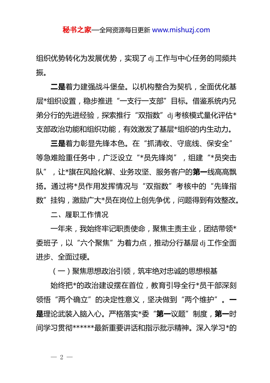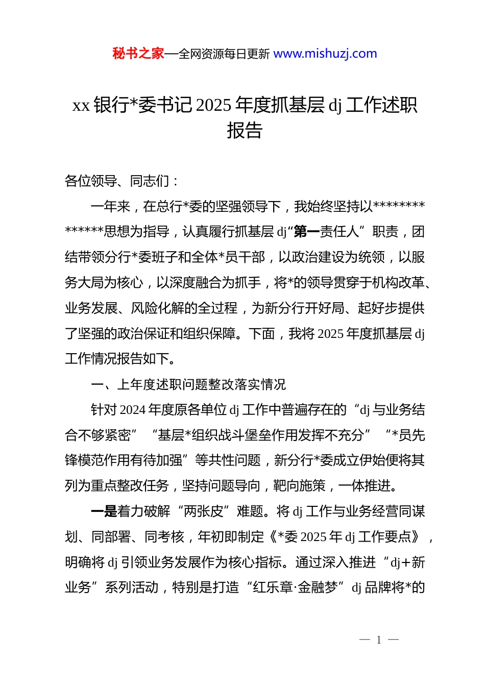 秘书之家—全网资源每日更新 www.mishuzj.comxx 银行*委书记 2025 年度抓基层 dj 工作述职报告各位领导、同志们:一年来,在总行*委的坚强领导下,我始终坚持以**************思想为指导,认真履行抓基层 dj“第一责任人”职责,团结带领分行*委班子和全体*员干部,以政治建设为统领,以服务大局为核心,以深度融合为抓手,将*的领导贯穿于机构改革、业务发展、风险化解的全过程,为新分行开好局、起好步提供了坚强的政治保证和组织保障。下面,我将 2025 年度抓基层 dj工作情况报告如下。一、上年度述职问题整改落实情况针对 2024 年度原各单位 dj 工作中普遍存在的“dj 与业务结合不够紧密”“基层*组织战斗堡垒作用发挥不充分”“*员先锋模范作用有待加强”等共性问题,新分行*委成立伊始便将其列为重点整改任务,坚持问题导向,靶向施策,一体推进。一是着力破解“两张皮”难题。将 dj 工作与业务经营同谋划、同部署、同考核,年初即制定《*委 2025 年 dj 工作要点》,明确将 dj 引领业务发展作为核心指标。通过深入推进“dj+新业务”系列活动,特别是打造“红乐章·金融梦”dj 品牌将*的— 1 —秘书之家—全网资源每日更新 www.mishuzj.com组织优势转化为发展优势,实现了 dj 工作与中心任务的同频共振。二是着力建强战斗堡垒。以机构整合为契机,全面优化基层*组织设置,稳步推进“一支行一支部”目标。借鉴系统内兄弟分行的先进经验,探索推行“双指数”dj 考核模式量化评估*支部政治功能和组织功能,有效激发了基层*组织的内生动力。三是着力彰显先锋本色。在“抓清收、守底线、保安全”等急难险重任务中,广泛设立“*员先锋岗”,组建“*员突击队”,让*旗在风险化解、业务攻坚、服务客户的第一线高高飘扬。通过将*员作用发挥情况与“双指数”考核中的“先锋指数”挂钩,激励广大*员在岗位上创先争优,问题得到有效整改。二、履职工作情况一年来,我始终牢记职责使命,聚焦主责主业,团结带领*委班子,以“六个聚焦”为着力点,推动分行基层 dj 工作全面进步、全面过硬。(一)聚焦思想政治引领,筑牢绝对忠诚的思想根基始终把*的政治建设摆在首位,教育引导全行*员干部深刻领悟“两个确立”的决定性意义,坚决做到“两个维护”。一是理论武装入脑入心。严格落实*委“第一议题”制度,第一时间学习贯彻******最新重要讲话和指示批示精神。深入学习*的— 2 —秘书之家—全网资源每日更新 www.mishuzj.com二十大和二十届历次全会精神,特别是及时组织专题学习研讨,深刻领会二十届四中全会关于十五五规划的重大部署,确保分行战略与中央精神同向同行。二是精神传承走深走实。结合山西实际,持续深入学习贯彻******考察山西重要讲话****精神,引导全员将领袖嘱托转化为服务地方经济社会发展的生动实践。三是作风建设常态长效。扎实开展深入贯彻中央八项规定精神学习教育,组织全员学习《*政机关厉行节约反对浪费条例》等法规,并结合中央通报的典型案例开展警示教育,以案为鉴、以案明纪。牵头打造“心廉太行”廉政文化品牌,推动作风建设内化于心、外化于行,营造了风清气正的政治生态。(二)聚焦服务“国之大者”,增强基层组织的政治功能坚持围绕中心、服务大局,推动基层*组织在服务国家战略和地方发展中彰显价值。一是组织体系全面建强。以机构整合为契机,顺利完成对原三家单位*组织的重组和优化,确保*的组织和工作全覆盖。扎实开展国企 dj 工作规范提升专项行动,严格执行基层*组织按期换届制度,确保组织生活的严肃性和规范性。二是战斗堡垒持续巩固。以全面推进“四强”*支部建设为目标,深入实施“*支部建设提质增效”工程。成功选树了以“红乐章·金融梦”为代表的优秀 dj 品牌,并指导其下设“红帆领航”“合规行远”等五个子品牌,形成了具有 xx 分行特色的— 3 —秘书之家—全网资源每日更新 www.mishuzj.comdj 品牌矩阵,有效提升了基层*组织的凝聚力和战斗力。(三)聚焦*员队伍建设,激发干事创业的内生动力坚持严管与厚爱结合,激励与约束并重,着力锻造一支高素质专业化的*员队伍。一是系统抓好教育培训...