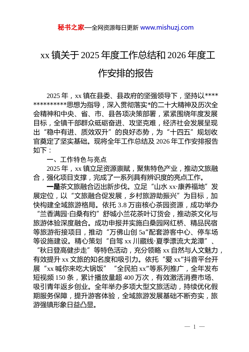 秘书之家—全网资源每日更新 www.mishuzj.comxx 镇关于 2025 年度工作总结和 2026 年度工作安排的报告2025 年,xx 镇在县委、县政府的坚强领导下,坚持以**************思想为指导,深入贯彻落实*的二十大精神及历次全会精神和中央、省、市、县各项决策部署,紧紧围绕年度发展目标,全镇干部群众砥砺奋进、攻坚克难,经济社会发展呈现出“稳中有进、质效双升”的良好态势,为“十四五”规划收官奠定了坚实基础。现将全年工作总结及 2026 年工作安排报告如下:一、工作特色与亮点2025 年,xx 镇立足资源禀赋,聚焦特色产业,推动文旅融合,强化项目支撑,完成了一系列具有辨识度的亮点工作。一是茶文旅融合迈出新步伐。立足“山水 xx·康养福地”发展定位,以“文旅融合促发展,乡村旅游助振兴”为目标,加快构建全域旅游格局。依托 3.8 万亩核心茶园资源,成功举办“兰香满园·白桑有约”舒城小兰花茶叶订货会,推动茶文化与旅游体验深度融合。成功申报并实施白桑园网红桥、精品民宿等旅游衔接项目,推动“万佛山创 5a”配套游客中心、停车场等设施建设。精心策划“自驾 xx 川藏线·夏季漂流大龙潭”、“秋日登高健步走”等特色活动,充分领略 xx 自然与人文魅力,有效提升 xx 文旅的知名度和吸引力。依托“爱 xx”抖音平台开展“xx 喊你来吃大锅饭”“全民拍 xx”等系列推广,全年发布短视频 150 条,累计播放量超 400 万次,有效激活消费市场、吸引青年返乡创业。全年举办多项大型文旅活动,持续优化假期服务保障,提升游客体验,全域旅游发展基础不断夯实,旅游强镇形象日益凸显。— 1 —秘书之家—全网资源每日更新 www.mishuzj.com二是项目建设实现新突破。完成平田乡村振兴农特产品旅游集散中心项目 83 亩土地农转用和 10 户拆迁安置工作,完成xx 镇和岗国防教育试验基地项目 12 亩国有土地收回和 42 亩集体土地农转用工作。全年谋划实施各类项目 50 个,总投资达2916 万元,覆盖基础设施、产业发展、生态保护、民生改善等多个领域。白桑园村旅游接待中心配套设施、胜利生态拦水堰、张田电站升级改造等 6 个投资超百万元的重点项目示范带动效应明显,投资 xx 万元的舒城县 xx 镇交通基础设施改造提升项目极大优化了全镇路网结构,同时,严格规范项目招投标与三级监管,为高质量发展提供了坚实支撑。三是特色产业焕发新生机。2025 年干茶产量 440 吨,总产值达 xx 亿元,名优茶占比超 90%,茶农人均茶叶收入约 xx 元。完成绿色防控茶园 4000 亩,5000 亩高标准茶园建设正在实施,新建良种茶园 2000 亩,新建及改造标准化茶叶加工厂 6000 平方米,茶产业基础进一步夯实。油茶产业持续发展,种植面积达 54910 亩,年理论产油潜力约 xx 万斤。营造林任务有序推进,完成油茶新造林 183.4 亩、低改 4612.4 亩,林下经济发展至3000 余亩,产业效益持续显现。二、工作开展情况(一)聚焦提质增效,经济发展稳中有进今年以来,全镇经济持续稳步运行,发展态势总体平稳。1-10 月,规模以上工业企业实现产值 xx 万元,展现出较强的生产韧性与市场活力;限上企业完成销售额 xx 万元,消费市场逐步恢复;固定资产投资达到 xx 万元,投资结构不断优化,对经济拉动作用显著;招商引资工作成效突出,成功引进茗品家居项目落户开发区,总投资额达 xx 亿元,为区域产业升级注入新动力;营商环境进一步优化,积极落实“千名干部联万企”等服务机制,精准破解企业发展难题,累计帮助企业解决各类诉求 7 件,切实提升企业获得感和满意度;金融服务实体经济能— 2 —秘书之家—全网资源每日更新 www.mishuzj.com力不断增强,提供“政策咨询+项目申报+融资支持”全链条服务,相关部门主动走访市场主体 1438 家次,精准对接融资需求,有效缓解企业资金压力。(二)聚力乡村建设,振兴步伐全面提速脱贫攻坚成果持续巩固。健全防止返贫监测帮扶体系,全镇共有脱贫对象 2449 户 7808 名,其中监测对象共 132 户 366 人,2025 年新识别监测对象 11 户 34 人,全部落实针对性帮扶。在教育、医疗...