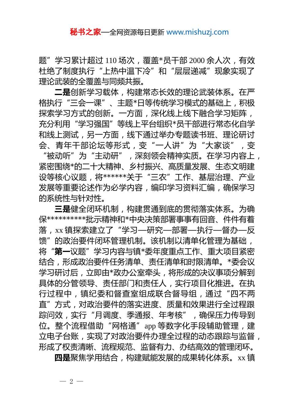 秘书之家—全网资源每日更新 www.mishuzj.comxx 镇关于 2025 年度贯彻落实“第一议题”制度和政治要件闭环落实工作情况的报告2025 年,xx 镇*委坚持以**************思想为根本遵循和行动指南,深入学习贯彻*的二十大及二十届三中、四中全会精神,将严格执行“第一议题”制度和深化政治要件闭环落实作为加强*的政治建设的头等大事与首要政治任务。全镇上下始终将*的政治建设摆在首位,坚持“第一议题”抓学习、“第一遵循”抓贯彻、“第一政治要件”抓落实以高度的政治自觉、思想自觉和行动自觉,推动理论学习与基层治理、经济社会发展深度融合,确保*中央各项决策部署在 xx 镇落地生根、开花结果,为全镇高质量发展提供了坚强有力的政治保证。一、主要工作成效与基本情况2025 年度,xx 镇*委坚决扛起主体责任,将“第一议题”制度和政治要件闭环落实机制作为淬炼政治忠诚、提升政治能力、强化政治担当的核心抓手,构建了系统化、规范化、实效化的工作体系。一是强化顶层设计,构建权责明晰的责任落实体系。镇*委年初即制定印发了《xx 镇*委“第一议题”学习制度实施细则》明确了学习内容、频次、形式和责任主体,构建了由*委书记负总责、班子成员分工负责、*政办公室统筹协调、各基层*支部具体落实、全体*员共同参与的四级联动责任链条。全年共召开*委(扩大)会议 30 次,开展*委理论学习中心组学习 6 期均严格将学习******最新重要讲话和****批示精神作为首要议程,做到第一时间传达学习、第一时间研究部署、第一时间贯彻落实,“第一议题”制度在*委层面落实率达到 100%。同时,该制度向基层*组织全面延伸,全镇各*支部全年开展“第一议— 1 —秘书之家—全网资源每日更新 www.mishuzj.com题”学习累计超过 110 场次,覆盖*员干部 2000 余人次,有效杜绝了制度执行“上热中温下冷”和“层层递减”现象实现了理论武装的全覆盖与同频共振。二是创新学习载体,构建常态长效的理论武装体系。在严格执行“三会一课”、主题*日等传统学习模式的基础上,积极探索学习方式的创新。一方面,深化线上线下融合学习矩阵,充分利用“学习强国”等线上平台组织*员干部进行常态化自学和线上测试,另一方面,线下通过举办专题读书班、理论研讨会、青年干部论坛等形式,变“一人讲”为“大家谈”,变“被动听”为“主动研”,深刻领会精神实质。在学习内容上,紧密围绕*的二十大精神、乡村振兴、高质量发展、生态文明建设等核心议题,将******关于“三农”工作、基层治理、产业发展等重要论述作为必学内容,编印学习资料汇编,确保学习的系统性与针对性。三是健全闭环机制,构建贯通到底的贯彻落实体系。为确保**********批示精神和*中央决策部署事事有回音、件件有着落,xx 镇探索建立了“学习—研究—部署—执行—督办—反馈”的政治要件闭环管理机制。该机制以清单化管理为基础,将“第一议题”学习内容与镇*委年度重点工作、重大项目紧密结合,形成政治要件任务清单、责任清单和时限清单。*委会议学习研讨后,立即由*政办公室牵头,将形成的决议事项分解到具体的分管领导、责任部门和责任人,实行项目化推进。在执行过程中,镇纪委和督查室组成联合督导组,通过“四不两直”方式,对政治要件的落实进度、质量和效果进行全过程跟踪问效,实行“月调度、季通报、年考核”,确保压力传导到位。整个流程借助“网格通”app 等数字化手段辅助管理,建立电子台账,实现了对政治要件办理全过程的动态跟踪与监督,形成了权责清晰、流程规范、监督有力、办结高效的管理闭环。四是聚焦学用结合,构建赋能发展的成果转化体系。xx 镇— 2 —秘书之家—全网资源每日更新 www.mishuzj.com*委始终坚持理论联系实际的马克思主义学风,将“第一议题”学习的落脚点放在解决实际问题、推动高质量发展上。在 dj 引领乡村振兴方面,通过深入学习“千万工程”经验,成功推动了高竹村“白叶一号”茶园等特色产业发展,并积极探索“dj引领+”模式,促进茶产业与旅游、文化产业融合发展,有效带动了村集体经济壮大和农民增收致富。在提升基层治理效能方面,以学习贯彻***法治思想和关于...