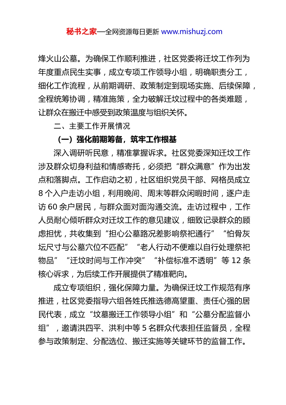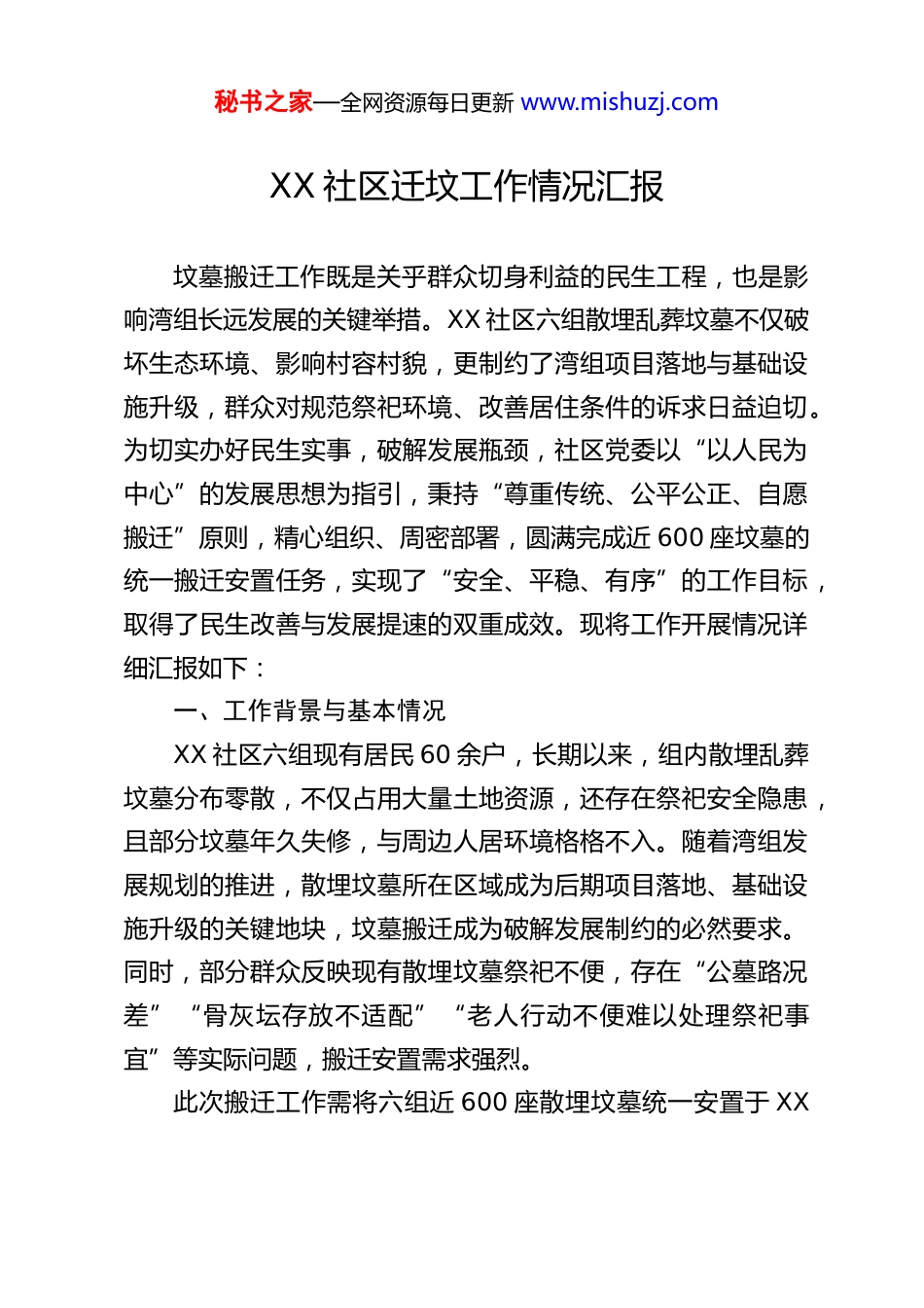 秘书之家—全网资源每日更新 www.mishuzj.comXX 社区迁坟工作情况汇报坟墓搬迁工作既是关乎群众切身利益的民生工程,也是影响湾组长远发展的关键举措。XX 社区六组散埋乱葬坟墓不仅破坏生态环境、影响村容村貌,更制约了湾组项目落地与基础设施升级,群众对规范祭祀环境、改善居住条件的诉求日益迫切。为切实办好民生实事,破解发展瓶颈,社区党委以“以人民为中心”的发展思想为指引,秉持“尊重传统、公平公正、自愿搬迁”原则,精心组织、周密部署,圆满完成近 600 座坟墓的统一搬迁安置任务,实现了“安全、平稳、有序”的工作目标,取得了民生改善与发展提速的双重成效。现将工作开展情况详细汇报如下:一、工作背景与基本情况XX 社区六组现有居民 60 余户,长期以来,组内散埋乱葬坟墓分布零散,不仅占用大量土地资源,还存在祭祀安全隐患,且部分坟墓年久失修,与周边人居环境格格不入。随着湾组发展规划的推进,散埋坟墓所在区域成为后期项目落地、基础设施升级的关键地块,坟墓搬迁成为破解发展制约的必然要求。同时,部分群众反映现有散埋坟墓祭祀不便,存在“公墓路况差”“骨灰坛存放不适配”“老人行动不便难以处理祭祀事宜”等实际问题,搬迁安置需求强烈。此次搬迁工作需将六组近 600 座散埋坟墓统一安置于 XX秘书之家—全网资源每日更新 www.mishuzj.com烽火山公墓。为确保工作顺利推进,社区党委将迁坟工作列为年度重点民生实事,成立专项工作领导小组,明确职责分工,细化工作流程,从前期调研、政策制定到现场实施、后续保障,全程统筹协调,精准施策,全力破解迁坟过程中的各类难题,让群众在搬迁中感受到政策温度与组织关怀。二、主要工作开展情况(一)强化前期筹备,筑牢工作根基深入调研听民意,精准掌握诉求。社区党委深知迁坟工作涉及群众切身利益和情感寄托,必须把“群众满意”作为出发点和落脚点。工作启动之初,社区组织党员干部、网格员成立8 个入户走访小组,利用晚间、周末等群众闲暇时间,逐户走访 60 余户居民,与群众面对面沟通交流。走访过程中,工作人员耐心倾听群众对迁坟工作的意见建议,细致记录群众的顾虑担忧,共收集到“担心公墓路况差影响祭祀通行”“怕骨灰坛尺寸与公墓穴位不匹配”“老人行动不便难以自行处理祭祀物品”“迁坟时间与工作冲突”“补偿标准不透明”等 12 条核心诉求,为后续工作开展提供了精准靶向。成立专项组织,强化保障力量。为确保迁坟工作规范有序推进,社区党委指导六组各姓氏推选德高望重、责任心强的居民代表,成立“坟墓搬迁工作领导小组”和“公墓分配监督小组”,邀请洪四平、洪利中等 5 名群众代表担任监督员,全程参与政策制定、分配选位、搬迁实施等关键环节的监督工作。秘书之家—全网资源每日更新 www.mishuzj.com同时,抽调社区骨干力量、党员志愿者组建政策解读、后勤保障、现场执行等专项工作组,明确各组职责分工,制定详细工作方案和应急预案,形成“党委统筹、分组负责、群众监督、全员参与”的工作格局。细化政策方案,确保公平公正。针对收集到的群众诉求,社区党委多次召开党委会议、居民代表会,反复研讨搬迁政策与补偿标准,主动对接上级民政、自然资源等部门,借鉴其他地区迁坟工作成功经验,结合社区实际,制定《XX 社区六组坟墓搬迁安置实施方案》和《坟墓搬迁补偿标准》。方案明确搬迁范围、安置地点、补偿标准、选位规则、时间节点等关键内容,其中补偿标准严格按照上级相关规定执行,分为坟墓迁移费、骨灰坛购置补贴、祭祀物品搬运费等项目,确保公开透明、公平合理。同时,针对群众关心的骨灰坛适配问题,工作人员提前前往 XX 烽火山公墓实测穴位尺寸,联系正规厂家定制统一规格的陶瓷骨灰坛;针对公墓路况问题,协调相关部门对公墓通行道路进行平整修缮,增设标识标牌,保障祭祀通行便捷安全。(二)坚持民主公开,规范分配流程“迁坟讲究‘入土为安’,公墓分配是否公平公正,直接关系到群众的信任度和工作的推进效率。”社区党委始终将公平公开贯穿公墓分配全过程,让群众全程参与、全程监督。提前公示,保障知情权。分配工作启动前,社区将 XX 烽...