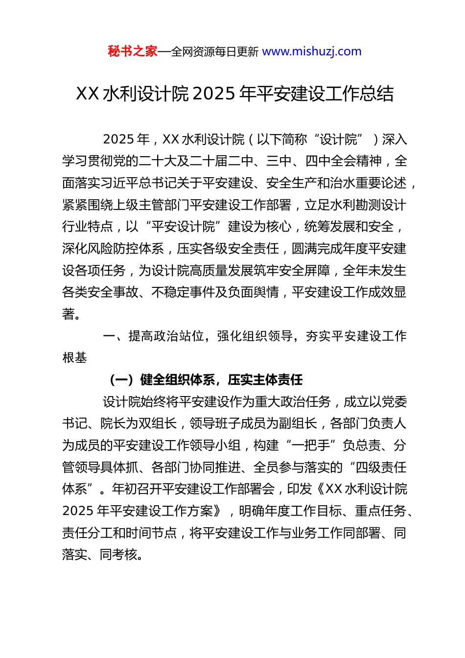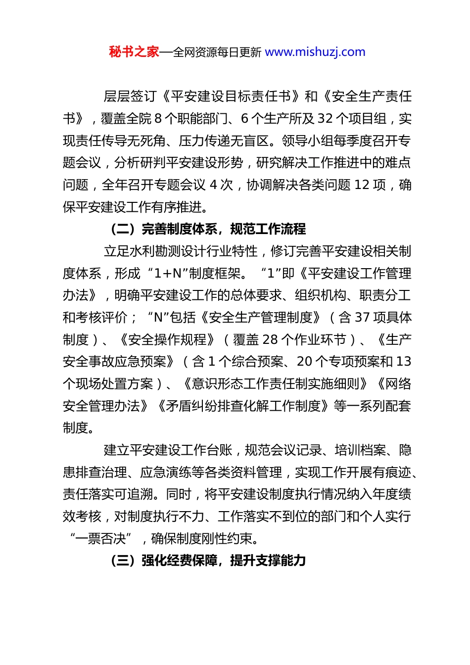 秘书之家—全网资源每日更新 www.mishuzj.comXX 水利设计院 2025 年平安建设工作总结2025 年,XX 水利设计院(以下简称“设计院”)深入学习贯彻党的二十大及二十届二中、三中、四中全会精神,全面落实习近平总书记关于平安建设、安全生产和治水重要论述,紧紧围绕上级主管部门平安建设工作部署,立足水利勘测设计行业特点,以“平安设计院”建设为核心,统筹发展和安全,深化风险防控体系,压实各级安全责任,圆满完成年度平安建设各项任务,为设计院高质量发展筑牢安全屏障,全年未发生各类安全事故、不稳定事件及负面舆情,平安建设工作成效显著。一、提高政治站位,强化组织领导,夯实平安建设工作根基(一)健全组织体系,压实主体责任设计院始终将平安建设作为重大政治任务,成立以党委书记、院长为双组长,领导班子成员为副组长,各部门负责人为成员的平安建设工作领导小组,构建“一把手”负总责、分管领导具体抓、各部门协同推进、全员参与落实的“四级责任体系”。年初召开平安建设工作部署会,印发《XX 水利设计院2025 年平安建设工作方案》,明确年度工作目标、重点任务、责任分工和时间节点,将平安建设工作与业务工作同部署、同落实、同考核。秘书之家—全网资源每日更新 www.mishuzj.com层层签订《平安建设目标责任书》和《安全生产责任书》,覆盖全院 8 个职能部门、6 个生产所及 32 个项目组,实现责任传导无死角、压力传递无盲区。领导小组每季度召开专题会议,分析研判平安建设形势,研究解决工作推进中的难点问题,全年召开专题会议 4 次,协调解决各类问题 12 项,确保平安建设工作有序推进。(二)完善制度体系,规范工作流程立足水利勘测设计行业特性,修订完善平安建设相关制度体系,形成“1+N”制度框架。“1”即《平安建设工作管理办法》,明确平安建设工作的总体要求、组织机构、职责分工和考核评价;“N”包括《安全生产管理制度》(含 37 项具体制度)、《安全操作规程》(覆盖 28 个作业环节)、《生产安全事故应急预案》(含 1 个综合预案、20 个专项预案和 13个现场处置方案)、《意识形态工作责任制实施细则》《网络安全管理办法》《矛盾纠纷排查化解工作制度》等一系列配套制度。建立平安建设工作台账,规范会议记录、培训档案、隐患排查治理、应急演练等各类资料管理,实现工作开展有痕迹、责任落实可追溯。同时,将平安建设制度执行情况纳入年度绩效考核,对制度执行不力、工作落实不到位的部门和个人实行“一票否决”,确保制度刚性约束。(三)强化经费保障,提升支撑能力秘书之家—全网资源每日更新 www.mishuzj.com加大平安建设经费投入,2025 年累计投入专项经费 86万元,用于安全设施升级、教育培训、应急物资储备、隐患排查治理等工作。其中,投入 32 万元更新外业勘测设备安全防护装置、办公区消防设施和监控系统;投入 21 万元用于安全培训、应急演练和宣传教育;投入 18 万元储备防汛抢险、医疗急救、火灾逃生等应急物资;投入 15 万元用于隐患排查治理和第三方安全评估,为平安建设工作提供坚实的经费保障。二、聚焦重点领域,深化风险防控,筑牢平安建设安全防线(一)强化安全生产管理,防范化解行业安全风险秉持“安全第一、预防为主、综合治理”的方针,以安全生产标准化建设为抓手,全面提升安全生产管理水平。1.深化“双重预防”机制建设。采用 LEC 评价法,对办公区、档案室、试验室、外业勘测现场、项目设代组等重点区域开展全面的危险源辨识,共辨识危险源 126 项,其中重大危险源 8 项,逐一制定风险防控措施,明确分级管控责任人,按季度进行动态更新。建立隐患排查治理闭环管理机制,开展日常检查、专项检查、季节性检查和节假日检查共 28 次,各部门自查 312 次,排查各类隐患 46 项,其中一般隐患 42 项、较大隐患 4 项,全部完成整改,整改率 100%,未发生重大安全隐患。2.规范外业勘测安全管理。针对水利勘测外业作业点多、秘书之家—全网资源每日更新 www.mishuzj.com面广、环境复杂的特点,制定《外业勘测安全管理细则》,要求每个外业组配备专职安全员...