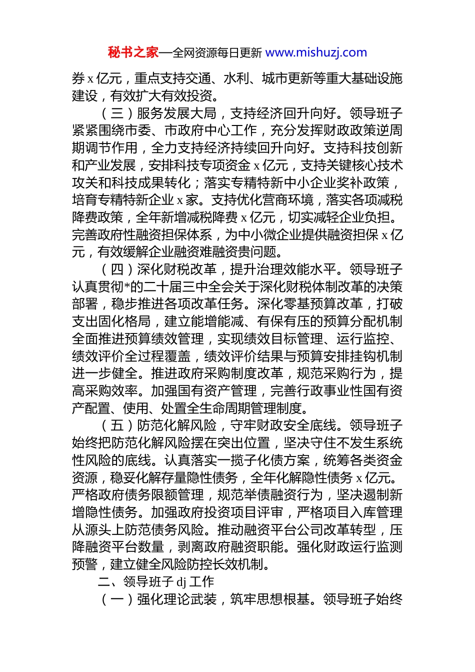 秘书之家—全网资源每日更新 www.mishuzj.com财政局领导班子 2025 年工作总结2025 年是“十四五”规划收官之年,也是谋划“十五五”发展的关键之年。一年来,市财政局领导班子坚持以**************思想为指导,全面贯彻*的二十大和二十届三中、四中全会精神,深入落实中央经济工作会议和全国财政工作会议部署,在市委、市政府的坚强领导下,团结带领全局干部职工,坚持稳中求进工作总基调,实施更加积极的财政政策,统筹抓好组织收入、优化支出、深化改革、防范风险等各项工作,较好完成了全年目标任务,为全市经济社会高质量发展提供了坚实财政保障。现将领导班子 2025 年度工作情况报告如下。一、领导班子年度重点工作(一)强化收入组织,确保财政平稳运行。领导班子始终把组织收入作为首要任务,定期分析研判财政经济形势,加强收入调度和税源监控。坚持依法征收、应收尽收强化非税收入管理,规范收入征缴秩序。加强与税务部门的协调配合,建立健全信息共享和联合分析机制,准确掌握税源变化情况。全年一般公共预算收入完成 x 亿元,同比增长 x%,圆满完成年度预算目标。其中税收收入占比达到x%,收入质量持续提升,财政运行总体平稳。(二)优化支出结构,保障重点领域需求。领导班子牢固树立过紧日子思想,大力压减非急需非刚性支出,把有限的财政资金用在刀刃上。严格落实“三保”支出在财政支出中的优先地位,足额保障基层工资发放、机构运转和基本民生。加大对教育、医疗、社保、就业等民生领域投入,民生支出占一般公共预算支出的比重达到 x%。支持实施消费品以旧换新政策,安排专项资金 x 亿元,有效拉动消费增长。统筹用好政府债券资金,全年发行新增政府债秘书之家—全网资源每日更新 www.mishuzj.com券 x 亿元,重点支持交通、水利、城市更新等重大基础设施建设,有效扩大有效投资。(三)服务发展大局,支持经济回升向好。领导班子紧紧围绕市委、市政府中心工作,充分发挥财政政策逆周期调节作用,全力支持经济持续回升向好。支持科技创新和产业发展,安排科技专项资金 x 亿元,支持关键核心技术攻关和科技成果转化;落实专精特新中小企业奖补政策,培育专精特新企业 x 家。支持优化营商环境,落实各项减税降费政策,全年新增减税降费 x 亿元,切实减轻企业负担。完善政府性融资担保体系,为中小微企业提供融资担保 x 亿元,有效缓解企业融资难融资贵问题。(四)深化财税改革,提升治理效能水平。领导班子认真贯彻*的二十届三中全会关于深化财税体制改革的决策部署,稳步推进各项改革任务。深化零基预算改革,打破支出固化格局,建立能增能减、有保有压的预算分配机制全面推进预算绩效管理,实现绩效目标管理、运行监控、绩效评价全过程覆盖,绩效评价结果与预算安排挂钩机制进一步健全。推进政府采购制度改革,规范采购行为,提高采购效率。加强国有资产管理,完善行政事业性国有资产配置、使用、处置全生命周期管理制度。(五)防范化解风险,守牢财政安全底线。领导班子始终把防范化解风险摆在突出位置,坚决守住不发生系统性风险的底线。认真落实一揽子化债方案,统筹各类资金资源,稳妥化解存量隐性债务,全年化解隐性债务 x 亿元。严格政府债务限额管理,规范举债融资行为,坚决遏制新增隐性债务。加强政府投资项目评审,严格项目入库管理从源头上防范债务风险。推动融资平台公司改革转型,压降融资平台数量,剥离政府融资职能。强化财政运行监测预警,建立健全风险防控长效机制。二、领导班子 dj 工作(一)强化理论武装,筑牢思想根基。领导班子始终秘书之家—全网资源每日更新 www.mishuzj.com把政治建设摆在首位,坚持用**************思想凝心铸魂。严格落实“第一议题”制度,及时跟进学习******最新重要讲话和****批示精神,全年组织*组理论学习中心组集中学习 x 次。深入学习贯彻*的二十届三中、四中全会精神,组织开展专题研讨 x 次,撰写学习心得体会 x 篇。扎实开展深入贯彻中央八项规定精神学习教育,组织*员干部认真学习《***关于加强*的作风建设论述摘编》,对照检视问题,抓好整改落实。持续巩固拓展 dj...