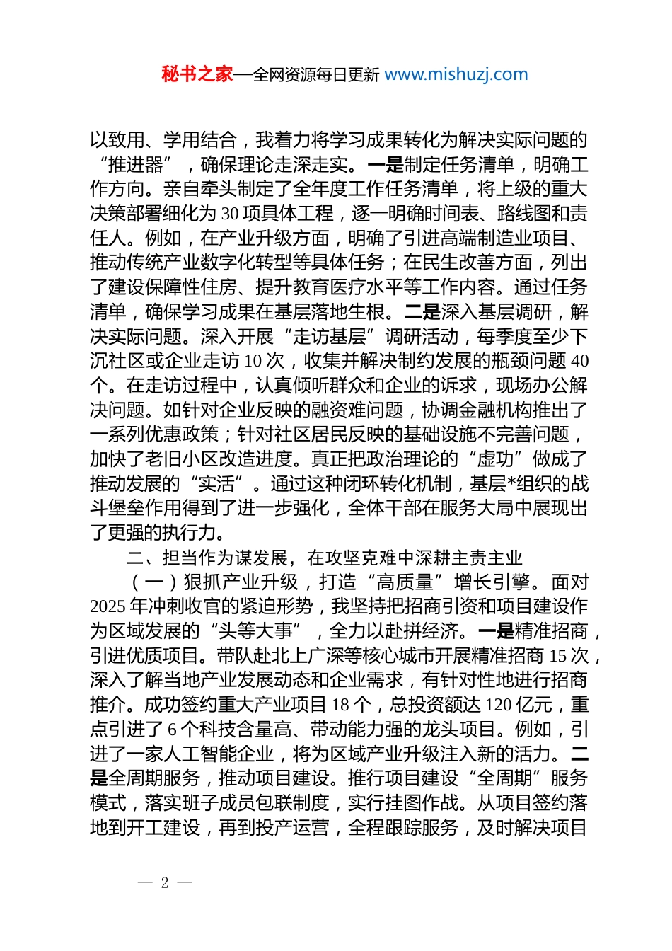 秘书之家—全网资源每日更新 www.mishuzj.com*工委书记述职述廉述学述法报告2025 年是各项工作目标任务的决胜收官之年,也是推进高质量发展的关键冲刺期。作为*工委书记,在过去的一年中,我始终坚持以**************思想为指引,在上级*委、政府的坚强领导下,认真履行“第一责任人”职责,统筹抓好理论学习、经济发展、廉政建设与法治保障。通过一年的努力,我所在的区域在产业转型、民生改善、社会治理等方面均取得了显著成效。现将本人一年来述职、述廉、述学、述法情况汇报如下。一、持之以恒强*性,在学思践悟中筑牢思想根基(一)深化理论武装,推行“常态化”学习机制。我始终把政治理论学习作为提升履职能力的“金钥匙”,坚持带头学、带动学,确保思想行动始终同*中央保持高度一致。一是完善学习制度,引领学习风尚。建立健全*工委理论学习中心组集体学习制度,全年主持开展集中学习 20 次,专题研讨 12 次。每次学习都精心安排主题,重点深入学习*的创新理论以及上级关于高质量发展的最新要求。在学习过程中,鼓励班子成员积极发言,分享学习心得,形成了良好的学习氛围。二是创新学习方式,扩大学习覆盖。利用“云端课堂”和线下红色教育基地相结合的方式,组织全区*员干部开展多层次、全覆盖的轮训。“云端课堂”邀请专家学者进行线上授课,方便*员干部随时随地学习;线下红色教育基地则让*员干部亲身感受革命先辈的奋斗精神,增强学习的感染力。累计培训 2500 人次,使广大*员干部深刻领会了*的理论精髓。通过学习,我深刻领会了“两个确立”的决定性意义,增强了“四个意识”、坚定了“四个自信”、做到了“两个维护”,在复杂局面下的政治判断力和执行力得到了显著提升。(二)感悟思想伟力,落实“清单化”转化路径。坚持学— 1 —秘书之家—全网资源每日更新 www.mishuzj.com以致用、学用结合,我着力将学习成果转化为解决实际问题的“推进器”,确保理论走深走实。一是制定任务清单,明确工作方向。亲自牵头制定了全年度工作任务清单,将上级的重大决策部署细化为 30 项具体工程,逐一明确时间表、路线图和责任人。例如,在产业升级方面,明确了引进高端制造业项目、推动传统产业数字化转型等具体任务;在民生改善方面,列出了建设保障性住房、提升教育医疗水平等工作内容。通过任务清单,确保学习成果在基层落地生根。二是深入基层调研,解决实际问题。深入开展“走访基层”调研活动,每季度至少下沉社区或企业走访 10 次,收集并解决制约发展的瓶颈问题 40个。在走访过程中,认真倾听群众和企业的诉求,现场办公解决问题。如针对企业反映的融资难问题,协调金融机构推出了一系列优惠政策;针对社区居民反映的基础设施不完善问题,加快了老旧小区改造进度。真正把政治理论的“虚功”做成了推动发展的“实活”。通过这种闭环转化机制,基层*组织的战斗堡垒作用得到了进一步强化,全体干部在服务大局中展现出了更强的执行力。二、担当作为谋发展,在攻坚克难中深耕主责主业(一)狠抓产业升级,打造“高质量”增长引擎。面对2025 年冲刺收官的紧迫形势,我坚持把招商引资和项目建设作为区域发展的“头等大事”,全力以赴拼经济。一是精准招商,引进优质项目。带队赴北上广深等核心城市开展精准招商 15 次,深入了解当地产业发展动态和企业需求,有针对性地进行招商推介。成功签约重大产业项目 18 个,总投资额达 120 亿元,重点引进了 6 个科技含量高、带动能力强的龙头项目。例如,引进了一家人工智能企业,将为区域产业升级注入新的活力。二是全周期服务,推动项目建设。推行项目建设“全周期”服务模式,落实班子成员包联制度,实行挂图作战。从项目签约落地到开工建设,再到投产运营,全程跟踪服务,及时解决项目— 2 —秘书之家—全网资源每日更新 www.mishuzj.com推进过程中遇到的问题。今年以来,全区 35 个重点项目均按计划顺利推进,部分项目已提前投产,为区域经济增长提供了有力支撑。(二)改善民生福祉,构建“温情化”治理格局。始终坚持以人民为中心的发展思想,把改善民生作为工作的出发点和落脚点,努力提升群众...