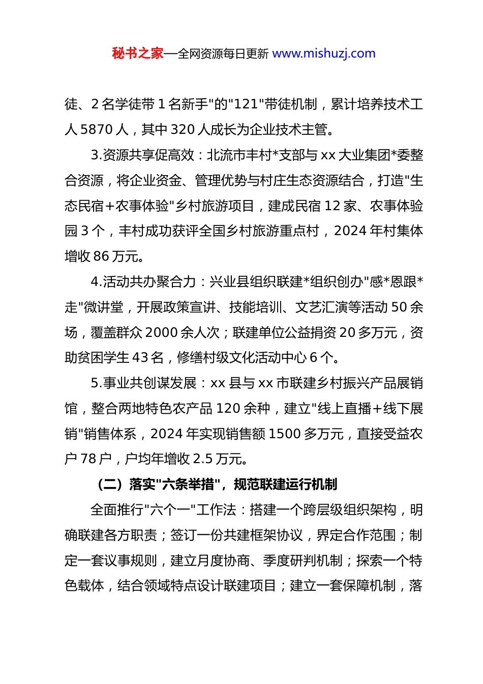 秘书之家—全网资源每日更新 www.mishuzj.comxx 市探索 dj 联建共建机制 提升基层 dj整体效能一、实施背景为深入贯彻新时代*的建设总要求,破解基层 dj"各自为战"、资源分散等难题,xx 市围绕服务保障经济社会高质量发展 , 将 dj 联 建 共 建 作 为 基 层 dj 专 项 攻 坚 任 务 , 创 新 推行"567"工作模式,重点培育北流市丰村—xx 大业集团、xx县—xx 市边界镇等联建联合体,推动基层 dj 与产业发展、基层治理、乡村振兴深度融合,全面提升基层 dj 整体效能。二、主要做法及成效(一)聚焦"五项内容",构建联建核心框架1.组织共建强根基:打破行政壁垒和行业界限,建立跨区域、跨行业"功能型"*组织 212 个。其中 xx 县文地镇与 xxxx市高桥镇签订《边界 dj 联建协议》,组建联合*支部,开展治安联防、矛盾联调、产业联兴,全年联合化解边界矛盾纠纷 37起,查处跨界治安案件 12 起,实现边界零重大冲突。2.队伍共育提素质:推行"政企校"三方共育模式,福绵区依托服装产业优势,由政府搭台、企业出题、院校授课,打造"福绵裁缝"技能培训基地,创新"1 名技术骨干带 2 名学秘书之家—全网资源每日更新 www.mishuzj.com徒、2 名学徒带 1 名新手"的"121"带徒机制,累计培养技术工人 5870 人,其中 320 人成长为企业技术主管。3.资源共享促高效:北流市丰村*支部与 xx 大业集团*委整合资源,将企业资金、管理优势与村庄生态资源结合,打造"生态民宿+农事体验"乡村旅游项目,建成民宿 12 家、农事体验园 3 个,丰村成功获评全国乡村旅游重点村,2024 年村集体增收 86 万元。4.活动共办聚合力:兴业县组织联建*组织创办"感*恩跟*走"微讲堂,开展政策宣讲、技能培训、文艺汇演等活动 50 余场,覆盖群众 2000 余人次;联建单位公益捐资 20 多万元,资助贫困学生 43 名,修缮村级文化活动中心 6 个。5.事业共创谋发展:xx 县与 xx 市联建乡村振兴产品展销馆,整合两地特色农产品 120 余种,建立"线上直播+线下展销"销售体系,2024 年实现销售额 1500 多万元,直接受益农户 78 户,户均年增收 2.5 万元。(二)落实"六条举措",规范联建运行机制全面推行"六个一"工作法:搭建一个跨层级组织架构,明确联建各方职责;签订一份共建框架协议,界定合作范围;制定一套议事规则,建立月度协商、季度研判机制;探索一个特色载体,结合领域特点设计联建项目;建立一套保障机制,落秘书之家—全网资源每日更新 www.mishuzj.com实经费、场地等保障;形成一套评价体系,将联建成效纳入 dj考核,确保联建工作常态长效。(三)创新"七种模式",拓展联建覆盖领域根据不同领域特点,因地制宜推行七种联建模式:乡村振兴型聚焦产业增收,基层治理型强化矛盾化解,项目牵引型保障重大项目推进,产业链接型推动产业链协同,商圈联动型优化营商环境,毗邻协作型破解跨界治理难题,飞地抱团型促进薄弱村增收,实现联建工作与中心工作同频共振。三、经验启示1.dj 联建必须坚持 dj 统领,把*的政治优势、组织优势转化为发展优势,确保联建工作方向不偏。2.必须坚持优势互补,找准联建各方需求契合点,实现资源共享、优势叠加,避免"一头热"。3.必须坚持问题导向,聚焦基层治理、产业发展等难点问题设计联建载体,确保联建工作实效可见。4.必须坚持群众满意,把增进民生福祉作为出发点和落脚点,让群众在联建工作中感受变化、得到实惠。xx 县 xx 镇以"聚能先锋"dj 联建 推动地企融合高质量发展秘书之家—全网资源每日更新 www.mishuzj.com一、实施背景xx 镇作为 xx 县煤电产业核心区,华能核桃峪煤矿、华能xx 电厂等重点企业集聚,近年来因产业开发面临征迁安置、民生保障、安全稳定等突出问题。为破解"企业发展与地方建设两张皮 "难题,镇 *委 以 "聚能 先锋 "dj 品牌 为 引领 ,创新 构建"1+3+3+1"dj 联建机制,推动地企*组织深度融合,实现企业发展与乡村振兴互利共赢。二、主要做法及成效(一)建强组织体系,织密联建"红色网络"创新构建"1 个联合*委+3 支*员先锋队+3 项联建制度+1个评...