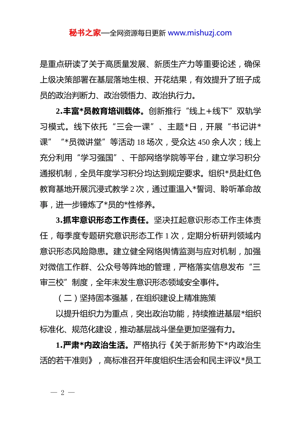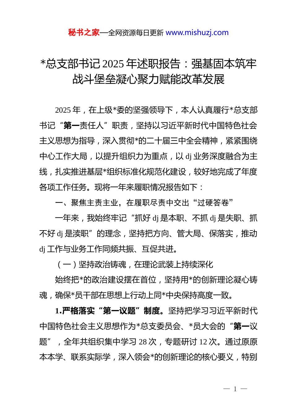 秘书之家—全网资源每日更新 www.mishuzj.com*总支部书记 2025 年述职报告:强基固本筑牢战斗堡垒凝心聚力赋能改革发展2025 年,在上级*委的坚强领导下,本人认真履行*总支部书记“第一责任人”职责,坚持以习近平新时代中国特色社会主义思想为指导,深入贯彻*的二十届三中全会精神,紧紧围绕中心工作大局,以提升组织力为重点,以 dj 业务深度融合为主线,扎实推进基层*组织标准化规范化建设,较好地完成了年度各项工作任务。现将一年来履职情况报告如下:一、聚焦主责主业,在履职尽责中交出“过硬答卷”一年来,我始终牢记“抓好 dj 是本职、不抓 dj 是失职、抓不好 dj 是渎职”的理念,坚持把方向、管大局、保落实,推动dj 工作与业务工作同频共振、互促共进。(一)坚持政治铸魂,在理论武装上持续深化始终把*的政治建设摆在首位,坚持用*的创新理论凝心铸魂,确保*员干部在思想上行动上同*中央保持高度一致。1.严格落实“第一议题”制度。坚持把学习习近平新时代中国特色社会主义思想作为*总支委员会、*员大会的“第一议题”,全年共组织集中学习 28 次,专题研讨 12 次。通过原原本本学、联系实际学,深入领会*的创新理论的核心要义,特别— 1 —秘书之家—全网资源每日更新 www.mishuzj.com是重点研读了关于高质量发展、新质生产力等重要论述,确保上级决策部署在基层落地生根、开花结果,有效提升了班子成员的政治判断力、政治领悟力、政治执行力。2.丰富*员教育培训载体。创新推行“线上+线下”双轨学习模式。线下依托“三会一课”、主题*日,开展“书记讲*课”“*员微讲堂”等活动 18 场次,受众达 450 余人次;线上充分利用“学习强国”、干部网络学院等平台,建立学习积分通报机制,全员年度学习积分均达到规定要求。组织*员赴红色教育基地开展沉浸式教学 2 次,通过重温入*誓词、聆听革命故事,进一步锤炼了*员的*性修养。3.抓牢意识形态工作责任。坚决扛起意识形态工作主体责任,每季度专题研究意识形态工作 1 次,定期分析研判领域内意识形态风险隐患。建立健全网络舆情监测与应对机制,加强对微信工作群、公众号等阵地的管理,严格落实信息发布“三审三校”制度,全年未发生意识形态领域安全事件。(二)坚持固本强基,在组织建设上精准施策以提升组织力为重点,突出政治功能,持续推进基层*组织标准化、规范化建设,推动基层战斗堡垒更加坚强有力。1.严肃*内政治生活。严格执行《关于新形势下*内政治生活的若干准则》,高标准召开年度组织生活会和民主评议*员工— 2 —秘书之家—全网资源每日更新 www.mishuzj.com作。本人带头以普通*员身份参加所在支部组织生活,并在会上带头开展批评与自我批评,直面问题、辣味十足,达到了“红脸出汗、排毒治病”的效果。全年各支部召开支委会、*员大会、*小组会等到会率均在 98%以上,*内政治生活的政治性、时代性、原则性、战斗性显著增强。2.规范*员队伍管理。严格按照“控制总量、优化结构、提高质量、发挥作用”的总要求,严把*员“入口关”。2025 年共确定入*积极分子 5 名,发展预备*员 3 名,按期转正 2 名,重点向业务骨干、科研一线和青年人才倾斜。建立了*员“政治生日”制度,通过赠送一张贺卡、重温一次誓词、进行一次谈话,增强*员的归属感和荣誉感。同时,做好*费收缴使用管理工作,确保*费足额、按时、规范上缴。3.推进 dj 品牌创建。结合单位行业特点,深入开展“一支部一品牌”创建活动。指导下属*支部打造了“红色先锋岗”“服务零距离”等特色 dj 品牌 3 个。其中,“红色智囊团”项目通过汇聚*员骨干力量,攻克了技术难题 4 项,实现了 dj 工作与业务发展的良性互动,被上级*委评为“年度优秀 dj 创新案例”。(三)坚持融合赋能,在推动发展上攻坚克难牢固树立“围绕发展抓 dj、抓好 dj 促发展”的工作思路,— 3 —秘书之家—全网资源每日更新 www.mishuzj.com积极探索“dj+”工作模式,引导*员干部在急难险重任务中当先锋、打头阵。1.深化“dj+重点项目”机制。围绕年度核心业务指标和重点工程项目,组建了 4 支“*员突击队”和 6 个...