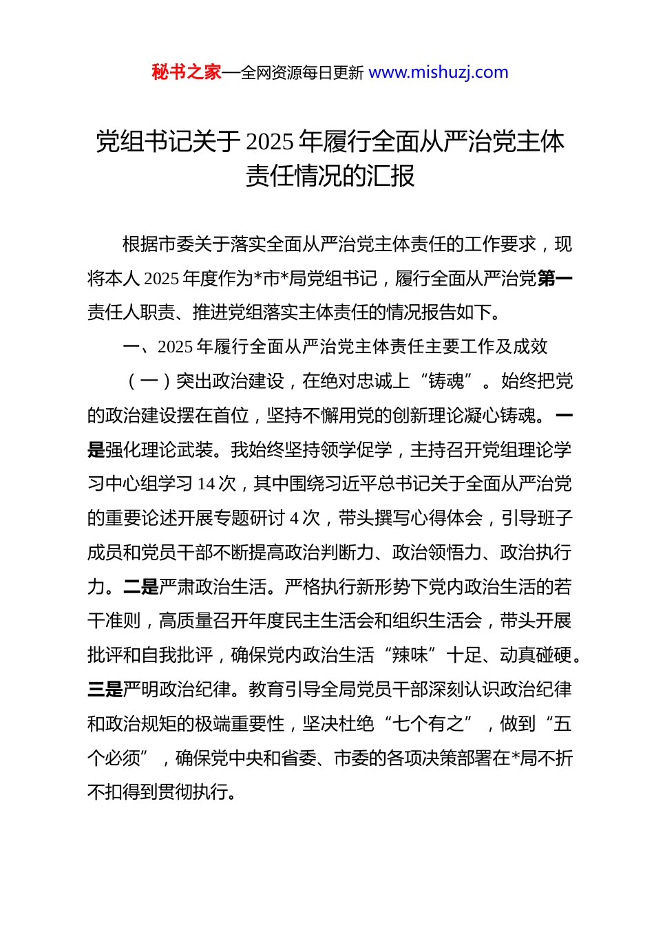 秘书之家—全网资源每日更新 www.mishuzj.com党组书记关于 2025 年履行全面从严治党主体责任情况的汇报 根据市委关于落实全面从严治党主体责任的工作要求,现将本人 2025 年度作为*市*局党组书记,履行全面从严治党第一责任人职责、推进党组落实主体责任的情况报告如下。一、2025 年履行全面从严治党主体责任主要工作及成效(一)突出政治建设,在绝对忠诚上“铸魂”。始终把党的政治建设摆在首位,坚持不懈用党的创新理论凝心铸魂。一是强化理论武装。我始终坚持领学促学,主持召开党组理论学习中心组学习 14 次,其中围绕习近平总书记关于全面从严治党的重要论述开展专题研讨 4 次,带头撰写心得体会,引导班子成员和党员干部不断提高政治判断力、政治领悟力、政治执行力。二是严肃政治生活。严格执行新形势下党内政治生活的若干准则,高质量召开年度民主生活会和组织生活会,带头开展批评和自我批评,确保党内政治生活“辣味”十足、动真碰硬。三是严明政治纪律。教育引导全局党员干部深刻认识政治纪律和政治规矩的极端重要性,坚决杜绝“七个有之”,做到“五个必须”,确保党中央和省委、市委的各项决策部署在*局不折不扣得到贯彻执行。秘书之家—全网资源每日更新 www.mishuzj.com(二)压实主体责任,在传导压力上“加码”。牢固树立“抓好党建是最大政绩”的理念,坚决扛起第一责任人责任。一是强化统筹谋划。年初即主持召开党组会专题研究全面从严治党工作,审定印发《*局党组 2025 年全面从严治党工作要点及责任分工》,将责任细化分解到每位班子成员、每个支部、每个科室,形成一级抓一级、层层抓落实的责任闭环。全年共主持召开 6 次党组会、4 次专题会研究部署党风廉政建设和反腐败工作,听取班子成员“一岗双责”履职情况汇报 2 次。二是强化督导检查。坚持把全面从严治党工作与业务工作同谋划、同部署、同推进。我带队对下属*个基层党支部全面从严治党工作开展了 2 轮全覆盖督导检查,对发现的 28 个问题现场反馈、限期整改,确保压力传导无衰减。三是强化考核问责。修订完善《*局全面从严治党工作考核评价办法》,将考核结果与干部评优评先、选拔任用直接挂钩,对履行管党治党责任不力的 2名中层干部进行了提醒谈话,释放了“有责必问、问责必严”的强烈信号。(三)强化组织建设,在强基固本上“夯基”。坚持大抓基层的鲜明导向,着力增强基层党组织政治功能和组织功能。一是建强基层党组织。以提升组织力为重点,扎实推进党支部标准化规范化建设。2025 年,我们对 2 个软弱涣散党支部进行秘书之家—全网资源每日更新 www.mishuzj.com了集中整顿,调整选派了得力干部担任支部书记,实现了转化提升。目前,全局*个党支部标准化建设达标率 100%。二是规范组织生活。严格落实“三会一课”、主题党日、谈心谈话等制度,全年各支部“三会一课”平均出勤率达到 98%以上。创新开展“政治生日忆初心、服务群众践使命”等主题党日活动,不断增强组织生活的吸引力和实效性。三是优化队伍结构。坚持党管干部原则和新时代好干部标准,严把政治关、廉洁关、能力关。2025 年,提拔使用了*名在重大任务、艰苦岗位中表现突出的干部,新发展党员*名,组织党员干部参加各类培训*余人次,干部队伍的专业能力和综合素养得到有效提升。(四)坚持正风肃纪,在净化生态上“亮剑”。以钉钉子精神持之以恒纠治“四风”,营造风清气正的政治生态。一是深化作风整治。紧盯形式主义、官僚主义新动向新表现,组织开展了“文山会海”和不规范网络工作群组的专项整治,精简会议、文件数量均超过 20%。我本人带头深入基层一线开展调研*次,现场解决群众急难愁盼问题*个。二是加强纪律教育。将党章党规党纪学习作为党员干部“必修课”,组织观看警示教育片*场次,通报剖析系统内外违纪违法典型案例*起,赴*红色教育基地开展现场教学,引导党员干部知敬畏、存戒惧、守底线。三是精准执纪监督。充分运用监督执纪“四种形态”,秘书之家—全网资源每日更新 www.mishuzj.com特别是“第一种形态”,2025 年,我本人及委托班子成员开展提醒谈话、批评教育等共计*人次...