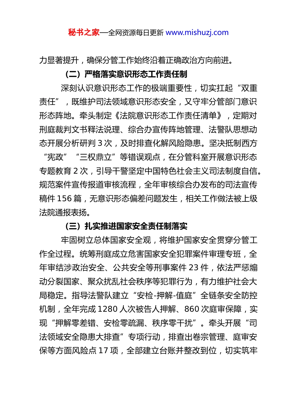 秘书之家—全网资源每日更新 www.mishuzj.comXX 法院常务副院长 2025 年度述职述廉述法报告2025 年,在上级法院有力指导、本院党组坚强领导下,我以习近平新时代中国特色社会主义思想为指导,深入学习贯彻党的二十届四中全会精神,牢牢把握“公正与效率”工作主题,认真履行常务副院长职责,分管法院日常工作及刑庭、综合办、法警队等科室,统筹推进政治建设、业务发展、廉政建设和法治建设,各项工作取得阶段性成效。现将全年履职情况报告如下:一、强化政治引领,筑牢忠诚履职思想根基(一)深学细悟党的创新理论始终把政治学习摆在首位,将学习贯彻党的二十届四中全会精神作为重大政治任务,带头落实“第一议题”制度。全年主持党组理论学习中心组学习 12 次,领学全会《建议》原文及最高法贯彻落实会议精神,带头撰写心得体会 3 篇,推动全院干警深刻领悟“两个确立”的决定性意义,增强“四个意识”、坚定“四个自信”、做到“两个维护”。结合分管科室特点,开展“全会精神进庭室”专题宣讲 4 场,引导刑庭干警立足刑事审判职能服务高质量发展,推动综合办将全会部署转化为具体工作举措,指导法警队以全会精神为指引强化责任担当。通过系统学习,自身政治判断力、政治领悟力、政治执行秘书之家—全网资源每日更新 www.mishuzj.com力显著提升,确保分管工作始终沿着正确政治方向前进。(二)严格落实意识形态工作责任制深刻认识意识形态工作的极端重要性,切实扛起“双重责任”,既维护司法领域意识形态安全,又守牢分管部门意识形态阵地。牵头制定《法院意识形态工作责任清单》,定期对刑庭裁判文书释法说理、综合办宣传阵地管理、法警队思想动态开展分析研判 3 次,及时排查化解风险隐患。坚决抵制西方“宪政”“三权鼎立”等错误观点,在分管科室开展意识形态专题教育 2 次,引导干警坚定中国特色社会主义司法制度自信。规范案件宣传报道审核流程,全年审核综合办发布的司法宣传稿件 156 篇,无意识形态偏差问题发生,相关工作做法被上级法院通报表扬。(三)扎实推进国家安全责任制落实牢固树立总体国家安全观,将维护国家安全贯穿分管工作全过程。统筹刑庭成立危害国家安全犯罪案件审理专班,全年审结涉政治安全、公共安全等刑事案件 23 件,依法严惩煽动分裂国家、聚众扰乱社会秩序等犯罪行为,有力维护社会大局稳定。指导法警队建立“安检-押解-值庭”全链条安全防控机制,全年完成 1280 人次被告人押解、860 次庭审保障,实现“押解零差错、安检零疏漏、秩序零干扰”。牵头开展“司法领域安全隐患大排查”专项行动,排查出卷宗管理、庭审安保等方面风险点 17 项,全部建立台账并整改到位,切实筑牢秘书之家—全网资源每日更新 www.mishuzj.com司法安全防线。二、聚焦主责主业,扎实开展各项工作(一)三项重点工作成效显著1.刑事审判质效双升,守护公平正义底线牵头刑庭深入践行习近平法治思想,围绕“平安 XX”建设目标,严厉打击各类刑事犯罪。全年审结各类刑事案件 456件,同比上升 15%,结案率达 98.2%,较上年提升 3.5 个百分点,一审服判息诉率 92.7%,位居全市法院前列。针对涉黑涉恶案件、电信网络诈骗等群众深恶痛绝的犯罪,开展专项审判行动,审结涉黑涉恶案件 8 件 32 人,打掉犯罪团伙 6 个,追缴违法所得 1200 余万元;审结电信网络诈骗及关联犯罪案件 76 件,挽回群众经济损失 890 万元。创新推行“庭前-庭中-庭后”全流程质效管控机制,庭前强化证据审查,庭中规范庭审程序,庭后加强释法说理,全年无刑事冤假错案发生,2起案件获评全市法院优秀裁判文书,刑庭被评为年度先进科室。2.综合服务保障提质,赋能法院高效运转指导综合办立足“中枢枢纽”定位,深化服务保障改革,推动各项工作提质增效。牵头推进“智慧法院”二期建设,上线案件管理、公文流转等一体化平台,实现行政办公、审判辅助等 6 类 28 项事务线上办理,公文流转效率提升 40%,办案辅助时间平均缩短 15%。严格落实中央八项规定精神,推进精文简会,全年压缩文件数量 30%、会议场次 25%,取消不必秘书之家—全网资源每日更新 w...