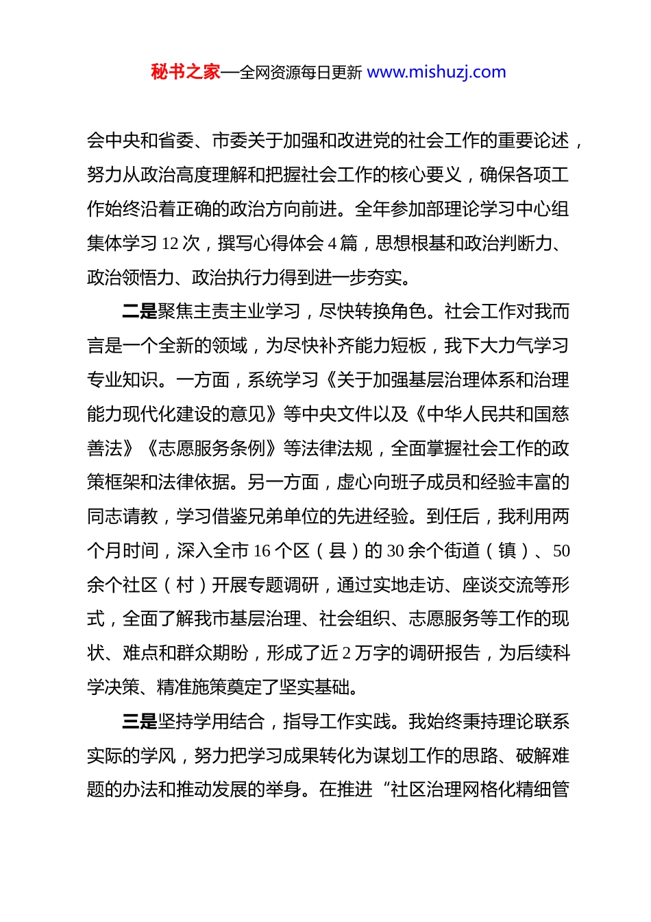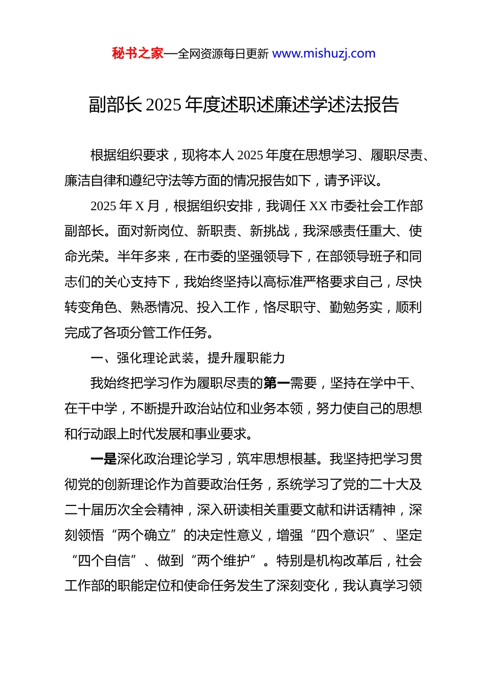 秘书之家—全网资源每日更新 www.mishuzj.com副部长 2025 年度述职述廉述学述法报告 根据组织要求,现将本人 2025 年度在思想学习、履职尽责、廉洁自律和遵纪守法等方面的情况报告如下,请予评议。2025 年 X 月,根据组织安排,我调任 XX 市委社会工作部副部长。面对新岗位、新职责、新挑战,我深感责任重大、使命光荣。半年多来,在市委的坚强领导下,在部领导班子和同志们的关心支持下,我始终坚持以高标准严格要求自己,尽快转变角色、熟悉情况、投入工作,恪尽职守、勤勉务实,顺利完成了各项分管工作任务。一、强化理论武装,提升履职能力我始终把学习作为履职尽责的第一需要,坚持在学中干、在干中学,不断提升政治站位和业务本领,努力使自己的思想和行动跟上时代发展和事业要求。一是深化政治理论学习,筑牢思想根基。我坚持把学习贯彻党的创新理论作为首要政治任务,系统学习了党的二十大及二十届历次全会精神,深入研读相关重要文献和讲话精神,深刻领悟“两个确立”的决定性意义,增强“四个意识”、坚定“四个自信”、做到“两个维护”。特别是机构改革后,社会工作部的职能定位和使命任务发生了深刻变化,我认真学习领秘书之家—全网资源每日更新 www.mishuzj.com会中央和省委、市委关于加强和改进党的社会工作的重要论述,努力从政治高度理解和把握社会工作的核心要义,确保各项工作始终沿着正确的政治方向前进。全年参加部理论学习中心组集体学习 12 次,撰写心得体会 4 篇,思想根基和政治判断力、政治领悟力、政治执行力得到进一步夯实。二是聚焦主责主业学习,尽快转换角色。社会工作对我而言是一个全新的领域,为尽快补齐能力短板,我下大力气学习专业知识。一方面,系统学习《关于加强基层治理体系和治理能力现代化建设的意见》等中央文件以及《中华人民共和国慈善法》《志愿服务条例》等法律法规,全面掌握社会工作的政策框架和法律依据。另一方面,虚心向班子成员和经验丰富的同志请教,学习借鉴兄弟单位的先进经验。到任后,我利用两个月时间,深入全市 16 个区(县)的 30 余个街道(镇)、50余个社区(村)开展专题调研,通过实地走访、座谈交流等形式,全面了解我市基层治理、社会组织、志愿服务等工作的现状、难点和群众期盼,形成了近 2 万字的调研报告,为后续科学决策、精准施策奠定了坚实基础。三是坚持学用结合,指导工作实践。我始终秉持理论联系实际的学风,努力把学习成果转化为谋划工作的思路、破解难题的办法和推动发展的举身。在推进“社区治理网格化精细管秘书之家—全网资源每日更新 www.mishuzj.com理”工作中,我将学习到的“枫桥经验”新时代内涵与我市实际相结合,提出“党建引领、多网融合、科技赋能”的工作思路,推动解决了长期存在的网格员职责不清、多头管理等问题。在谋划扶持社会组织发展政策时,我借鉴 XX 等先进地区的“公益创投”模式,结合我市社会组织发育尚不充分的现状,主导制定了《XX 市支持社区社会组织发展专项行动方案》,有效激发了基层社会组织的内生动力。二、聚焦中心任务,奋力担当作为我牢记职责使命,紧紧围绕市委中心工作和本部年度重点任务,主动担当、积极作为,全力推动分管领域工作取得新进展、新成效。一是聚力基层治理创新,夯实社会和谐稳定根基。我牵头负责推进全市基层治理体系和治理能力现代化建设。以党建引领为核心,持续深化“五社联动”机制,推动街道社区党组织、居(村)委会、业主委员会、物业服务企业等多方力量协同共治。2025 年,我们成功打造了 15 个市级“红色物业”示范点,有效化解了 120 余起长期积累的物业管理矛盾纠纷。深入开展“XX 社区减负增效”专项行动,清理规范社区(村)出具的各类证明事项 42 项,协助社区从纷繁复杂的行政事务中解脱出来,回归服务群众主业。截至 2025 年底,全市城市社区综合服秘书之家—全网资源每日更新 www.mishuzj.com务设施覆盖率达到 100%,农村社区覆盖率提升至 98.5%,为群众提供了更加便捷、高效的“一站式”服务。二是引领社会组织发展,激发社会协同治理活力。我坚持“引导发展”和“依法管理...