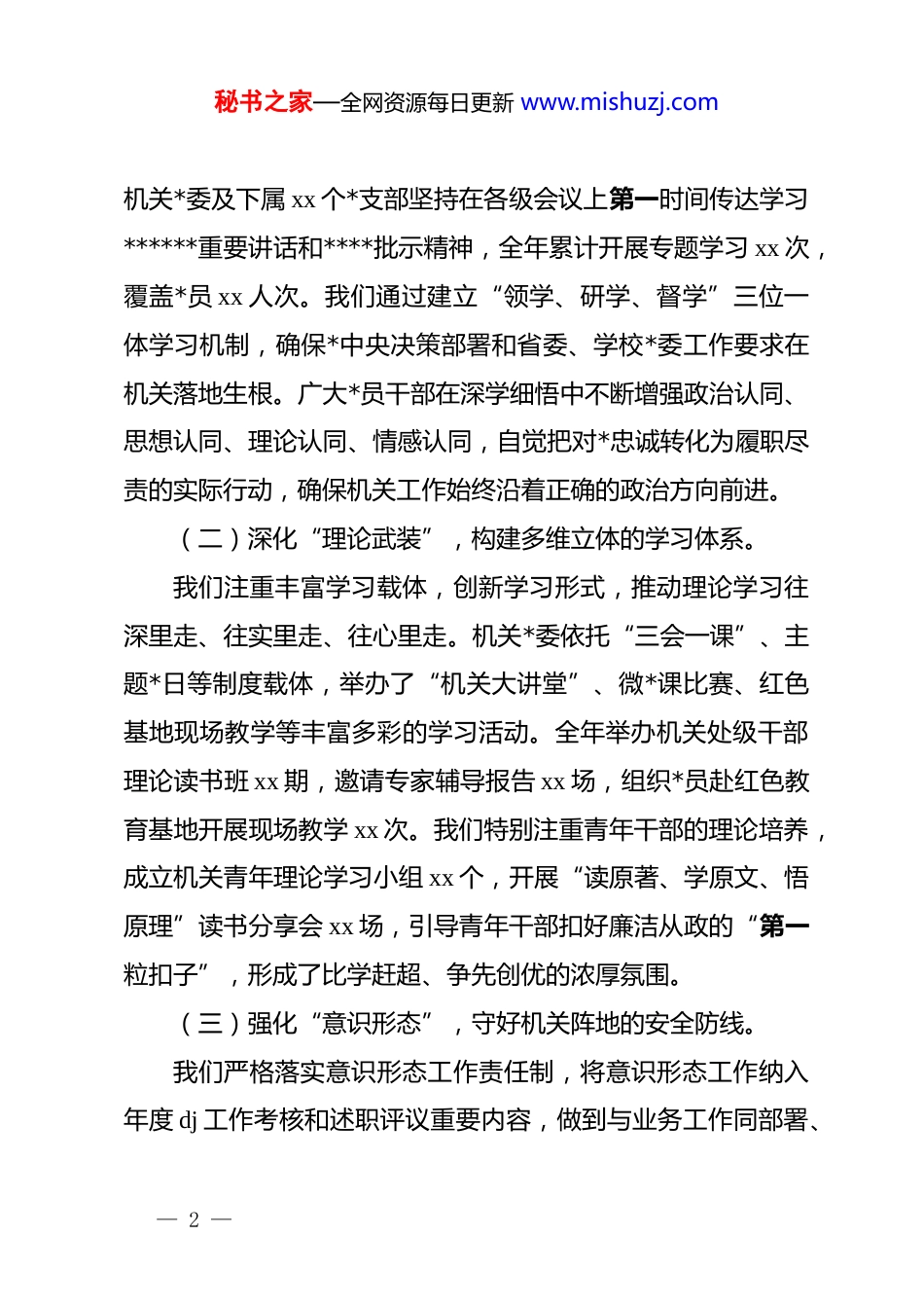 秘书之家—全网资源每日更新 www.mishuzj.com高校机关*委 2025 年工作总结:dj 领航铸魂赋能高质量发展2025 年是学校深化综合改革、冲刺高质量发展目标的关键之年,也是机关*的建设提质增效、全面过硬的攻坚之年。一年来,机关*委在学校*委的坚强领导下,坚持以**************思想为指导,紧紧围绕立德树人根本任务,牢固树立“围绕中心抓 dj、抓好 dj 促业务”的工作理念,以建设“讲政治、守纪律、负责任、有效率”的模范机关为目标,充分发挥机关*组织的战斗堡垒作用和*员的先锋模范作用。全年共开展各类学习教育活动 xx 场次,解决师生急难愁盼问题 xx 项,机关作风显著改善,服务效能大幅提升,为学校各项事业高质量发展提供了坚强的政治保证和组织保障。一、聚焦“政治领航”,在铸魂强基中把稳思想之舵机关*委始终把*的政治建设摆在首位,坚持用*的创新理论武装头脑,引导机关广大*员干部深刻领悟“两个确立”的决定性意义,不断提高政治判断力、政治领悟力、政治执行力。(一)抓实“第一议题”,筑牢绝对忠诚的政治信仰。我们坚持把学习贯彻**************思想作为首要政治任务,严格执行“第一议题”制度,确保学习常态化、制度化。— 1 —秘书之家—全网资源每日更新 www.mishuzj.com机关*委及下属 xx 个*支部坚持在各级会议上第一时间传达学习******重要讲话和****批示精神,全年累计开展专题学习 xx 次,覆盖*员 xx 人次。我们通过建立“领学、研学、督学”三位一体学习机制,确保*中央决策部署和省委、学校*委工作要求在机关落地生根。广大*员干部在深学细悟中不断增强政治认同、思想认同、理论认同、情感认同,自觉把对*忠诚转化为履职尽责的实际行动,确保机关工作始终沿着正确的政治方向前进。(二)深化“理论武装”,构建多维立体的学习体系。我们注重丰富学习载体,创新学习形式,推动理论学习往深里走、往实里走、往心里走。机关*委依托“三会一课”、主题*日等制度载体,举办了“机关大讲堂”、微*课比赛、红色基地现场教学等丰富多彩的学习活动。全年举办机关处级干部理论读书班 xx 期,邀请专家辅导报告 xx 场,组织*员赴红色教育基地开展现场教学 xx 次。我们特别注重青年干部的理论培养,成立机关青年理论学习小组 xx 个,开展“读原著、学原文、悟原理”读书分享会 xx 场,引导青年干部扣好廉洁从政的“第一粒扣子”,形成了比学赶超、争先创优的浓厚氛围。(三)强化“意识形态”,守好机关阵地的安全防线。我们严格落实意识形态工作责任制,将意识形态工作纳入年度 dj 工作考核和述职评议重要内容,做到与业务工作同部署、— 2 —秘书之家—全网资源每日更新 www.mishuzj.com同落实、同检查、同考核。机关*委定期分析研判机关意识形态领域情况,全年召开意识形态工作专题研判会 xx 次,及时排查风险隐患。加强对机关各部门网站、新媒体账号等阵地的管理,严格执行“三审三校”制度,确保信息发布准确规范。我们还重点关注重要时间节点、敏感时期的舆情动态,加强对机关*员干部的网络行为规范教育,引导*员干部在网络空间发挥正能量,坚决维护学校政治安全和校园稳定。二、聚焦“效能提升”,在服务大局中彰显担当之责机关*委紧紧围绕学校中心工作,积极探索 dj 与业务深度融合的路径,持续深化作风建设,着力打造服务型、效能型机关,以高质量 dj 推动学校管理服务水平迈上新台阶。(一)实施“融合工程”,破解 dj 业务的脱节难题。我们坚持把 dj 工作融入业务工作全过程,积极探索“dj+”工作模式,推动 dj 工作与业务工作同频共振。各*支部结合部门职能,找准 dj 与业务的结合点,创建了“dj+教学改革”、“dj+科研服务”、“dj+人事人才”等一批特色鲜明的 dj 品牌。比如,教务处*支部设立“*员先锋岗”,在本科教育教学审核评估期间,*员带头加班加点,圆满完成了各项迎评任务;财务处*支部开展“送服务上门”活动,深入学院为科研团队讲解财务政策,解决了报销难问题。通过实施“融合工程”,有效破— 3 —秘书之家—全网资源每日更新 www.mishuzj.com解了 dj 业务“两张皮”现象,...