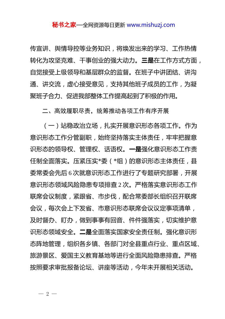 秘书之家—全网资源每日更新 www.mishuzj.com个人 2025 年度述学述职述廉述法报告2025 年,在县委、县政府和宣传部的正确领导下,在同事与领导的帮助下,我认真学习业务,自觉履行职责,重点抓好意识形态、理论武装等工作。现将一年来履职尽责情况和*风廉政建设情况作如下汇报:一、强化理论学习,始终保持对*忠诚的政治本色认真学习贯彻*的二十大、二十届四中全会精神,用坚实的政治理论筑牢理想信念和政治忠诚,用过硬的理论素养推动业务水平能力提升。一是在理论武装方面,重点学习了《*委(*组)意识形态工作责任制实施办法》、《中国共产*思想政治工作条例》和《中国共产*宣传工作条例》等内容,全力守护好宣传思想文化事业的前沿阵地,坚决扛起“举旗帜、聚民心、育新人、兴文化、展形象”的使命担当,争做***文化思想的坚定信仰者、有力传播者、忠实践行者。二是在强化自身学习方面,在日常工作中,多向有经验的同志学习,不断提升政治能力、思维能力、实践能力。在业务工作中,主动担起自己的主责主业,积极参加理论中心组集中学习和专题培训,重点学习了宣— 1 —秘书之家—全网资源每日更新 www.mishuzj.com传宣讲、舆情导控等业务知识,将焕发出来的学习、工作热情转化为攻坚克难、干事创业的强大动力。三是在工作方式方面,自觉接受上级领导和基层群众的监督。在班子中讲团结、讲沟通、讲交流,虚心接受意见,支持其他班子成员的工作,为凝聚班子合力、促进我部整体工作提高起到了积极的作用。二、高效履职尽责,统筹推动各项工作有序开展(一)站稳政治立场,扎实开展意识形态各项工作。作为意识形态工作分管副职,始终坚持落实主体责任,牢牢把握意识形态的领导权、管理权、话语权。一是强化意识形态工作责任制全面落实。压紧压实*委(*组)的意识形态主体责任,县委常委会先后 6 次就意识形态工作进行了专题研究部署,开展意识形态领域风险隐患专项排查 2 次。严格落实意识形态工作联席会议制度,紧跟省、市步伐,配合常委部长组织召开联席会议,每次会上下发省、市意识形态联席会议议定事项清单,及时督办、盯办,做到事事有回音、件件强落实,切实维护意识形态领域安全。二是全面落实国家安全责任制。强化意识形态阵地管理,组织各乡镇、各部门对全县重点行业、重点区域、旅游景区、爱国主义教育基地等进行全面风险隐患排查。严格按照要求审批报备论坛、讲座等活动,今年未开展相关活动。— 2 —秘书之家—全网资源每日更新 www.mishuzj.com三是配合做好正面宣传工作。按照领导要求,由我牵头负责日常管理工作。按照每周一次或两次的频率,精选县委、县政府中心工作、“媒体+”赋能乡村振兴行动成效、*的二十届四中全会精神宣传宣讲、安全生产等内容。(二)强化宣传宣讲,理论入脑入心。持续深化特色宣讲品牌,以“非遗+宣讲”、“文艺+宣讲”、“精神文明+宣讲”等多种形式,广泛开展**************思想和*的二十大、二十届四中全会精神“六进”“三进”宣传教育活动,理论宣讲实现全覆盖。我县宣讲品牌得到了市级的高度认可,品牌创建相关信息分别被推送刊发。市“理论特派员”基层示范巡讲(第二季)成功在我县举办。主动挖掘基层先进典型,撰写宣讲稿件,积极参与学习宣传贯彻*的二十届四中全会精神“送理论下基层”省市县三级联讲之保定市“理论特派员”基层示范巡讲、xx 市“理论特派员”基层宣讲的宣讲活动。协调配合市委“走基层”宣讲团、“进区入村”宣讲团来县各宣讲 1 次。(三)积极参与“媒体+”赋能乡村振兴行动。一是聚焦典型经验挖掘与总结汇报撰写,系统梳理全媒体宣传、文艺赋能、产销对接等工作成效,形成可复制、可推广的实践成果。二是配合开展业务培训,细化外单位考察学习接待方案,配合做好— 3 —秘书之家—全网资源每日更新 www.mishuzj.com对外经验交流。三是将总结成果与宣讲工作深度融合,在人民网、央广网等多个媒体推送刊发,全方位展现“媒体+”与宣讲工作的深度融合,进一步擦亮宣讲品牌。(四)牵头开展深入贯彻中央八项规定精神学习教育。一是高站位谋划推动,快速高效推动学习教育开展。3 月 26 日...