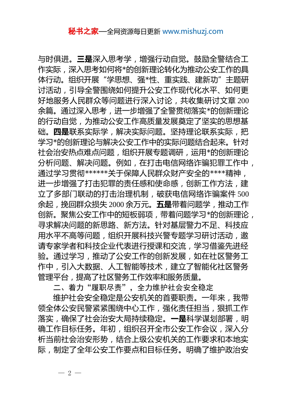 秘书之家—全网资源每日更新 www.mishuzj.com公安局*委书记 2025 个人年度述职述廉报告各位领导、同志们:2025 年,在上级*委的坚强领导下,我作为公安局*委书记,紧紧围绕*和国家工作大局,以维护社会稳定、保障人民安宁为己任,扎实履行职责,不断加强自身建设,全力推动公安工作高质量发展。现将一年来的工作述职述廉如下:一、着眼“铸魂育人”,持续强化政治思想建设思想是行动的指南,政治建设是公安工作的生命线。一年来,我始终把政治思想建设摆在首位,着力在学懂弄通做实上下功夫,确保全体公安民警对*忠诚、服务人民、执法公正、纪律严明。一是坚持原原本本学,筑牢信仰根基。组织全警深入学习**************思想,特别是******关于新时代公安工作的重要论述,原原本本研读经典著作,逐字逐句领悟精神实质。通过*委理论学习中心组学习、“三会一课”、专题讲座等形式,引导全警深刻领悟“两个确立”的决定性意义,增强“四个意识”、坚定“四个自信”、做到“两个维护”。全年共组织*委理论学习中心组学习 12 次,专题讲座 8 场,确保全警在思想上政治上行动上同以***同志为核心的中共中央保持高度一致。二是及时跟进学,把握时代脉搏。紧跟*的理论创新步伐,及时组织全警学习*的二十大及二十届二中、三中全会精神,以及*中央关于公安工作的最新决策部署。通过举办学习贯彻*的二十届三中全会精神专题培训班,邀请专家学者进行解读,引导全警准确把握新时代公安工作的新使命、新任务、新要求。同时,利用“学习强国”“公安大讲堂”等线上平台,及时推送学习资料,方便全警随时随地学习,确保全警始终紧跟时代步伐,— 1 —秘书之家—全网资源每日更新 www.mishuzj.com与时俱进。三是深入思考学,增强行动自觉。鼓励全警结合工作实际,深入思考如何将*的创新理论转化为推动公安工作的具体行动。组织开展“学思想、强*性、重实践、建新功”主题研讨活动,引导全警围绕如何提升公安工作现代化水平、如何更好地服务人民群众等问题进行深入讨论,共收集研讨文章 200余篇。通过深入思考,进一步增强了全警贯彻落实*的创新理论的行动自觉,为推动公安工作高质量发展奠定了坚实的思想基础。四是联系实际学,解决实际问题。坚持理论联系实际,把学习*的创新理论与解决公安工作中的实际问题结合起来。针对社会治安热点难点问题,组织开展专题调研,运用*的创新理论分析问题、解决问题。例如,在打击电信网络诈骗犯罪工作中,通过学习贯彻******关于保障人民群众财产安全的****精神,进一步增强了打击犯罪的责任感和使命感,创新工作方法,建立了多部门联动的打击治理机制,破获电信网络诈骗案件 500余起,挽回群众损失 2000 余万元。五是带着问题学,推动工作创新。聚焦公安工作中的短板弱项,带着问题学习*的创新理论,寻求解决问题的新思路、新方法。针对基层警力不足、科技应用水平不高等问题,组织开展科技兴警专题学习研讨活动,邀请专家学者和科技企业代表进行授课和交流,学习借鉴先进经验。通过学习,推动了公安工作的创新发展,如在社区警务工作中,引入大数据、人工智能等技术,建立了智能化社区警务管理平台,提高了社区警务工作效率和服务质量。二、着力“履职尽责”,全力维护社会安全稳定维护社会安全稳定是公安机关的首要职责。一年来,我带领全体公安民警紧紧围绕中心工作,强化责任担当,狠抓工作落实,确保了社会治安大局持续稳定。一是科学谋划部署,明确工作目标任务。年初,组织召开全市公安工作会议,深入分析当前社会治安形势,结合上级公安机关的工作要求和本地实际,制定了全年公安工作要点和目标任务。明确了维护政治安— 2 —秘书之家—全网资源每日更新 www.mishuzj.com全、打击违法犯罪、加强社会治理、服务经济发展等重点工作任务,并将任务分解到各警种、各部门,明确责任人和时间节点,确保各项工作有序推进。二是精心组织实施,严厉打击违法犯罪。始终保持对各类违法犯罪的严打高压态势,深入开展“云剑”“净网”“昆仑”等专项行动,严厉打击暴力犯罪、侵财犯罪、毒品犯罪等各类违法犯罪活动。加强对社会治安热点地区的巡逻...