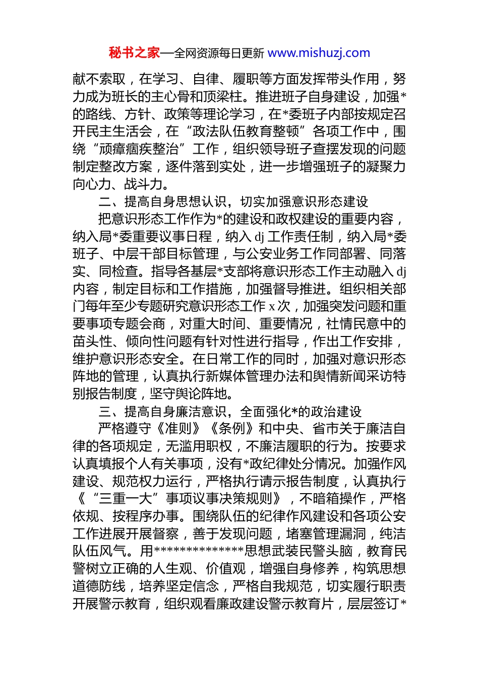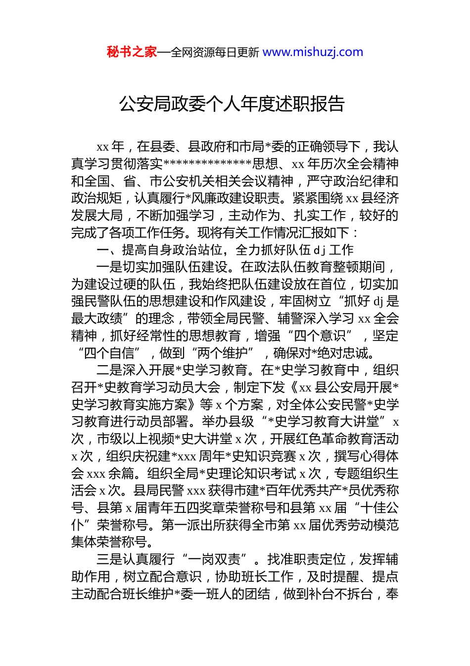 秘书之家—全网资源每日更新 www.mishuzj.com公安局政委个人年度述职报告xx 年,在县委、县政府和市局*委的正确领导下,我认真学习贯彻落实**************思想、xx 年历次全会精神和全国、省、市公安机关相关会议精神,严守政治纪律和政治规矩,认真履行*风廉政建设职责。紧紧围绕 xx 县经济发展大局,不断加强学习,主动作为、扎实工作,较好的完成了各项工作任务。现将有关工作情况汇报如下:一、提高自身政治站位,全力抓好队伍 dj 工作一是切实加强队伍建设。在政法队伍教育整顿期间,为建设过硬的队伍,我始终把队伍建设放在首位,切实加强民警队伍的思想建设和作风建设,牢固树立“抓好 dj 是最大政绩”的理念,带领全局民警、辅警深入学习 xx 全会精神,抓好经常性的思想教育,增强“四个意识”,坚定“四个自信”,做到“两个维护”,确保对*绝对忠诚。二是深入开展*史学习教育。在*史学习教育中,组织召开*史教育学习动员大会,制定下发《xx 县公安局开展*史学习教育实施方案》等 x 个方案,对全体公安民警*史学习教育进行动员部署。举办县级“*史学习教育大讲堂”x次,市级以上视频*史大讲堂 x 次,开展红色革命教育活动x 次,组织庆祝建*xxx 周年*史知识竞赛 x 次,撰写心得体会 xxx 余篇。组织全局*史理论知识考试 x 次,专题组织生活会 x 次。县局民警 xxx 获得市建*百年优秀共产*员优秀称号、县第 x 届青年五四奖章荣誉称号和县第 xx 届“十佳公仆”荣誉称号。第一派出所获得全市第 xx 届优秀劳动模范集体荣誉称号。三是认真履行“一岗双责”。找准职责定位,发挥辅助作用,树立配合意识,协助班长工作,及时提醒、提点主动配合班长维护*委一班人的团结,做到补台不拆台,奉秘书之家—全网资源每日更新 www.mishuzj.com献不索取,在学习、自律、履职等方面发挥带头作用,努力成为班长的主心骨和顶梁柱。推进班子自身建设,加强*的路线、方针、政策等理论学习,在*委班子内部按规定召开民主生活会,在“政法队伍教育整顿”各项工作中,围绕“顽瘴痼疾整治”工作,组织领导班子查摆发现的问题制定整改方案,逐件落到实处,进一步增强班子的凝聚力向心力、战斗力。二、提高自身思想认识,切实加强意识形态建设把意识形态工作作为*的建设和政权建设的重要内容,纳入局*委重要议事日程,纳入 dj 工作责任制,纳入局*委班子、中层干部目标管理,与公安业务工作同部署、同落实、同检查。指导各基层*支部将意识形态工作主动融入 dj内容,制定目标和工作措施,加强督导推进。组织相关部门每年至少专题研究意识形态工作 x 次,加强突发问题和重要事项专题会商,对重大时间、重要情况,社情民意中的苗头性、倾向性问题有针对性进行指导,作出工作安排,维护意识形态安全。在日常工作的同时,加强对意识形态阵地的管理,认真执行新媒体管理办法和舆情新闻采访特别报告制度,坚守舆论阵地。三、提高自身廉洁意识,全面强化*的政治建设严格遵守《准则》《条例》和中央、省市关于廉洁自律的各项规定,无滥用职权,不廉洁履职的行为。按要求认真填报个人有关事项,没有*政纪律处分情况。加强作风建设、规范权力运行,严格执行请示报告制度,认真执行《“三重一大”事项议事决策规则》,不暗箱操作,严格依规、按程序办事。围绕队伍的纪律作风建设和各项公安工作进展开展督察,善于发现问题,堵塞管理漏洞,纯洁队伍风气。用**************思想武装民警头脑,教育民警树立正确的人生观、价值观,增强自身修养,构筑思想道德防线,培养坚定信念,严格自我规范,切实履行职责开展警示教育,组织观看廉政建设警示教育片,层层签订*秘书之家—全网资源每日更新 www.mishuzj.com风廉政建设责任状,提高了公安机关风险防控能力;深入开展纪律作风整顿,使全体民警灵魂上受到洗礼,思想得到启迪;严格遵守*的政治纪律、组织纪律、经济纪律和群众纪律;严格执法,杜绝关系案、金钱案、人情案;严于律己,以身作则,认真执行“一规四制”,全面防范民警违法违纪问题发生;通过学习教育,提高了全体民警的政治理论水平和明辨是非能力,树立政治意识、...