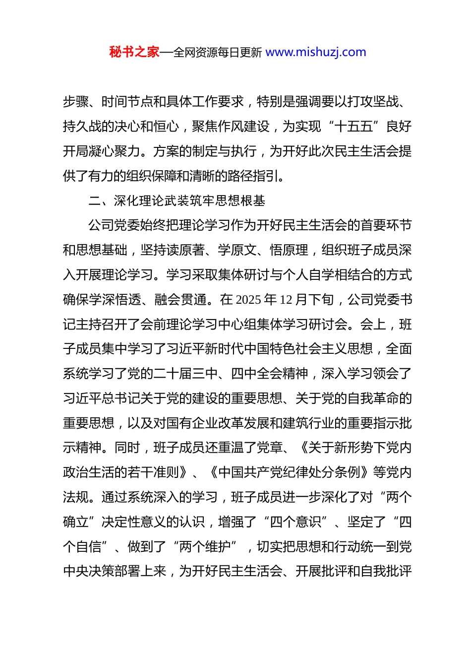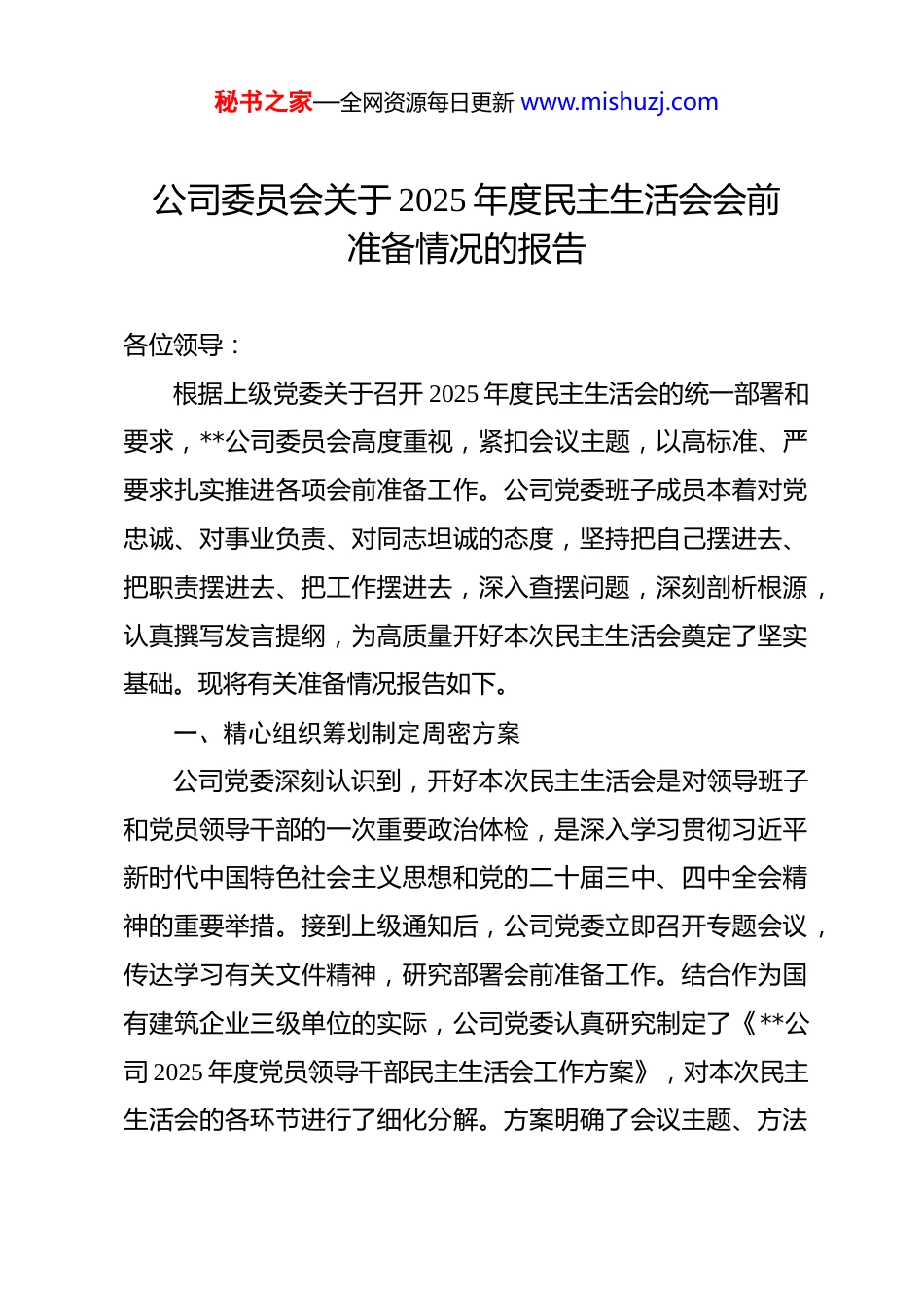 秘书之家—全网资源每日更新 www.mishuzj.com公司委员会关于 2025 年度民主生活会会前准备情况的报告 各位领导:根据上级党委关于召开 2025 年度民主生活会的统一部署和要求,**公司委员会高度重视,紧扣会议主题,以高标准、严要求扎实推进各项会前准备工作。公司党委班子成员本着对党忠诚、对事业负责、对同志坦诚的态度,坚持把自己摆进去、把职责摆进去、把工作摆进去,深入查摆问题,深刻剖析根源,认真撰写发言提纲,为高质量开好本次民主生活会奠定了坚实基础。现将有关准备情况报告如下。一、精心组织筹划制定周密方案公司党委深刻认识到,开好本次民主生活会是对领导班子和党员领导干部的一次重要政治体检,是深入学习贯彻习近平新时代中国特色社会主义思想和党的二十届三中、四中全会精神的重要举措。接到上级通知后,公司党委立即召开专题会议,传达学习有关文件精神,研究部署会前准备工作。结合作为国有建筑企业三级单位的实际,公司党委认真研究制定了《**公司 2025 年度党员领导干部民主生活会工作方案》,对本次民主生活会的各环节进行了细化分解。方案明确了会议主题、方法秘书之家—全网资源每日更新 www.mishuzj.com步骤、时间节点和具体工作要求,特别是强调要以打攻坚战、持久战的决心和恒心,聚焦作风建设,为实现“十五五”良好开局凝心聚力。方案的制定与执行,为开好此次民主生活会提供了有力的组织保障和清晰的路径指引。二、深化理论武装筑牢思想根基公司党委始终把理论学习作为开好民主生活会的首要环节和思想基础,坚持读原著、学原文、悟原理,组织班子成员深入开展理论学习。学习采取集体研讨与个人自学相结合的方式确保学深悟透、融会贯通。在 2025 年 12 月下旬,公司党委书记主持召开了会前理论学习中心组集体学习研讨会。会上,班子成员集中学习了习近平新时代中国特色社会主义思想,全面系统学习了党的二十届三中、四中全会精神,深入学习领会了习近平总书记关于党的建设的重要思想、关于党的自我革命的重要思想,以及对国有企业改革发展和建筑行业的重要指示批示精神。同时,班子成员还重温了党章、《关于新形势下党内政治生活的若干准则》、《中国共产党纪律处分条例》等党内法规。通过系统深入的学习,班子成员进一步深化了对“两个确立”决定性意义的认识,增强了“四个意识”、坚定了“四个自信”、做到了“两个维护”,切实把思想和行动统一到党中央决策部署上来,为开好民主生活会、开展批评和自我批评秘书之家—全网资源每日更新 www.mishuzj.com打下了坚实的思想理论基础。三、广开言路纳谏深入查摆问题为确保问题查摆得准、找得实、挖得深,公司党委坚持开门纳谏,发扬民主,通过多种渠道广泛征求意见建议。公司党委综合运用了下发征求意见函、召开基层单位和项目一线职工代表座谈会、设置线上线下意见箱、个别访谈等多种方式,面向公司所属各项目部、机关各部门、全体党员干部职工,乃至部分重要合作伙伴,广泛征求对公司领导班子及成员的意见建议。本次征求意见活动共发放征求意见函 80 余份,召开各类座谈会 5 场,线上线下收集到各类原始意见建议 136 条。公司党委指定专人对征集到的意见建议进行了系统梳理和归纳,最终梳理形成原汁原味的意见建议共计 58 条。其中,对领导班子集体的意见 22 条,对班子成员个人的意见 36 条。意见主要集中在强化政治引领、深化国企改革、推动高质量发展、加强作风建设、防范化解风险、增进民生福祉等方面,为领导班子和成员个人深入查摆问题、剖析根源提供了重要依据。四、普遍谈心谈话凝聚思想共识按照要求,公司党委班子成员在会前普遍开展了深入细致的谈心谈话。谈心谈话严格遵循“四必谈”要求,即党委主要负责同志与班子成员逐一谈心,班子成员相互之间深入谈心,秘书之家—全网资源每日更新 www.mishuzj.com班子成员与分管单位主要负责同志进行谈心,以及与本人组织关系所在党支部党员代表开展谈心。在谈心谈话过程中,班子成员主动亮明自身存在的不足,诚恳指出对方存在的问题,相互交换对班子存在问题的看法,并就拟在民主生活会上开展批评的意见进行了充...