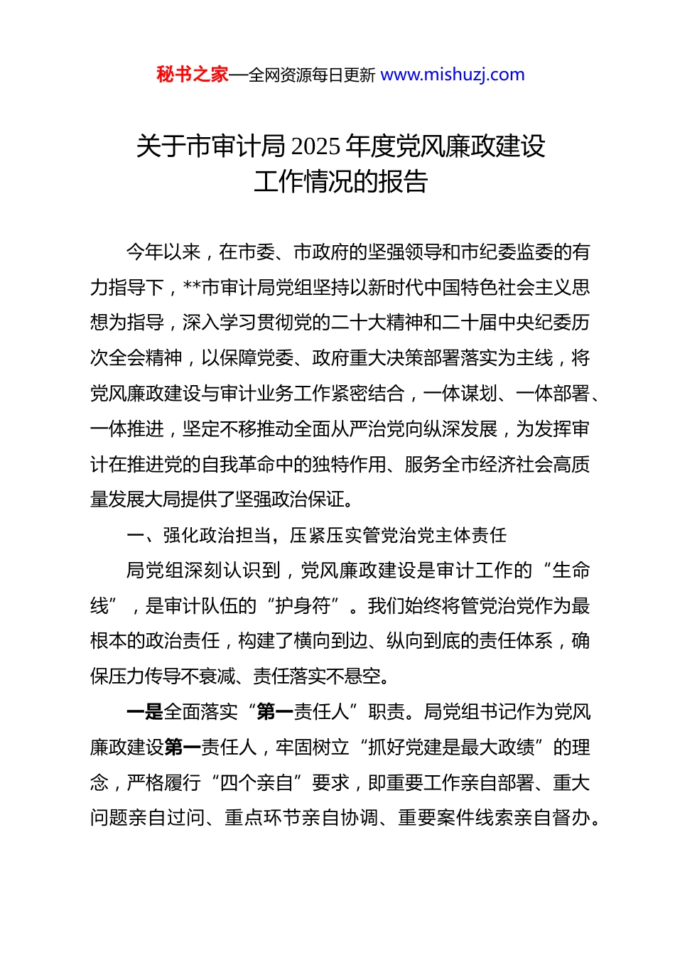 秘书之家—全网资源每日更新 www.mishuzj.com关于市审计局 2025 年度党风廉政建设工作情况的报告 今年以来,在市委、市政府的坚强领导和市纪委监委的有力指导下,**市审计局党组坚持以新时代中国特色社会主义思想为指导,深入学习贯彻党的二十大精神和二十届中央纪委历次全会精神,以保障党委、政府重大决策部署落实为主线,将党风廉政建设与审计业务工作紧密结合,一体谋划、一体部署、一体推进,坚定不移推动全面从严治党向纵深发展,为发挥审计在推进党的自我革命中的独特作用、服务全市经济社会高质量发展大局提供了坚强政治保证。一、强化政治担当,压紧压实管党治党主体责任局党组深刻认识到,党风廉政建设是审计工作的“生命线”,是审计队伍的“护身符”。我们始终将管党治党作为最根本的政治责任,构建了横向到边、纵向到底的责任体系,确保压力传导不衰减、责任落实不悬空。一是全面落实“第一责任人”职责。局党组书记作为党风廉政建设第一责任人,牢固树立“抓好党建是最大政绩”的理念,严格履行“四个亲自”要求,即重要工作亲自部署、重大问题亲自过问、重点环节亲自协调、重要案件线索亲自督办。秘书之家—全网资源每日更新 www.mishuzj.com2025 年,局党组书记先后主持召开 6 次党组会议专题研究党风廉政建设工作,分析研判形势,部署重点任务。同时,定期向市委和市纪委监委汇报工作,争取上级指导和支持。通过“一把手”带头抓,形成了以上率下、层层抓落实的良好局面。二是精准划分“一岗双责”责任田。我们深知,党风廉-政建设不是纪检部门一家的事,而是全局上下的共同责任。年初,局党组研究制定了《2025 年度党风廉政建设责任清单》,将责任细化分解到每一位班子成员、每一个科室负责人。局主要负责人与班子成员、班子成员与分管科室负责人之间层层签订《党风廉政建设责任书》共计 38 份,明确了各自在职责范围内的领导责任和具体任务。这种“清单化”管理模式,使每位同志的责任清晰明了,形成了“党组统一领导、书记主抓总责、班子成员分工负责、科室各司其职、全员参与”的齐抓共管工作格局。三是严格执行督查考核硬约束。为确保责任制落到实处,我们坚持将党风廉政建设工作纳入局年度目标管理绩效考核体系,考核结果与干部评先评优、职级晋升、绩效奖励等直接挂钩。每季度组织开展一次党风廉政建设专项督查,通过听取汇报、查阅资料、个别谈话等方式,深入检查各科室责任落实情况,及时发现并纠正苗头性、倾向性问题。对考核中发现的问秘书之家—全网资源每日更新 www.mishuzj.com题,严肃进行约谈提醒;对表现突出的,予以通报表扬,有效激发了各级干部履行党风廉-政建设责任的内生动力。二、筑牢思想防线,常态化长效化开展廉政教育我们坚持把思想政治建设摆在首位,以理想信念强基固本以先进文化启智润心,以反面典型警钟长鸣,引导全体审计干部知敬畏、存戒惧、守底线,筑牢拒腐防变的思想堤坝。一是深化理论武装,铸牢廉洁从审之魂。坚持将廉政教育融入日常、抓在经常。依托党组理论学习中心组学习、“三会一课”、青年理论学习小组等载体,组织全体党员干部深入学习党章党规党纪,特别是新修订的《中国共产党纪律处分条例》。2025 年,我们共组织开展了 12 次集体廉政专题学习。同时,创新学习方式,邀请市纪委监委专家来局作专题辅导报告,组织观看《持续发力纵深推进》等警示教育片,通过线上线下相结合的方式,确保学习教育全覆盖、无死角,引导审计干部从思想深处树立正确的权力观、地位观、利益观。二是丰富教育形式,营造崇廉尚洁之风。为增强廉政教育的感染力和渗透力,我们积极探索多元化的教育路径。2025 年,组织了“清风润审计·廉洁伴我行”系列主题活动。组织新提拔和年轻干部共计 40 余人次赴**市廉政教育基地接受沉浸式警示教育;在“五一”、国庆等重要节假日前,通过工作群、手机秘书之家—全网资源每日更新 www.mishuzj.com短信等方式发送廉政提醒信息超过 200 条次,打好廉洁“预防针”;举办“廉洁家风故事分享会”,邀请干部家属共同参与,推动廉洁文化进家庭;组织观看了《**新愚公》等红色教育影片...