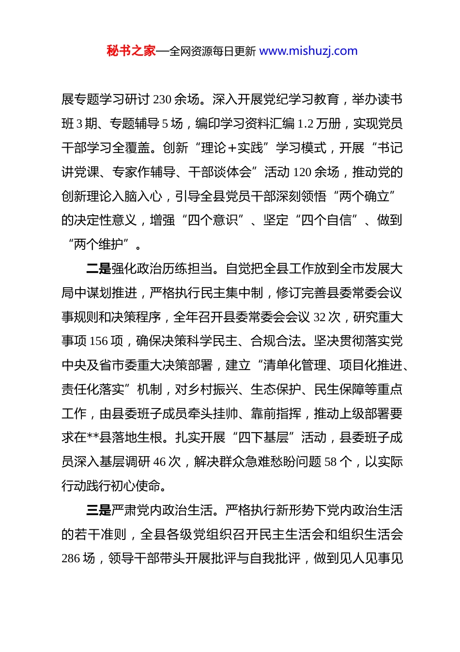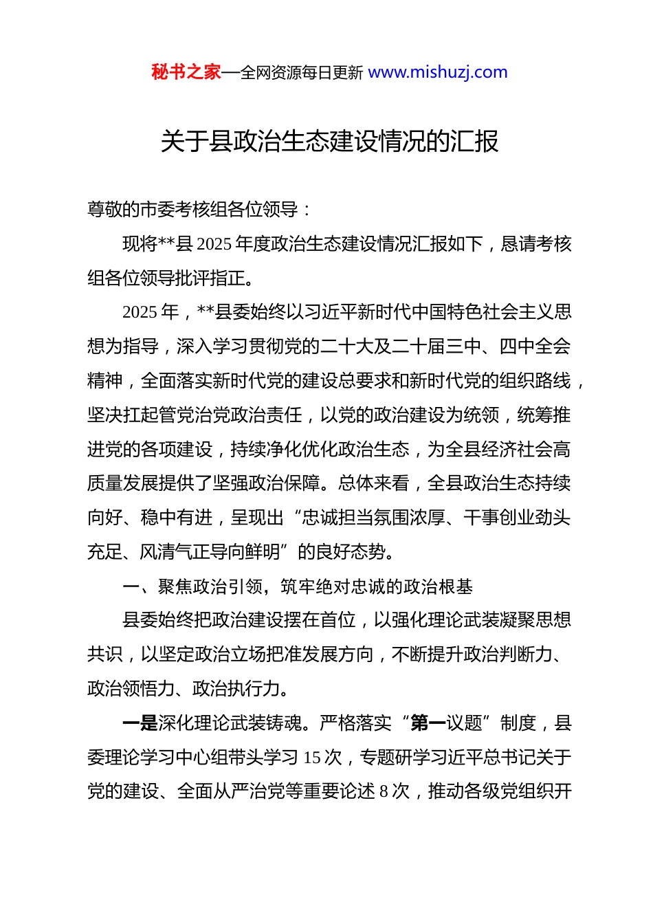 秘书之家—全网资源每日更新 www.mishuzj.com关于县政治生态建设情况的汇报 尊敬的市委考核组各位领导:现将**县 2025 年度政治生态建设情况汇报如下,恳请考核组各位领导批评指正。2025 年,**县委始终以习近平新时代中国特色社会主义思想为指导,深入学习贯彻党的二十大及二十届三中、四中全会精神,全面落实新时代党的建设总要求和新时代党的组织路线,坚决扛起管党治党政治责任,以党的政治建设为统领,统筹推进党的各项建设,持续净化优化政治生态,为全县经济社会高质量发展提供了坚强政治保障。总体来看,全县政治生态持续向好、稳中有进,呈现出“忠诚担当氛围浓厚、干事创业劲头充足、风清气正导向鲜明”的良好态势。一、聚焦政治引领,筑牢绝对忠诚的政治根基县委始终把政治建设摆在首位,以强化理论武装凝聚思想共识,以坚定政治立场把准发展方向,不断提升政治判断力、政治领悟力、政治执行力。一是深化理论武装铸魂。严格落实“第一议题”制度,县委理论学习中心组带头学习 15 次,专题研学习近平总书记关于党的建设、全面从严治党等重要论述 8 次,推动各级党组织开秘书之家—全网资源每日更新 www.mishuzj.com展专题学习研讨 230 余场。深入开展党纪学习教育,举办读书班 3 期、专题辅导 5 场,编印学习资料汇编 1.2 万册,实现党员干部学习全覆盖。创新“理论+实践”学习模式,开展“书记讲党课、专家作辅导、干部谈体会”活动 120 余场,推动党的创新理论入脑入心,引导全县党员干部深刻领悟“两个确立”的决定性意义,增强“四个意识”、坚定“四个自信”、做到“两个维护”。二是强化政治历练担当。自觉把全县工作放到全市发展大局中谋划推进,严格执行民主集中制,修订完善县委常委会议事规则和决策程序,全年召开县委常委会会议 32 次,研究重大事项 156 项,确保决策科学民主、合规合法。坚决贯彻落实党中央及省市委重大决策部署,建立“清单化管理、项目化推进、责任化落实”机制,对乡村振兴、生态保护、民生保障等重点工作,由县委班子成员牵头挂帅、靠前指挥,推动上级部署要求在**县落地生根。扎实开展“四下基层”活动,县委班子成员深入基层调研 46 次,解决群众急难愁盼问题 58 个,以实际行动践行初心使命。三是严肃党内政治生活。严格执行新形势下党内政治生活的若干准则,全县各级党组织召开民主生活会和组织生活会286 场,领导干部带头开展批评与自我批评,做到见人见事见秘书之家—全网资源每日更新 www.mishuzj.com思想。规范落实“三会一课”、主题党日等制度,创新开展“传承红色基因、筑牢忠诚底色”等主题活动 150 余场,不断增强党内政治生活的政治性、时代性、原则性、战斗性。加强对党内政治生活制度执行情况的监督检查,对执行不到位的 23个党组织进行约谈提醒,推动党内政治生活常态化、规范化。二、压实管党责任,构建全域覆盖的责任体系县委始终坚持“抓好党建是最大政绩”理念,层层压实管党治党政治责任,推动全面从严治党向纵深发展、向基层延伸。一是健全责任传导机制。制定县委落实全面从严治党主体责任清单,县委书记履行“第一责任人”职责,带头研究部署党建工作、带头督促整改问题、带头开展廉政谈话;班子成员严格落实“一岗双责”,抓好分管领域党风廉政建设,形成“书记抓、抓书记,层层抓落实”的工作格局。召开全县全面从严治党工作会议 2 次,与各乡镇(街道)、县直各单位签订党风廉政建设责任书 86 份,开展责任落实专项督查 4 次,推动责任压力逐级传导、落地见效。二是强化考核问责倒逼。将政治生态建设和全面从严治党责任落实情况纳入年度绩效考核核心内容,权重占比不低于30%,与业务工作同步考核、同步奖惩。建立“日常督查+季度调度+年度考核”的常态化督导机制,对考核排名靠后、问秘书之家—全网资源每日更新 www.mishuzj.com题较多的 12 个单位主要负责人进行约谈;对履职不力、失职失责的 8 名干部严肃追责问责,以考核问责倒逼责任落实。三是完善协同联动格局。健全县委统一领导、纪委监委监督执纪问责、相关部门协同配合的全面从严治党工作机制,定期召...