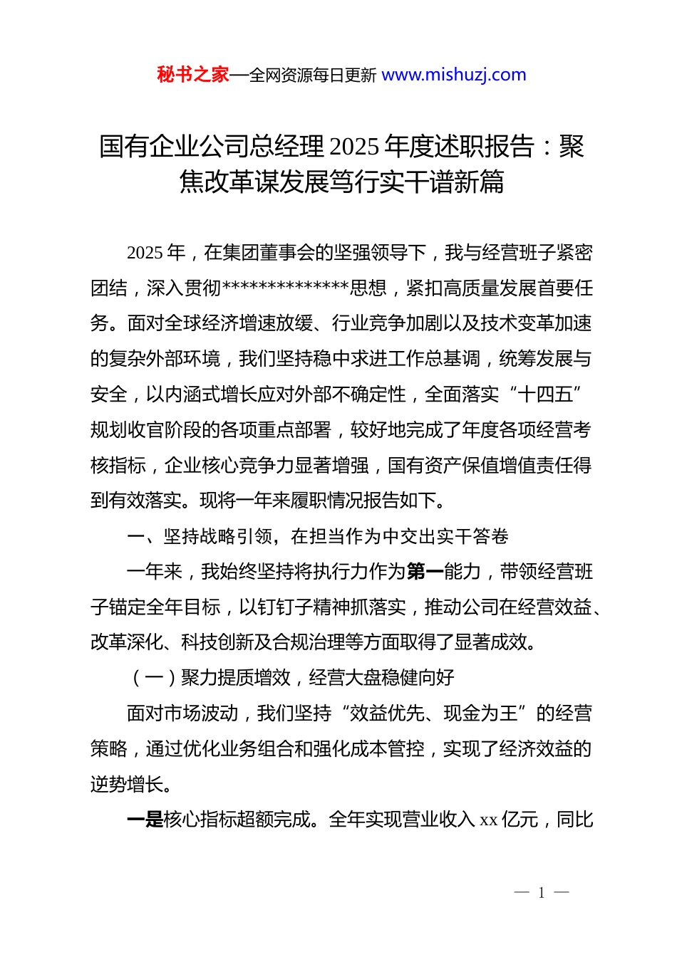 秘书之家—全网资源每日更新 www.mishuzj.com国有企业公司总经理 2025 年度述职报告:聚焦改革谋发展笃行实干谱新篇2025 年,在集团董事会的坚强领导下,我与经营班子紧密团结,深入贯彻**************思想,紧扣高质量发展首要任务。面对全球经济增速放缓、行业竞争加剧以及技术变革加速的复杂外部环境,我们坚持稳中求进工作总基调,统筹发展与安全,以内涵式增长应对外部不确定性,全面落实“十四五”规划收官阶段的各项重点部署,较好地完成了年度各项经营考核指标,企业核心竞争力显著增强,国有资产保值增值责任得到有效落实。现将一年来履职情况报告如下。一、坚持战略引领,在担当作为中交出实干答卷一年来,我始终坚持将执行力作为第一能力,带领经营班子锚定全年目标,以钉钉子精神抓落实,推动公司在经营效益、改革深化、科技创新及合规治理等方面取得了显著成效。(一)聚力提质增效,经营大盘稳健向好面对市场波动,我们坚持“效益优先、现金为王”的经营策略,通过优化业务组合和强化成本管控,实现了经济效益的逆势增长。一是核心指标超额完成。全年实现营业收入 xx 亿元,同比— 1 —秘书之家—全网资源每日更新 www.mishuzj.com增长 8.5%;实现利润总额 xx 亿元,同比增长 10.2%;净资产收益率(roe)达到 xx%,较上年提升 0.8 个百分点。全员劳动生产率达到 xx 万元/人,同比优化 6%,经济运行质量持续处于行业第一梯队。二是市场拓展成效显著。深入实施“大客户”战略,全年新签合同额 xx 亿元。稳步推进全国化布局,华东、华南两大核心区域业绩贡献率稳固在 60%以上,西部及北部新兴市场增长率超过 15%。成功中标 xx 重点工程及 xx 国家级示范项目,品牌影响力进一步扩大。三是成本管控精准有力。全面推行全价值链成本管理,开展“降本增效”专项行动。通过供应链集采优化、生产工艺改进及管理费用压降,全年可控费用同比下降 5.4%,采购成本降低 xx 万元。特别是在能源消耗方面,通过引入数字化能管系统,单位产值能耗同比下降 3.2%,实现了经济效益与绿色发展的双赢。(二)深化机制改革,内生动力持续迸发坚决落实国企改革深化提升行动部署,着力破解体制机制障碍,推动中国特色现代企业制度优势转化为治理效能。一是任期制契约化管理刚性兑现。全面深化经理层成员任期制和契约化管理,以业绩论英雄。2025 年,对下属 xx 家子分— 2 —秘书之家—全网资源每日更新 www.mishuzj.com公司经营班子实现了“一人一表”的差异化考核,将战略指标、经营指标与个人绩效紧密挂钩。严格执行刚性兑现,年度绩效薪酬差倍级达到 1.8 倍,真正实现了“干部能上能下、收入能增能减”。二是组织效能大幅提升。针对管理链条长、决策效率低的问题,实施了扁平化组织变革。将原有的职能部门精简整合为xx 个中心,管理层级压缩至三级以内。推行“大部制”运作模式,强化中台赋能作用,审批流程节点平均减少 20%,跨部门协作效率显著提升,有效解决了部门墙和推诿扯皮现象。三是三项制度改革向纵深推进。深化用工市场化改革,公开招聘比例达到 100%。建立健全全员绩效考核体系,实施末等调整和不胜任退出机制,全年共有 xx 名管理人员因考核不合格进行岗位调整或退出,员工队伍活力得到有效激发。(三)强化创新驱动,新质生产力加速形成坚持把科技创新作为引领发展的第一动力,围绕产业链部署创新链,加快培育新质生产力,为公司长远发展积蓄动能。一是研发投入强度持续加大。2025 年研发投入达到 xx 亿元,占营业收入比重提升至 4.2%。新增设立 xx 个专项研发基金,重点支持关键核心技术攻关。全年申请专利 xx 项,其中发明专利 xx 项,新增软件著作权 xx 项,主编或参编国家及行业标准— 3 —秘书之家—全网资源每日更新 www.mishuzj.comxx 项,技术护城河进一步加宽。二是关键核心技术取得突破。聚焦行业“卡脖子”难题,推行“揭榜挂帅”机制,集聚内部优势资源攻坚。在 xx 技术领域取得重大突破,成功研发出具有自主知识产权的 xx 产品,填补了国内市场空白,并在 xx 项目中实现首台套应用,不仅降低了...