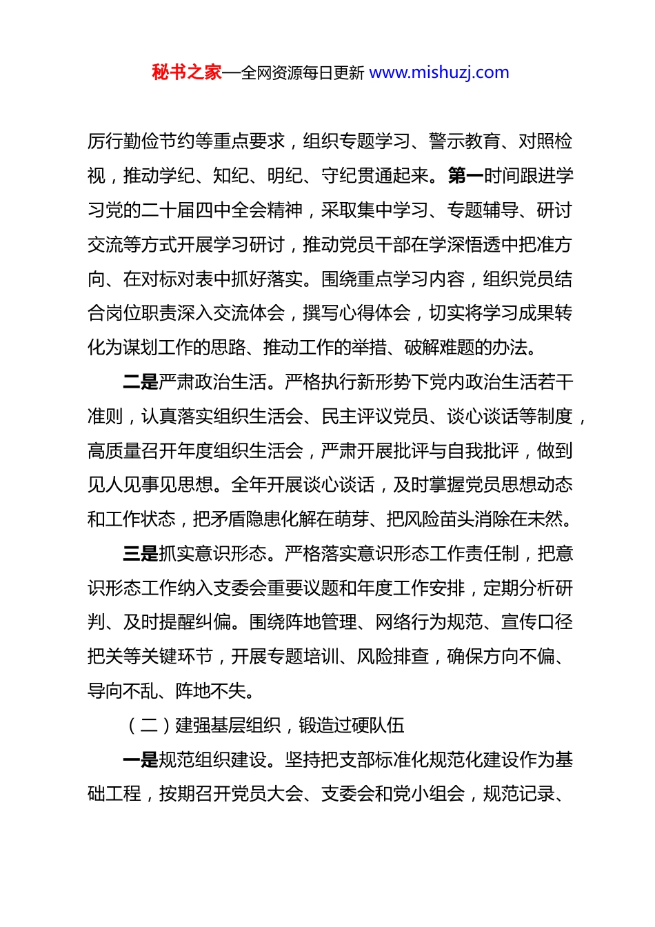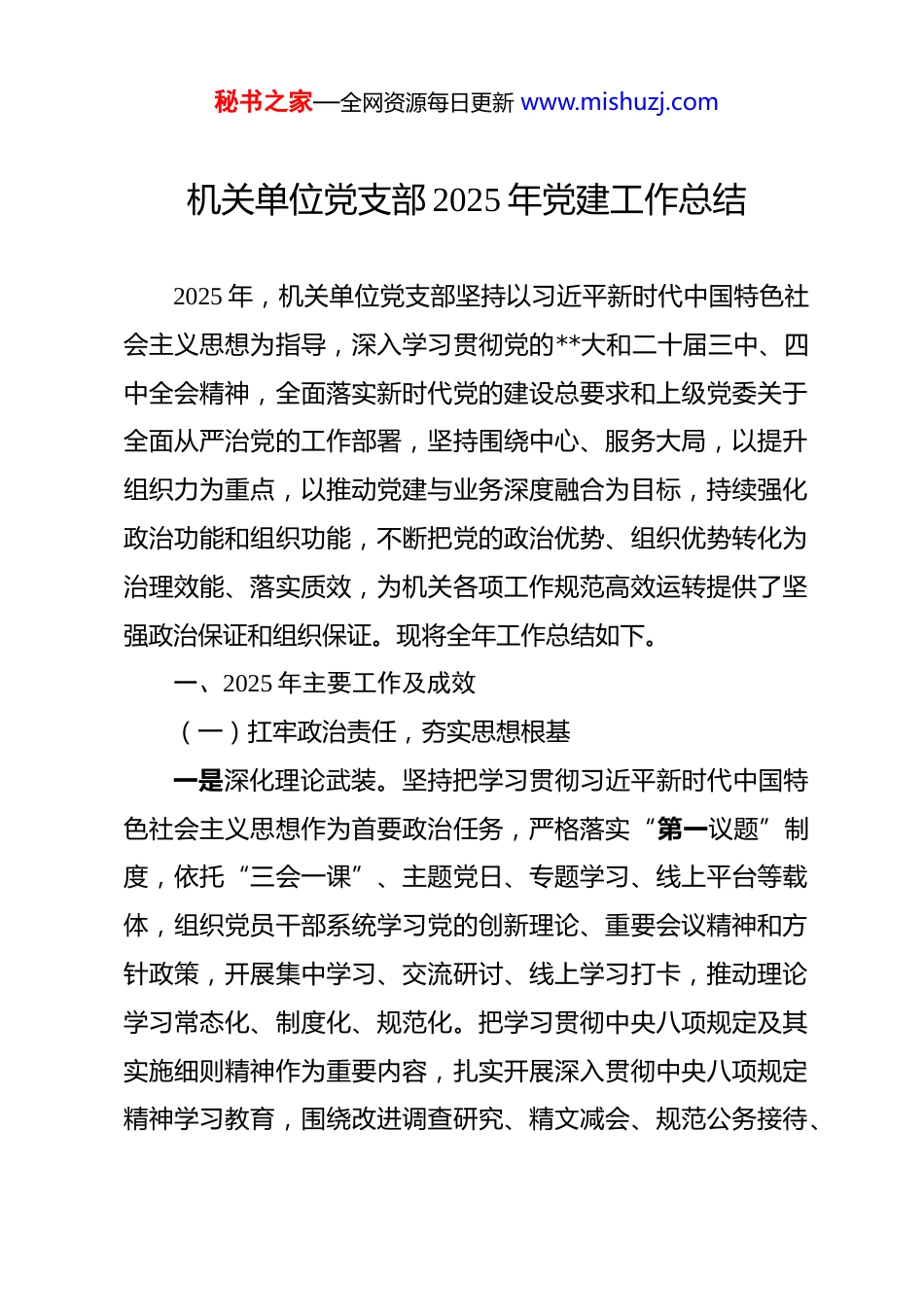 秘书之家—全网资源每日更新 www.mishuzj.com机关单位党支部 2025 年党建工作总结 2025 年,机关单位党支部坚持以习近平新时代中国特色社会主义思想为指导,深入学习贯彻党的**大和二十届三中、四中全会精神,全面落实新时代党的建设总要求和上级党委关于全面从严治党的工作部署,坚持围绕中心、服务大局,以提升组织力为重点,以推动党建与业务深度融合为目标,持续强化政治功能和组织功能,不断把党的政治优势、组织优势转化为治理效能、落实质效,为机关各项工作规范高效运转提供了坚强政治保证和组织保证。现将全年工作总结如下。一、2025 年主要工作及成效(一)扛牢政治责任,夯实思想根基一是深化理论武装。坚持把学习贯彻习近平新时代中国特色社会主义思想作为首要政治任务,严格落实“第一议题”制度,依托“三会一课”、主题党日、专题学习、线上平台等载体,组织党员干部系统学习党的创新理论、重要会议精神和方针政策,开展集中学习、交流研讨、线上学习打卡,推动理论学习常态化、制度化、规范化。把学习贯彻中央八项规定及其实施细则精神作为重要内容,扎实开展深入贯彻中央八项规定精神学习教育,围绕改进调查研究、精文减会、规范公务接待、秘书之家—全网资源每日更新 www.mishuzj.com厉行勤俭节约等重点要求,组织专题学习、警示教育、对照检视,推动学纪、知纪、明纪、守纪贯通起来。第一时间跟进学习党的二十届四中全会精神,采取集中学习、专题辅导、研讨交流等方式开展学习研讨,推动党员干部在学深悟透中把准方向、在对标对表中抓好落实。围绕重点学习内容,组织党员结合岗位职责深入交流体会,撰写心得体会,切实将学习成果转化为谋划工作的思路、推动工作的举措、破解难题的办法。二是严肃政治生活。严格执行新形势下党内政治生活若干准则,认真落实组织生活会、民主评议党员、谈心谈话等制度,高质量召开年度组织生活会,严肃开展批评与自我批评,做到见人见事见思想。全年开展谈心谈话,及时掌握党员思想动态和工作状态,把矛盾隐患化解在萌芽、把风险苗头消除在未然。三是抓实意识形态。严格落实意识形态工作责任制,把意识形态工作纳入支委会重要议题和年度工作安排,定期分析研判、及时提醒纠偏。围绕阵地管理、网络行为规范、宣传口径把关等关键环节,开展专题培训、风险排查,确保方向不偏、导向不乱、阵地不失。(二)建强基层组织,锻造过硬队伍一是规范组织建设。坚持把支部标准化规范化建设作为基础工程,按期召开党员大会、支委会和党小组会,规范记录、秘书之家—全网资源每日更新 www.mishuzj.com规范议题、规范程序,做到应开尽开、应学尽学、应议尽议。结合工作实际优化党小组设置,推动组织设置更科学、工作运行更顺畅、责任链条更清晰。二是严把党员入口。严格党员发展程序,严把政治关、质量关、程序关,突出一线、突出骨干、突出表现,全年按计划培养入党积极分子**名,发展预备党员**名,按期转正**名,为党员队伍补充“源头活水”。同步抓实党员教育管理,完善台账管理、纪实管理、日常管理,推动党员队伍建设更加有序有力。三是强化支委带动。注重提升支部委员履职能力,围绕组织生活规范、党建与业务融合、党员教育管理等内容开展专题培训**次。支部书记认真履行第一责任人职责,班子成员落实“一岗双责”,做到重要工作亲自部署、重点任务亲自推动、关键环节亲自把关,形成齐抓共管、同题共答的工作格局。(三)创新活动载体,激发组织活力一是精心组织主题党日。坚持把主题党日作为“固定动作”做扎实,全年组织开展主题党日**次,突出政治性、仪式感和实效性,围绕党性教育、纪律教育、岗位建功等主题,采取现场教学、专题党课、案例剖析、志愿服务等方式,让党员在参与中受教育、在体验中强党性。秘书之家—全网资源每日更新 www.mishuzj.com二是突出红色教育浸润。用好本地红色资源和机关教育阵地,组织党员参观学习**次,邀请先进典型、老党员讲党课**次,开展“微党课”“微分享”**期,以“短、实、新”的方式讲清理论、讲透要求、讲到心里,不断增强教育的感染力和穿透力。围绕重大纪念节点,组织党员干部集中...