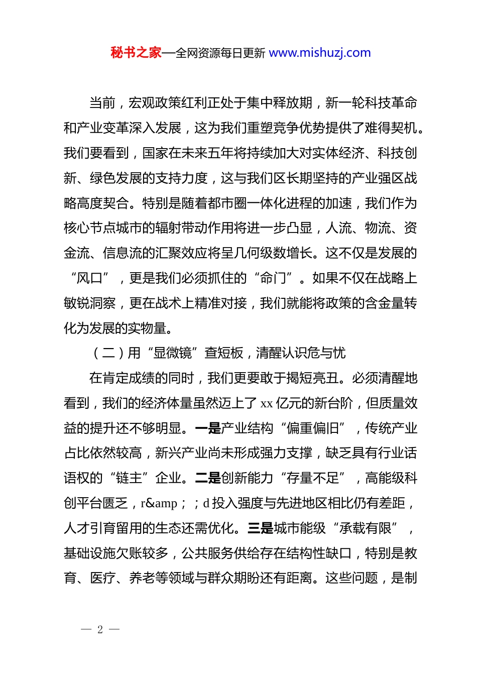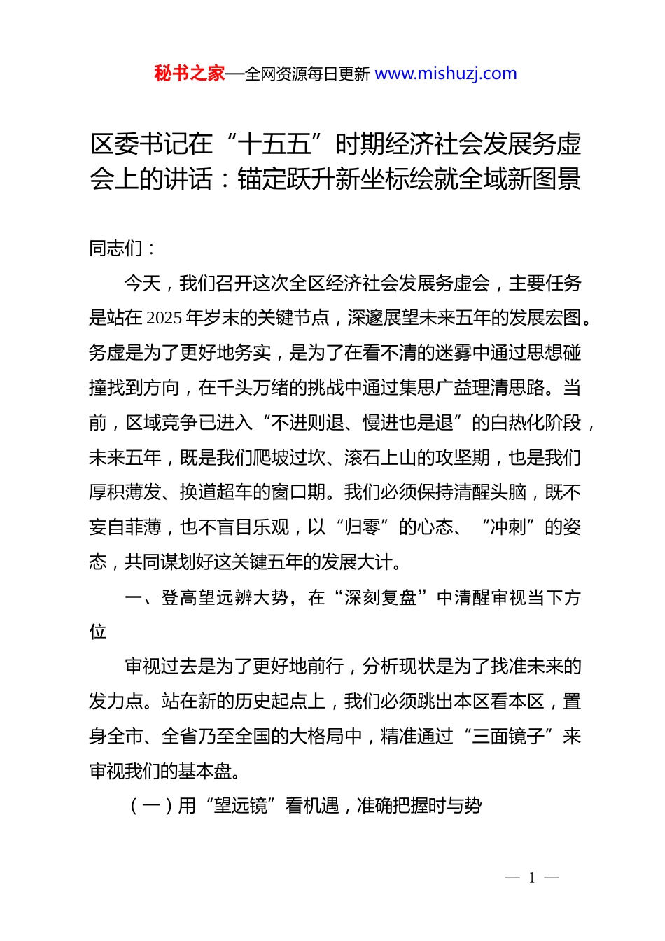 秘书之家—全网资源每日更新 www.mishuzj.com区委书记在“十五五”时期经济社会发展务虚会上的讲话:锚定跃升新坐标绘就全域新图景同志们:今天,我们召开这次全区经济社会发展务虚会,主要任务是站在 2025 年岁末的关键节点,深邃展望未来五年的发展宏图。务虚是为了更好地务实,是为了在看不清的迷雾中通过思想碰撞找到方向,在千头万绪的挑战中通过集思广益理清思路。当前,区域竞争已进入“不进则退、慢进也是退”的白热化阶段,未来五年,既是我们爬坡过坎、滚石上山的攻坚期,也是我们厚积薄发、换道超车的窗口期。我们必须保持清醒头脑,既不妄自菲薄,也不盲目乐观,以“归零”的心态、“冲刺”的姿态,共同谋划好这关键五年的发展大计。一、登高望远辨大势,在“深刻复盘”中清醒审视当下方位审视过去是为了更好地前行,分析现状是为了找准未来的发力点。站在新的历史起点上,我们必须跳出本区看本区,置身全市、全省乃至全国的大格局中,精准通过“三面镜子”来审视我们的基本盘。(一)用“望远镜”看机遇,准确把握时与势— 1 —秘书之家—全网资源每日更新 www.mishuzj.com当前,宏观政策红利正处于集中释放期,新一轮科技革命和产业变革深入发展,这为我们重塑竞争优势提供了难得契机。我们要看到,国家在未来五年将持续加大对实体经济、科技创新、绿色发展的支持力度,这与我们区长期坚持的产业强区战略高度契合。特别是随着都市圈一体化进程的加速,我们作为核心节点城市的辐射带动作用将进一步凸显,人流、物流、资金流、信息流的汇聚效应将呈几何级数增长。这不仅是发展的“风口”,更是我们必须抓住的“命门”。如果不仅在战略上敏锐洞察,更在战术上精准对接,我们就能将政策的含金量转化为发展的实物量。(二)用“显微镜”查短板,清醒认识危与忧在肯定成绩的同时,我们更要敢于揭短亮丑。必须清醒地看到,我们的经济体量虽然迈上了 xx 亿元的新台阶,但质量效益的提升还不够明显。一是产业结构“偏重偏旧”,传统产业占比依然较高,新兴产业尚未形成强力支撑,缺乏具有行业话语权的“链主”企业。二是创新能力“存量不足”,高能级科创平台匮乏,r&;;d 投入强度与先进地区相比仍有差距,人才引育留用的生态还需优化。三是城市能级“承载有限”,基础设施欠账较多,公共服务供给存在结构性缺口,特别是教育、医疗、养老等领域与群众期盼还有距离。这些问题,是制— 2 —秘书之家—全网资源每日更新 www.mishuzj.com约我们未来五年发展的“拦路虎”,必须以壮士断腕的决心加以解决。(三)用“透视镜”找潜能,坚定增强底与气虽然面临诸多挑战,但我们发展的韧性强、潜力大、后劲足的基本面没有改变。这种底气来自于我们拥有一支敢打硬仗、善作善成的干部队伍,来自于全区 xx 万人民群众对美好生活的强烈向往和创业激情。特别是经过前一阶段的蓄势聚能,一批百亿级重大项目即将竣工投产,一批重点改革事项正在释放红利,区域营商环境持续优化,市场主体活力显著增强。只要我们保持战略定力,集中精力办好自己的事,就一定能在激烈的区域竞争中突围而出,实现从“跟跑”到“并跑”甚至“领跑”的跨越。二、换道超车谋胜势,在“破立并举”中重塑区域核心动能未来五年,发展的核心逻辑将从“要素驱动”转向“创新驱动”,从“规模扩张”转向“内涵提升”。我们必须坚持以经济建设为中心,以高质量发展为首要任务,全力打好产业升级、创新驱动、改革开放“三场硬仗”。(一)聚焦“集群强链”,构建现代产业体系新支柱产业是区域经济的命脉,没有产业的支撑,发展就是空中— 3 —秘书之家—全网资源每日更新 www.mishuzj.com楼阁。我们要坚定不移实施“工业立区、制造强区”战略,推动产业链条向中高端迈进。要围绕现有的优势产业,通过“补链”补齐短板、“延链”延长价值、“强链”增强韧性,打造若干个具有全国影响力的千亿级产业集群。同时,要抢滩布局未来产业,瞄准人工智能、低空经济、生命健康等新赛道,培育一批专精特新“小巨人”企业和单项冠军企业。要像爱护眼睛一样爱护企业,建立全生命周期的服务机制,让大企业“顶天立地...