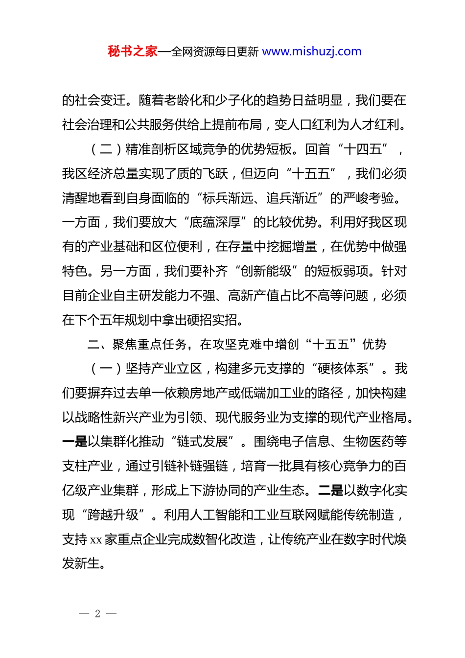 秘书之家—全网资源每日更新 www.mishuzj.com区委书记在“十五五”时期经济社会发展务虚会上的讲话:前瞻布局谋划发展新篇,实干担当绘就区域蓝图同志们:在“十四五”规划即将收官、跨越起步的关键节点,我们齐聚一堂召开这次务虚会,主要任务是深入贯彻落实*中央关于编制“十五五”规划的指示精神,集思广益、群策群力,科学绘制我区未来五年的发展底色。刚才,各位常委、副区长以及相关部门负责同志紧扣国家战略导向,结合区情实际,谈了许多有深度、有远见、有操作性的建议,听后深受启发。务虚是为了更好地务实,看清了大势,我们脚下的路才能走得更稳、更远。下面,我讲几点意见。一、科学研判形势,在把握大局中找准“十五五”航向(一)深刻领会宏观环境的深刻变化。当前,世界百年未有之大变局加速演进,我国正处于战略机遇和风险挑战并存的关键期,我们要保持战略定力,在复杂多变的局势中寻觅转机。一是紧跟“新质生产力”的政策指向。要深刻认识到未来五年是产业变革的质变期,必须将科技创新作为区域发展的逻辑起点,推动产业链与创新链深度融合。二是应对“人口结构化”— 1 —秘书之家—全网资源每日更新 www.mishuzj.com的社会变迁。随着老龄化和少子化的趋势日益明显,我们要在社会治理和公共服务供给上提前布局,变人口红利为人才红利。(二)精准剖析区域竞争的优势短板。回首“十四五”,我区经济总量实现了质的飞跃,但迈向“十五五”,我们必须清醒地看到自身面临的“标兵渐远、追兵渐近”的严峻考验。一方面,我们要放大“底蕴深厚”的比较优势。利用好我区现有的产业基础和区位便利,在存量中挖掘增量,在优势中做强特色。另一方面,我们要补齐“创新能级”的短板弱项。针对目前企业自主研发能力不强、高新产值占比不高等问题,必须在下个五年规划中拿出硬招实招。二、聚焦重点任务,在攻坚克难中增创“十五五”优势(一)坚持产业立区,构建多元支撑的“硬核体系”。我们要摒弃过去单一依赖房地产或低端加工业的路径,加快构建以战略性新兴产业为引领、现代服务业为支撑的现代产业格局。一是以集群化推动“链式发展”。围绕电子信息、生物医药等支柱产业,通过引链补链强链,培育一批具有核心竞争力的百亿级产业集群,形成上下游协同的产业生态。二是以数字化实现“跨越升级”。利用人工智能和工业互联网赋能传统制造,支持 xx 家重点企业完成数智化改造,让传统产业在数字时代焕发新生。— 2 —秘书之家—全网资源每日更新 www.mishuzj.com(二)坚持创新驱动,点燃转型发展的“科技引擎”。要把创新摆在区域发展的核心位置,让创新人才留得住、创新成果转得出、创新企业长得大。一是搭建“家门口”的研发平台。支持驻区高校、科研院所与企业共建联合实验室,力争五年内新增省级以上创新平台 xx 个,打通科技成果转化的最后一百米。二是营造“全链条”的孵化环境。完善从众创空间到科技企业孵化器、加速器的全生命周期服务体系,通过设立政府引导基金,缓解初创型科技企业的融资难题。(三)坚持城乡融合,绘就美美与共的“斑斓画卷”。我们要统筹好城市更新与乡村振兴,推动基础设施向基层延伸,让发展的成果惠及每一寸土地。一是实施“品质提升”的城市更新。加快老旧小区改造和背街小巷治理,建设一批口袋公园和城市书房,让城市不仅有高度,更有温度。二是打造“各具特色”的乡村样板。立足各镇街自然禀赋,发展乡村旅游和特色农业,通过建设 xx 条美丽乡村精品线路,让乡村成为令人向往的诗和远方。三、强化组织保障,在真抓实干中书写“十五五”答卷(一)提升干事创业的专业素养。面对“十五五”期间可能出现的新情况、新课题,全区干部要告别经验主义,不断更新知识结构,增强驾驭市场经济和处理复杂矛盾的本领。一方— 3 —秘书之家—全网资源每日更新 www.mishuzj.com面,要培养“识变应变”的敏锐感知。各级领导干部要深入研究产业前沿动态,做到谈经济有思路、谈项目有专业,成为各自领域的行家里手。另一方面,要厚植“攻坚克难”的斗争精神。在处理历史遗留问题和推进重大改革任务时,要敢于动真碰硬,不推诿、不退缩。(...