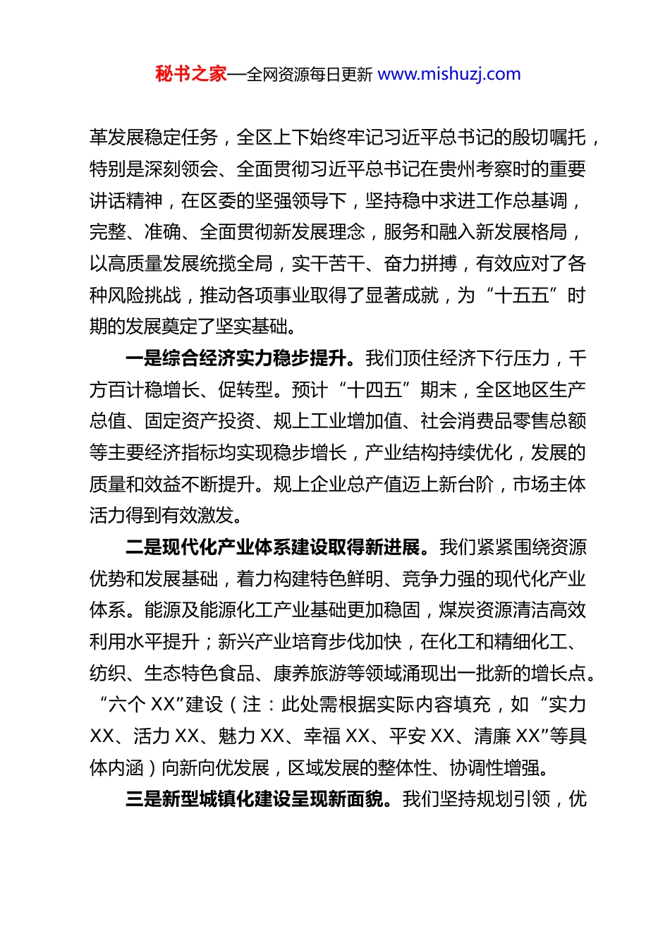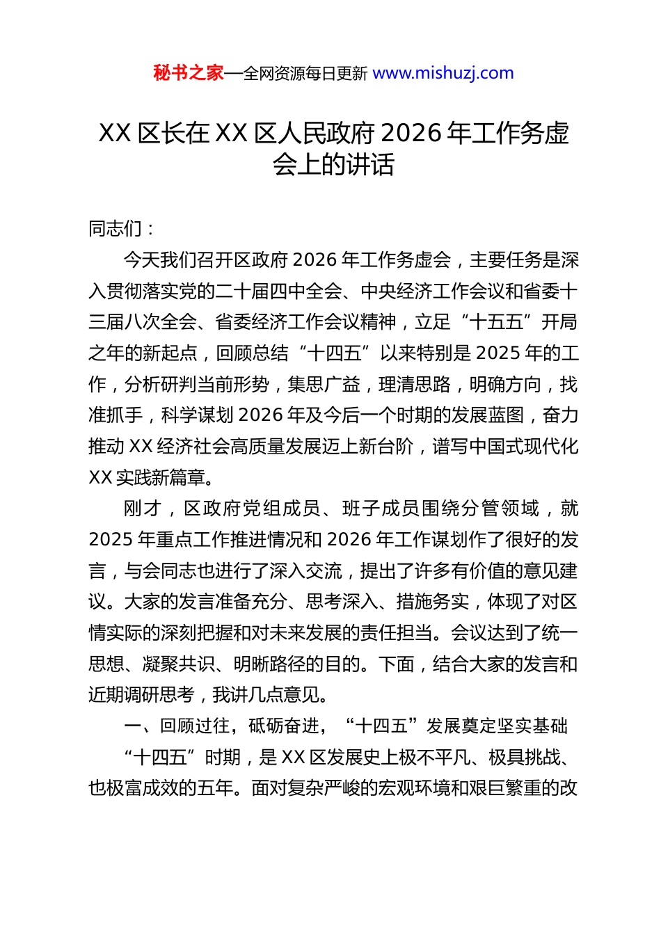 秘书之家—全网资源每日更新 www.mishuzj.comXX 区长在 XX 区人民政府 2026 年工作务虚会上的讲话同志们:今天我们召开区政府 2026 年工作务虚会,主要任务是深入贯彻落实党的二十届四中全会、中央经济工作会议和省委十三届八次全会、省委经济工作会议精神,立足“十五五”开局之年的新起点,回顾总结“十四五”以来特别是 2025 年的工作,分析研判当前形势,集思广益,理清思路,明确方向,找准抓手,科学谋划 2026 年及今后一个时期的发展蓝图,奋力推动 XX 经济社会高质量发展迈上新台阶,谱写中国式现代化XX 实践新篇章。刚才,区政府党组成员、班子成员围绕分管领域,就2025 年重点工作推进情况和 2026 年工作谋划作了很好的发言,与会同志也进行了深入交流,提出了许多有价值的意见建议。大家的发言准备充分、思考深入、措施务实,体现了对区情实际的深刻把握和对未来发展的责任担当。会议达到了统一思想、凝聚共识、明晰路径的目的。下面,结合大家的发言和近期调研思考,我讲几点意见。一、回顾过往,砥砺奋进,“十四五”发展奠定坚实基础“十四五”时期,是 XX 区发展史上极不平凡、极具挑战、也极富成效的五年。面对复杂严峻的宏观环境和艰巨繁重的改秘书之家—全网资源每日更新 www.mishuzj.com革发展稳定任务,全区上下始终牢记习近平总书记的殷切嘱托,特别是深刻领会、全面贯彻习近平总书记在贵州考察时的重要讲话精神,在区委的坚强领导下,坚持稳中求进工作总基调,完整、准确、全面贯彻新发展理念,服务和融入新发展格局,以高质量发展统揽全局,实干苦干、奋力拼搏,有效应对了各种风险挑战,推动各项事业取得了显著成就,为“十五五”时期的发展奠定了坚实基础。一是综合经济实力稳步提升。我们顶住经济下行压力,千方百计稳增长、促转型。预计“十四五”期末,全区地区生产总值、固定资产投资、规上工业增加值、社会消费品零售总额等主要经济指标均实现稳步增长,产业结构持续优化,发展的质量和效益不断提升。规上企业总产值迈上新台阶,市场主体活力得到有效激发。二是现代化产业体系建设取得新进展。我们紧紧围绕资源优势和发展基础,着力构建特色鲜明、竞争力强的现代化产业体系。能源及能源化工产业基础更加稳固,煤炭资源清洁高效利用水平提升;新兴产业培育步伐加快,在化工和精细化工、纺织、生态特色食品、康养旅游等领域涌现出一批新的增长点。“六个 XX”建设(注:此处需根据实际内容填充,如“实力XX、活力 XX、魅力 XX、幸福 XX、平安 XX、清廉 XX”等具体内涵)向新向优发展,区域发展的整体性、协调性增强。三是新型城镇化建设呈现新面貌。我们坚持规划引领,优秘书之家—全网资源每日更新 www.mishuzj.com化空间布局,城市框架有序拉开,基础设施日益完善。城市更新行动扎实推进,一批老旧小区、背街小巷焕发新颜。“五大专项行动”持续深化,城市管理精细化、智慧化水平有所提高。旅居城市、智慧城市建设的谋划布局开始起步,城市综合承载能力和吸引力不断增强。四是民生社会事业实现新改善。我们始终坚持以人民为中心的发展思想,持续加大民生投入。教育、医疗卫生、社会保障、就业创业、交通水利等公共服务体系更加健全,一批群众急难愁盼问题得到有效解决。脱贫攻坚成果巩固拓展,乡村振兴战略扎实推进,城乡居民收入差距逐步缩小,人民群众的获得感、幸福感、安全感更加充实、更有保障、更可持续。五是改革开放创新焕发新活力。我们着力破解体制机制障碍,重点领域改革纵深推进,营商环境持续优化。“放管服”改革取得新成效,市场主体办事更加便捷高效。对外开放合作水平提升,招商引资成果丰硕。科技创新对产业发展的支撑作用逐步显现,新质生产力的培育开始破题。六是安全发展屏障筑牢新支撑。我们统筹发展和安全,有效防范化解各类风险隐患。安全生产形势保持稳定,社会治理效能不断提升,平安 XX 建设迈出坚实步伐。生态环境质量持续改善,绿色低碳发展理念深入人心。这些成绩的取得,最根本在于于以习近平同志为核心的党中央坚强领导和习近平新时代中国特色社会主义思想的科学指秘书之家—全网资...