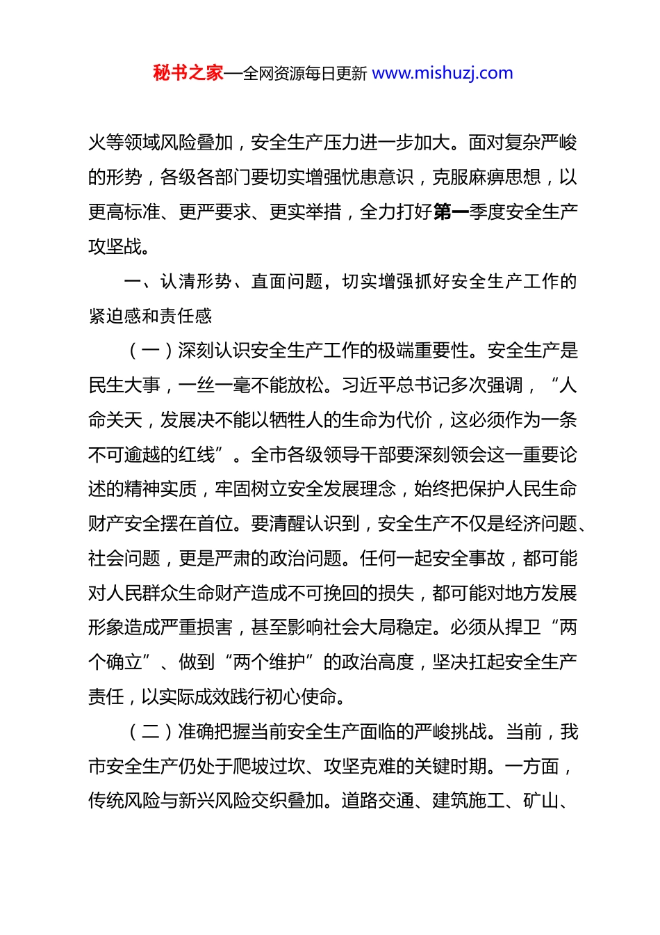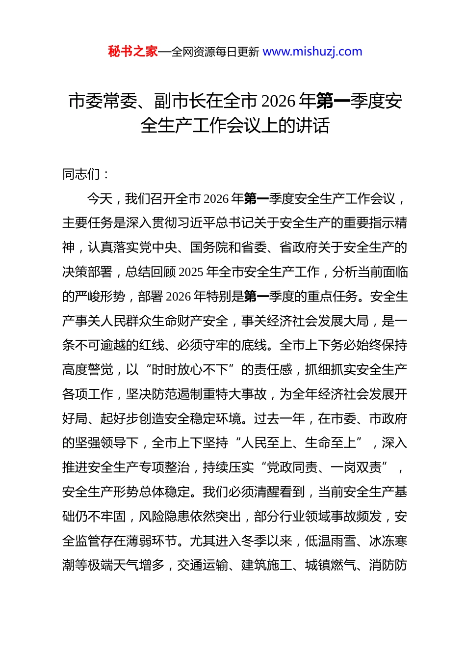 秘书之家—全网资源每日更新 www.mishuzj.com市委常委、副市长在全市 2026 年第一季度安全生产工作会议上的讲话 同志们:今天,我们召开全市 2026 年第一季度安全生产工作会议,主要任务是深入贯彻习近平总书记关于安全生产的重要指示精神,认真落实党中央、国务院和省委、省政府关于安全生产的决策部署,总结回顾 2025 年全市安全生产工作,分析当前面临的严峻形势,部署 2026 年特别是第一季度的重点任务。安全生产事关人民群众生命财产安全,事关经济社会发展大局,是一条不可逾越的红线、必须守牢的底线。全市上下务必始终保持高度警觉,以“时时放心不下”的责任感,抓细抓实安全生产各项工作,坚决防范遏制重特大事故,为全年经济社会发展开好局、起好步创造安全稳定环境。过去一年,在市委、市政府的坚强领导下,全市上下坚持“人民至上、生命至上”,深入推进安全生产专项整治,持续压实“党政同责、一岗双责”,安全生产形势总体稳定。我们必须清醒看到,当前安全生产基础仍不牢固,风险隐患依然突出,部分行业领域事故频发,安全监管存在薄弱环节。尤其进入冬季以来,低温雨雪、冰冻寒潮等极端天气增多,交通运输、建筑施工、城镇燃气、消防防秘书之家—全网资源每日更新 www.mishuzj.com火等领域风险叠加,安全生产压力进一步加大。面对复杂严峻的形势,各级各部门要切实增强忧患意识,克服麻痹思想,以更高标准、更严要求、更实举措,全力打好第一季度安全生产攻坚战。一、认清形势、直面问题,切实增强抓好安全生产工作的紧迫感和责任感(一)深刻认识安全生产工作的极端重要性。安全生产是民生大事,一丝一毫不能放松。习近平总书记多次强调,“人命关天,发展决不能以牺牲人的生命为代价,这必须作为一条不可逾越的红线”。全市各级领导干部要深刻领会这一重要论述的精神实质,牢固树立安全发展理念,始终把保护人民生命财产安全摆在首位。要清醒认识到,安全生产不仅是经济问题、社会问题,更是严肃的政治问题。任何一起安全事故,都可能对人民群众生命财产造成不可挽回的损失,都可能对地方发展形象造成严重损害,甚至影响社会大局稳定。必须从捍卫“两个确立”、做到“两个维护”的政治高度,坚决扛起安全生产责任,以实际成效践行初心使命。(二)准确把握当前安全生产面临的严峻挑战。当前,我市安全生产仍处于爬坡过坎、攻坚克难的关键时期。一方面,传统风险与新兴风险交织叠加。道路交通、建筑施工、矿山、秘书之家—全网资源每日更新 www.mishuzj.com危化品等传统高危行业风险存量尚未根本消除,而新能源、新业态等领域的安全风险逐步显现;另一方面,季节性风险与结构性矛盾并存:第一季度历来是事故高发期,春运保障、复工复产、极端天气等因素加剧风险复杂性,同时部分企业主体责任落实不到位、基层监管能力不足、执法检查“宽松软”等问题依然突出。从近期督查情况看,一些地区隐患排查流于形式,问题整改不彻底,甚至出现“屡查屡犯”现象。对此,必须保持高度警惕,绝不能有丝毫侥幸心理。(三)坚决扭转被动局面,守住安全生产底线。面对严峻形势,各级各部门要以“如履薄冰”的警觉性和“寝食难安”的责任心,全力以赴防风险、保安全、护稳定。要坚决摒弃“重发展、轻安全”的错误政绩观,坚决纠正“事后处理、被动应对”的惯性思维,坚决打击执法检查中的“好人主义”和形式主义。要坚持问题导向,深刻汲取国内外重大事故教训,举一反三,堵塞漏洞。特别是针对第一季度特点,要聚焦重点行业、重点区域、重点环节,采取超常规措施,严防死守,确保安全生产形势持续稳定向好,为全年工作奠定坚实基础。二、聚焦重点、精准发力,全面抓好第一季度安全生产各项工作(一)深入推进安全生产专项整治行动。要持续深化安全秘书之家—全网资源每日更新 www.mishuzj.com生产专项整治三年行动成果,围绕“巩固提升”主题,聚焦重点行业领域开展针对性治理。道路交通领域要严格落实“七个必须、七个一律”工作要求,加强“两客一危一货”车辆监管,严查“三超一疲劳”等违法行为,强化雨雪冰冻天气路面管控和应急疏导;建筑施工领域要突出深基坑...