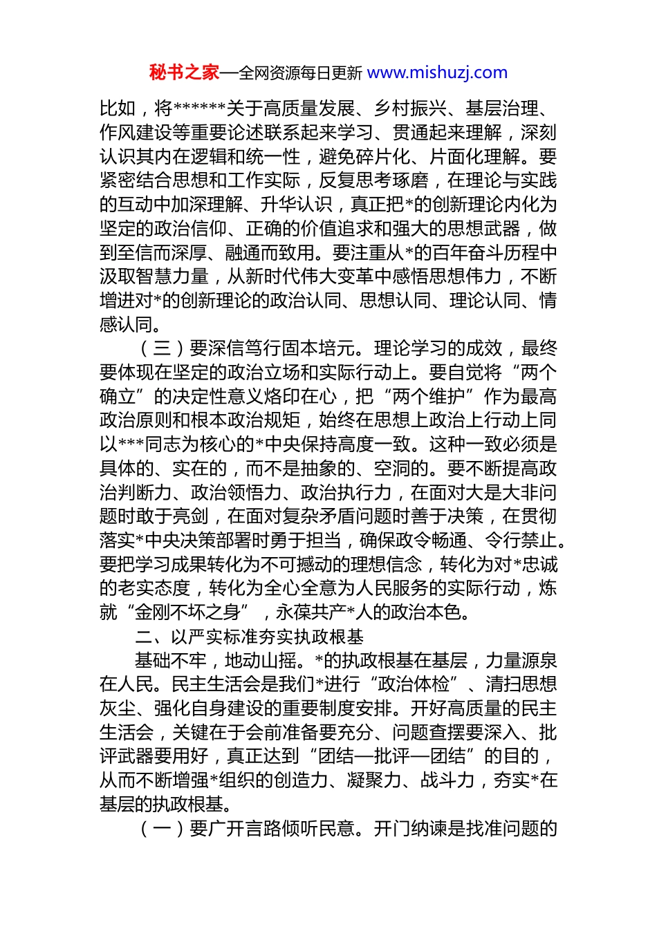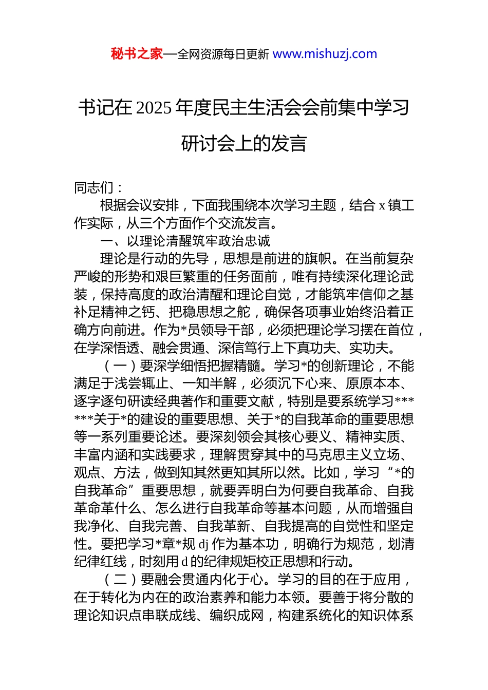 秘书之家—全网资源每日更新 www.mishuzj.com书记在 2025 年度民主生活会会前集中学习研讨会上的发言同志们:根据会议安排,下面我围绕本次学习主题,结合 x 镇工作实际,从三个方面作个交流发言。一、以理论清醒筑牢政治忠诚理论是行动的先导,思想是前进的旗帜。在当前复杂严峻的形势和艰巨繁重的任务面前,唯有持续深化理论武装,保持高度的政治清醒和理论自觉,才能筑牢信仰之基补足精神之钙、把稳思想之舵,确保各项事业始终沿着正确方向前进。作为*员领导干部,必须把理论学习摆在首位,在学深悟透、融会贯通、深信笃行上下真功夫、实功夫。(一)要深学细悟把握精髓。学习*的创新理论,不能满足于浅尝辄止、一知半解,必须沉下心来、原原本本、逐字逐句研读经典著作和重要文献,特别是要系统学习******关于*的建设的重要思想、关于*的自我革命的重要思想等一系列重要论述。要深刻领会其核心要义、精神实质、丰富内涵和实践要求,理解贯穿其中的马克思主义立场、观点、方法,做到知其然更知其所以然。比如,学习“*的自我革命”重要思想,就要弄明白为何要自我革命、自我革命革什么、怎么进行自我革命等基本问题,从而增强自我净化、自我完善、自我革新、自我提高的自觉性和坚定性。要把学习*章*规 dj 作为基本功,明确行为规范,划清纪律红线,时刻用 d 的纪律规矩校正思想和行动。(二)要融会贯通内化于心。学习的目的在于应用,在于转化为内在的政治素养和能力本领。要善于将分散的理论知识点串联成线、编织成网,构建系统化的知识体系秘书之家—全网资源每日更新 www.mishuzj.com比如,将******关于高质量发展、乡村振兴、基层治理、作风建设等重要论述联系起来学习、贯通起来理解,深刻认识其内在逻辑和统一性,避免碎片化、片面化理解。要紧密结合思想和工作实际,反复思考琢磨,在理论与实践的互动中加深理解、升华认识,真正把*的创新理论内化为坚定的政治信仰、正确的价值追求和强大的思想武器,做到至信而深厚、融通而致用。要注重从*的百年奋斗历程中汲取智慧力量,从新时代伟大变革中感悟思想伟力,不断增进对*的创新理论的政治认同、思想认同、理论认同、情感认同。(三)要深信笃行固本培元。理论学习的成效,最终要体现在坚定的政治立场和实际行动上。要自觉将“两个确立”的决定性意义烙印在心,把“两个维护”作为最高政治原则和根本政治规矩,始终在思想上政治上行动上同以***同志为核心的*中央保持高度一致。这种一致必须是具体的、实在的,而不是抽象的、空洞的。要不断提高政治判断力、政治领悟力、政治执行力,在面对大是大非问题时敢于亮剑,在面对复杂矛盾问题时善于决策,在贯彻落实*中央决策部署时勇于担当,确保政令畅通、令行禁止。要把学习成果转化为不可撼动的理想信念,转化为对*忠诚的老实态度,转化为全心全意为人民服务的实际行动,炼就“金刚不坏之身”,永葆共产*人的政治本色。二、以严实标准夯实执政根基基础不牢,地动山摇。*的执政根基在基层,力量源泉在人民。民主生活会是我们*进行“政治体检”、清扫思想灰尘、强化自身建设的重要制度安排。开好高质量的民主生活会,关键在于会前准备要充分、问题查摆要深入、批评武器要用好,真正达到“团结—批评—团结”的目的,从而不断增强*组织的创造力、凝聚力、战斗力,夯实*在基层的执政根基。(一)要广开言路倾听民意。开门纳谏是找准问题的秘书之家—全网资源每日更新 www.mishuzj.com重要途径。要坚持线上线下相结合,采取设立意见箱、召开座谈会、个别访谈、新媒体平台征集等多种方式,主动深入到田间地头、企业车间、项目一线,广泛听取老*员、人大代表、政协委员、群众代表、服务对象等各方面各阶层的意见建议。不能搞形式、走过场,要真心实意地请群众提意见,敢于听真话、听刺耳的话。对征集到的意见建议,要原汁原味进行梳理归纳,尤其要重视那些反映具体问题、关乎群众切身利益的意见,建立台账,如实反馈给班子和个人,为深入查摆问题提供精准靶向。要像中医看病一样,通过“望闻问切”全面了解情况,找准病灶所在。(二)要深查细照找准病灶。查摆问题是开好...