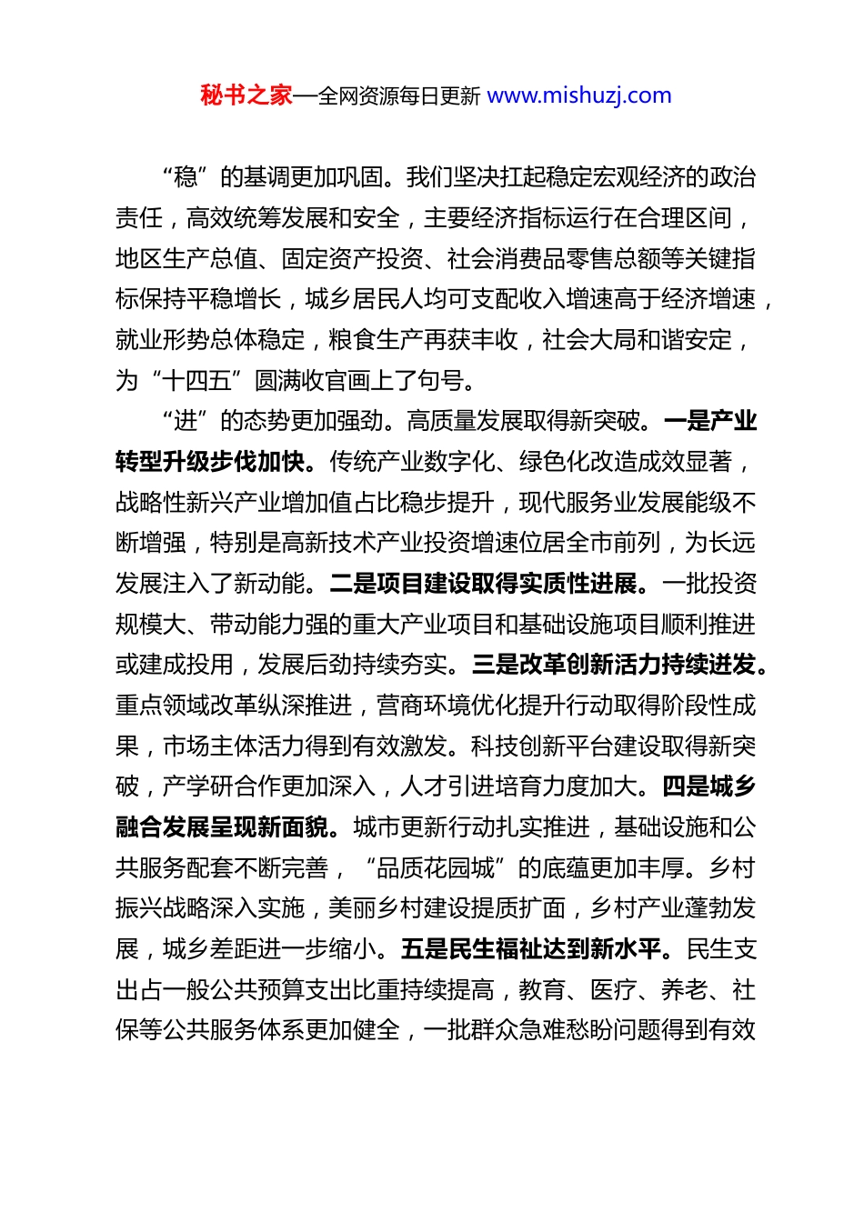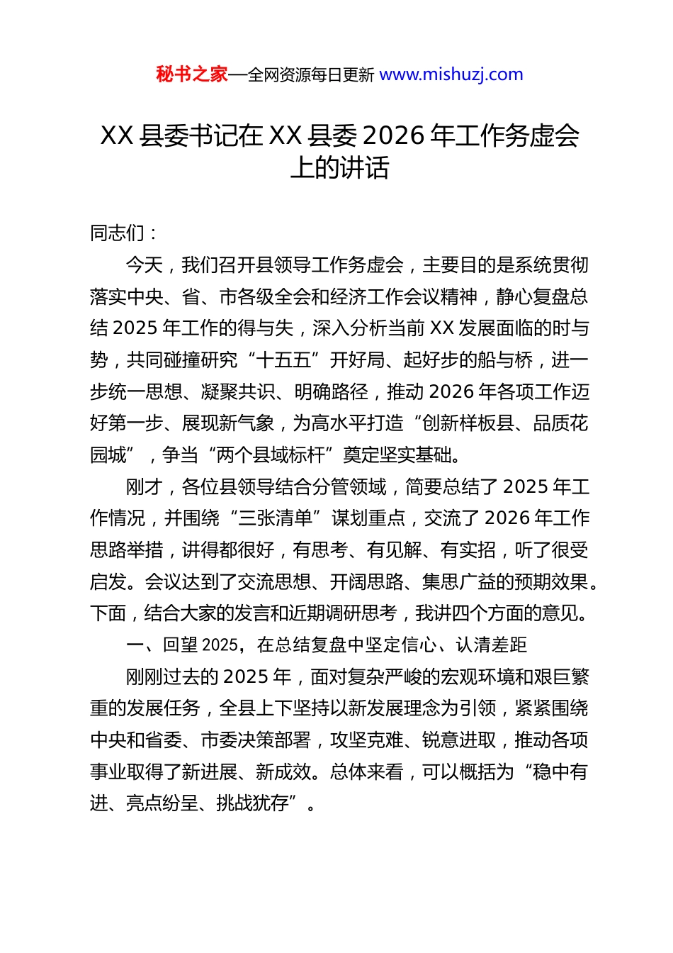 秘书之家—全网资源每日更新 www.mishuzj.comXX 县委书记在 XX 县委 2026 年工作务虚会上的讲话同志们:今天,我们召开县领导工作务虚会,主要目的是系统贯彻落实中央、省、市各级全会和经济工作会议精神,静心复盘总结 2025 年工作的得与失,深入分析当前 XX 发展面临的时与势,共同碰撞研究“十五五”开好局、起好步的船与桥,进一步统一思想、凝聚共识、明确路径,推动 2026 年各项工作迈好第一步、展现新气象,为高水平打造“创新样板县、品质花园城”,争当“两个县域标杆”奠定坚实基础。刚才,各位县领导结合分管领域,简要总结了 2025 年工作情况,并围绕“三张清单”谋划重点,交流了 2026 年工作思路举措,讲得都很好,有思考、有见解、有实招,听了很受启发。会议达到了交流思想、开阔思路、集思广益的预期效果。下面,结合大家的发言和近期调研思考,我讲四个方面的意见。一、回望 2025,在总结复盘中坚定信心、认清差距刚刚过去的 2025 年,面对复杂严峻的宏观环境和艰巨繁重的发展任务,全县上下坚持以新发展理念为引领,紧紧围绕中央和省委、市委决策部署,攻坚克难、锐意进取,推动各项事业取得了新进展、新成效。总体来看,可以概括为“稳中有进、亮点纷呈、挑战犹存”。秘书之家—全网资源每日更新 www.mishuzj.com“稳”的基调更加巩固。我们坚决扛起稳定宏观经济的政治责任,高效统筹发展和安全,主要经济指标运行在合理区间,地区生产总值、固定资产投资、社会消费品零售总额等关键指标保持平稳增长,城乡居民人均可支配收入增速高于经济增速,就业形势总体稳定,粮食生产再获丰收,社会大局和谐安定,为“十四五”圆满收官画上了句号。“进”的态势更加强劲。高质量发展取得新突破。一是产业转型升级步伐加快。传统产业数字化、绿色化改造成效显著,战略性新兴产业增加值占比稳步提升,现代服务业发展能级不断增强,特别是高新技术产业投资增速位居全市前列,为长远发展注入了新动能。二是项目建设取得实质性进展。一批投资规模大、带动能力强的重大产业项目和基础设施项目顺利推进或建成投用,发展后劲持续夯实。三是改革创新活力持续迸发。重点领域改革纵深推进,营商环境优化提升行动取得阶段性成果,市场主体活力得到有效激发。科技创新平台建设取得新突破,产学研合作更加深入,人才引进培育力度加大。四是城乡融合发展呈现新面貌。城市更新行动扎实推进,基础设施和公共服务配套不断完善,“品质花园城”的底蕴更加丰厚。乡村振兴战略深入实施,美丽乡村建设提质扩面,乡村产业蓬勃发展,城乡差距进一步缩小。五是民生福祉达到新水平。民生支出占一般公共预算支出比重持续提高,教育、医疗、养老、社保等公共服务体系更加健全,一批群众急难愁盼问题得到有效秘书之家—全网资源每日更新 www.mishuzj.com解决,人民群众的获得感、幸福感、安全感不断增强。六是党的建设得到新加强。高质量开展主题教育,干部队伍能力作风持续提升,全面从严治党向纵深推进,风清气正的政治生态不断巩固发展。“得”的经验弥足珍贵。一年的实践充分证明:必须坚持党的领导,把牢政治方向,确保各项工作始终沿着正确轨道前进;必须坚持新发展理念,紧扣高质量发展首要任务,不动摇、不偏向;必须坚持系统观念,加强前瞻性思考、全局性谋划、整体性推进;必须坚持改革创新,勇于打破路径依赖,以改革解难题、以创新增活力;必须坚持以人民为中心,把造福人民作为最重要的政绩;必须坚持实干担当,以钉钉子精神抓落实,一步一个脚印把蓝图变为现实。这些经验启示,我们要在今后工作中长期坚持并不断丰富发展。“失”的教训需要警醒。在肯定成绩的同时,我们也要清醒地看到存在的问题和不足。一是发展不平衡不充分的问题依然突出。城乡区域发展差距仍然较大,科技创新对经济增长的贡献率有待进一步提高,新兴产业规模效应尚未完全形成。二是经济回升向好的基础尚不牢固。部分行业和企业生产经营仍面临困难,有效需求不足的问题依然存在,经济结构性矛盾亟待破解。三是重点领域关键环节改革任务依然艰巨。营商环境与市场主体期待还有差距,要素市场化配...