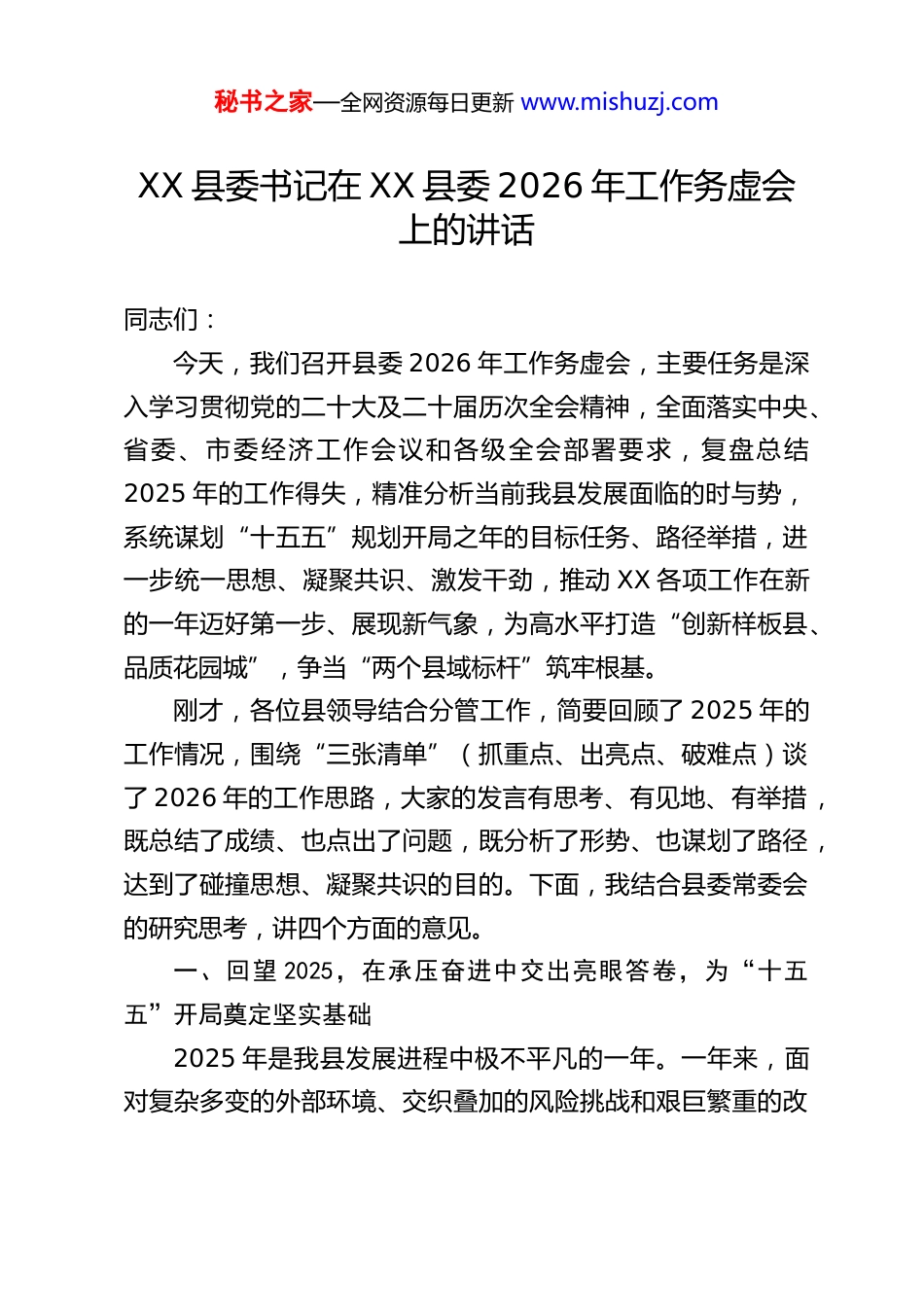 秘书之家—全网资源每日更新 www.mishuzj.comXX 县委书记在 XX 县委 2026 年工作务虚会上的讲话同志们:今天,我们召开县委 2026 年工作务虚会,主要任务是深入学习贯彻党的二十大及二十届历次全会精神,全面落实中央、省委、市委经济工作会议和各级全会部署要求,复盘总结2025 年的工作得失,精准分析当前我县发展面临的时与势,系统谋划“十五五”规划开局之年的目标任务、路径举措,进一步统一思想、凝聚共识、激发干劲,推动 XX 各项工作在新的一年迈好第一步、展现新气象,为高水平打造“创新样板县、品质花园城”,争当“两个县域标杆”筑牢根基。刚才,各位县领导结合分管工作,简要回顾了 2025 年的工作情况,围绕“三张清单”(抓重点、出亮点、破难点)谈了 2026 年的工作思路,大家的发言有思考、有见地、有举措,既总结了成绩、也点出了问题,既分析了形势、也谋划了路径,达到了碰撞思想、凝聚共识的目的。下面,我结合县委常委会的研究思考,讲四个方面的意见。一、回望 2025,在承压奋进中交出亮眼答卷,为“十五五”开局奠定坚实基础2025 年是我县发展进程中极不平凡的一年。一年来,面对复杂多变的外部环境、交织叠加的风险挑战和艰巨繁重的改秘书之家—全网资源每日更新 www.mishuzj.com革发展稳定任务,全县上下始终坚持以习近平新时代中国特色社会主义思想为指导,紧紧围绕县委十五届九次全会确定的目标任务,凝心聚力、真抓实干,攻坚克难、砥砺前行,各项工作取得了来之不易的成绩,为“十五五”规划实施打下了坚实基础。(一)经济发展稳中有进、质效提升全年实现地区生产总值 XX 亿元,同比增长 XX%,增速高于全市平均水平 XX 个百分点;一般公共预算收入 XX 亿元,同比增长 XX%,其中税收收入占比达 XX%,财政收入质量持续优化;固定资产投资增长 XX%,社会消费品零售总额增长 XX%,进出口总额突破 XX 亿元,经济运行保持在合理区间。产业结构持续优化,工业增加值占 GDP 比重提升至 XX%,高新技术产业产值增长 XX%,战略性新兴产业加速集聚,成功引进XX 等重大产业项目 XX 个,总投资超 XX 亿元;现代农业提质增效,粮食产量稳定在 XX 万吨以上,建成高标准农田 XX 万亩,XX 特色农产品品牌影响力持续扩大,被评为省级农产品质量安全县;现代服务业蓬勃发展,全域旅游示范区创建取得阶段性成效,全年接待游客 XX 万人次,旅游总收入突破 XX 亿元,电商交易额增长 XX%。(二)项目建设攻坚突破、支撑有力始终把项目建设作为经济工作的“牛鼻子”,深入开展“项目建设攻坚年”活动,建立健全“签约即落地、开工即提秘书之家—全网资源每日更新 www.mishuzj.com速、竣工即投产”工作机制,全年新开工项目 XX 个、竣工项目 XX 个,XX 等一批标志性项目顺利投产达效。招商引资成效显著,创新“产业链招商、以商招商、基金招商”模式,组建XX 支专业招商队伍,赴长三角、珠三角等重点区域开展招商活动 XX 场次,签约亿元以上项目 XX 个,其中 10 亿元以上项目XX 个,实际到位资金 XX 亿元,为经济发展注入了强劲动力。基础设施不断完善,XX 高速公路连接线、XX 内河航道升级改造等交通项目加快推进,城乡供水一体化、污水处理厂扩建等民生基础设施建成投用,县域发展承载能力持续增强。(三)城乡建设统筹推进、品质提升坚持“城乡融合、全域美丽”发展理念,高水平编制县域国土空间总体规划,扎实推进“品质花园城”建设。县城能级持续提升,实施老城更新改造项目 XX 个,新增城市绿地 XX 万平方米,建成 XX 市民广场、XX 体育公园等一批公共服务设施,城市精细化管理水平不断提高,成功创建省级文明城市提名城市。乡村振兴纵深推进,扎实开展“千村示范、万村整治”提升工程,建成省级美丽乡村示范村 XX 个、特色精品村 XX 个,农村人居环境整治成效显著,农村生活垃圾无害化处理率达 XX%,生活污水治理率达 XX%;农村公路提质改造 XX 公里,实现“村村通公交、组组通硬化路”;数字乡村建设加快推进,XX 个村入选省级数字乡村示范村,城乡融合发展步伐明显加快。(四...