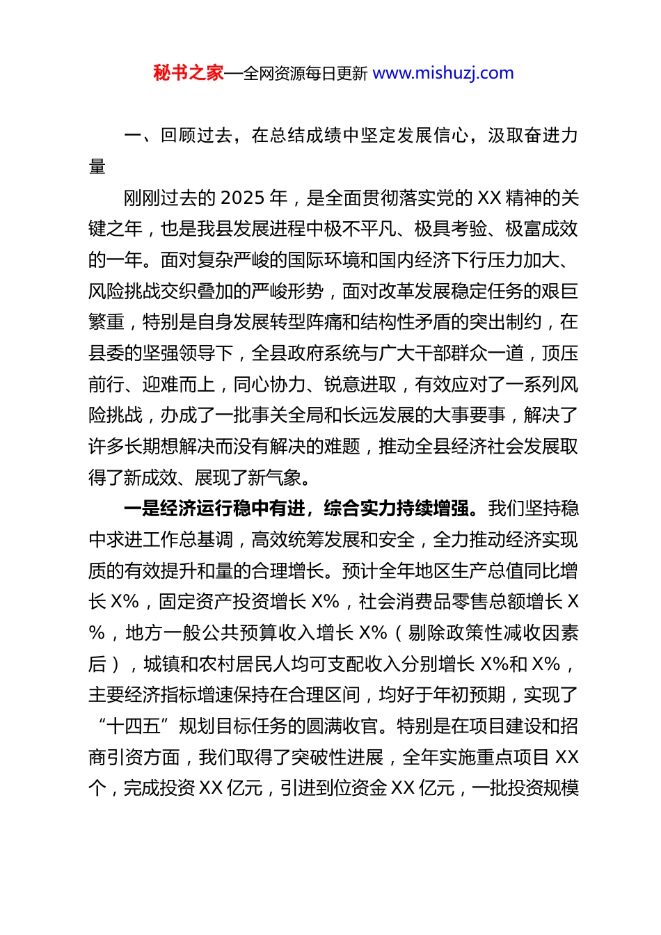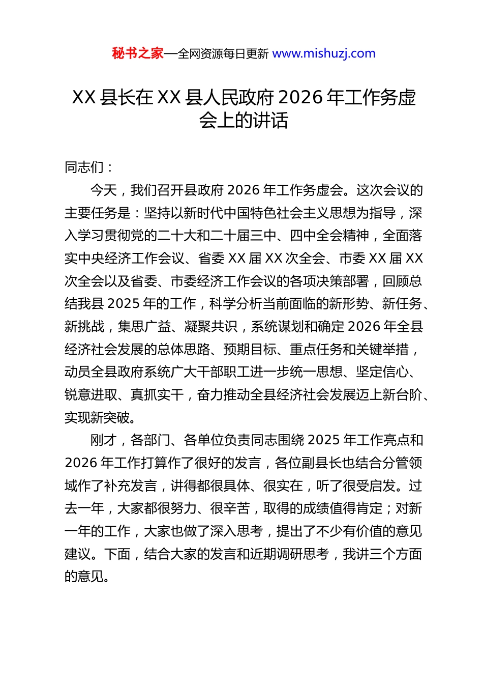 秘书之家—全网资源每日更新 www.mishuzj.comXX 县长在 XX 县人民政府 2026 年工作务虚会上的讲话同志们:今天,我们召开县政府 2026 年工作务虚会。这次会议的主要任务是:坚持以新时代中国特色社会主义思想为指导,深入学习贯彻党的二十大和二十届三中、四中全会精神,全面落实中央经济工作会议、省委 XX 届 XX 次全会、市委 XX 届 XX次全会以及省委、市委经济工作会议的各项决策部署,回顾总结我县 2025 年的工作,科学分析当前面临的新形势、新任务、新挑战,集思广益、凝聚共识,系统谋划和确定 2026 年全县经济社会发展的总体思路、预期目标、重点任务和关键举措,动员全县政府系统广大干部职工进一步统一思想、坚定信心、锐意进取、真抓实干,奋力推动全县经济社会发展迈上新台阶、实现新突破。刚才,各部门、各单位负责同志围绕 2025 年工作亮点和2026 年工作打算作了很好的发言,各位副县长也结合分管领域作了补充发言,讲得都很具体、很实在,听了很受启发。过去一年,大家都很努力、很辛苦,取得的成绩值得肯定;对新一年的工作,大家也做了深入思考,提出了不少有价值的意见建议。下面,结合大家的发言和近期调研思考,我讲三个方面的意见。秘书之家—全网资源每日更新 www.mishuzj.com一、回顾过去,在总结成绩中坚定发展信心,汲取奋进力量刚刚过去的 2025 年,是全面贯彻落实党的 XX 精神的关键之年,也是我县发展进程中极不平凡、极具考验、极富成效的一年。面对复杂严峻的国际环境和国内经济下行压力加大、风险挑战交织叠加的严峻形势,面对改革发展稳定任务的艰巨繁重,特别是自身发展转型阵痛和结构性矛盾的突出制约,在县委的坚强领导下,全县政府系统与广大干部群众一道,顶压前行、迎难而上,同心协力、锐意进取,有效应对了一系列风险挑战,办成了一批事关全局和长远发展的大事要事,解决了许多长期想解决而没有解决的难题,推动全县经济社会发展取得了新成效、展现了新气象。一是经济运行稳中有进,综合实力持续增强。我们坚持稳中求进工作总基调,高效统筹发展和安全,全力推动经济实现质的有效提升和量的合理增长。预计全年地区生产总值同比增长 X%,固定资产投资增长 X%,社会消费品零售总额增长 X%,地方一般公共预算收入增长 X%(剔除政策性减收因素后),城镇和农村居民人均可支配收入分别增长 X%和 X%,主要经济指标增速保持在合理区间,均好于年初预期,实现了“十四五”规划目标任务的圆满收官。特别是在项目建设和招商引资方面,我们取得了突破性进展,全年实施重点项目 XX个,完成投资 XX 亿元,引进到位资金 XX 亿元,一批投资规模秘书之家—全网资源每日更新 www.mishuzj.com大、带动能力强、科技含量高的优质项目相继落地建设或投产达效,为长远发展积蓄了强劲动能。二是产业转型升级步伐加快,现代化产业体系根基更牢。我们坚定不移把发展经济的着力点放在实体经济上,紧紧围绕构建现代化产业体系的目标,推动产业向集群化、高端化、智能化、绿色化方向发展。农业基础更加稳固。粮食生产再获丰收,总产达到 XX 亿斤,“菜篮子”产品供给充足。特色农业产业提质增效,新增省级以上农业产业化龙头企业 X 家,“三品一标”农产品认证数量持续增加。农村一二三产业融合发展趋势向好,乡村旅游、农村电商等新业态蓬勃发展。工业支撑更加有力。主导产业集群效应初步显现,XX 产业园、XX 特色产业基地建设加快推进,新增规上工业企业 X 家。企业技术改造和数字化转型步伐加快,实施技改项目 XX 个,完成投资 XX亿元。科技创新能力不断提升,新增高新技术企业 X 家,科技型中小企业 X 家,研发投入强度达到 X%。服务业活力持续释放。现代物流、现代金融、科技服务等生产性服务业稳步发展,商贸流通体系不断完善,消费市场持续回暖升级,成功举办了一系列促消费活动,文旅融合深度推进,接待游客人次和旅游综合收入实现双增长。三是城乡融合发展扎实推进,区域协调性逐步提升。我们坚持以城带乡、城乡一体,着力优化国土空间格局,提升城乡功能品质。城市更新行动有序实施,完成 XX 个老...