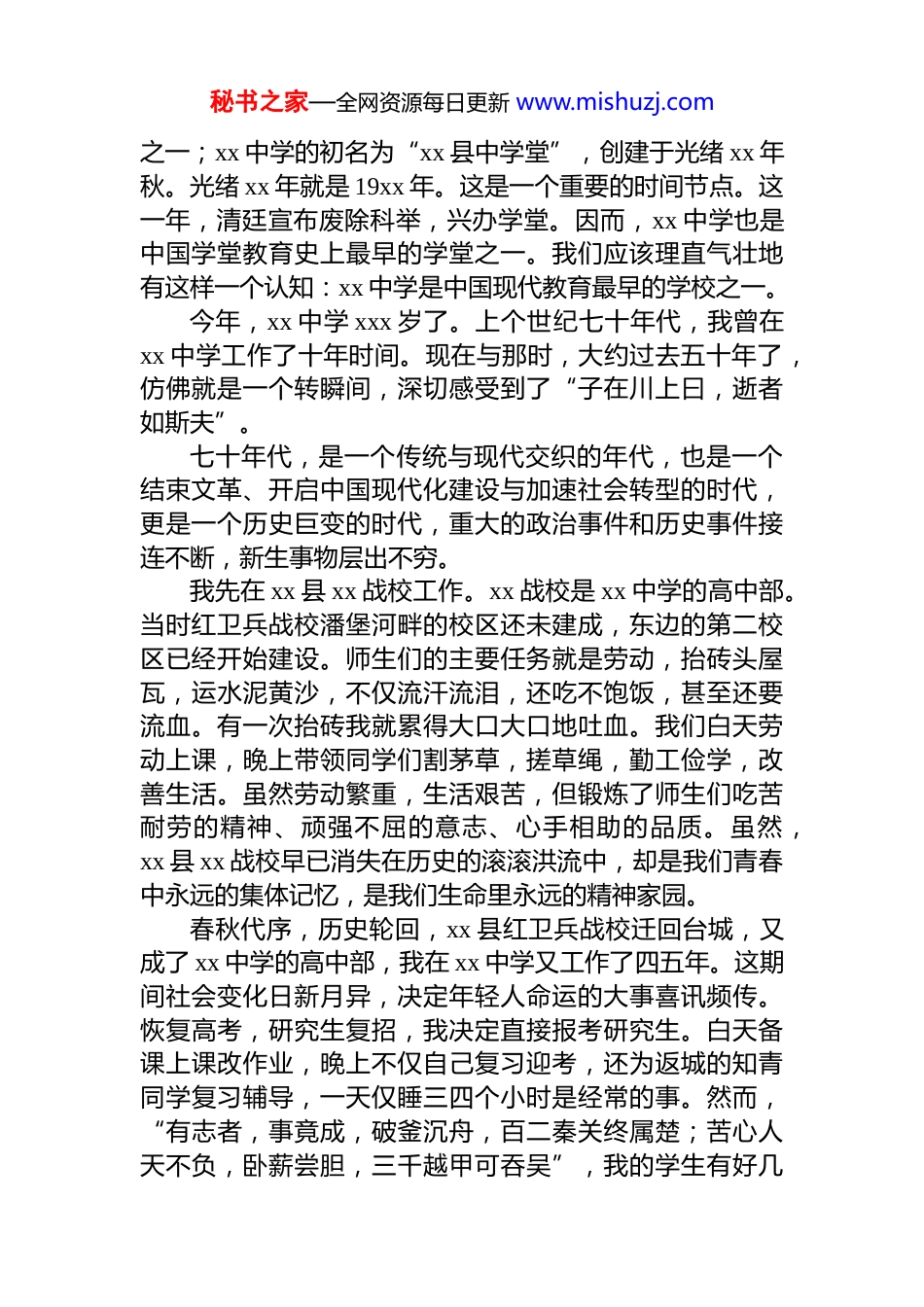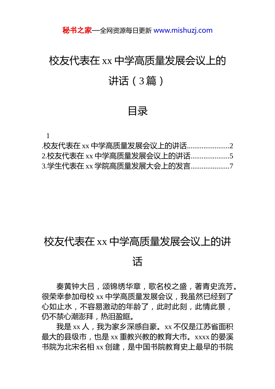 秘书之家—全网资源每日更新 www.mishuzj.com校友代表在 xx 中学高质量发展会议上的讲话(3 篇)目录1.校友代表在 xx 中学高质量发展会议上的讲话.......................22.校友代表在 xx 中学高质量发展会议上的讲话.....................53.学生代表在 xx 学院高质量发展大会上的发言.....................7校友代表在 xx 中学高质量发展会议上的讲话奏黄钟大吕,颂锦绣华章,歌名校之盛,著青史流芳。很荣幸参加母校 xx 中学高质量发展会议,我虽然已经到了心如止水,不容易激动的年龄了,此时此刻,此情此景,仍不禁心潮澎拜,热泪盈眶。我是 xx 人,我为家乡深感自豪。xx 不仅是江苏省面积最大的县级市,也是 xx 重教兴教的教育大市。xxxx 的晏溪书院为北宋名相 xx 创建,是中国书院教育史上最早的书院秘书之家—全网资源每日更新 www.mishuzj.com之一;xx 中学的初名为“xx 县中学堂”,创建于光绪 xx 年秋。光绪 xx 年就是 19xx 年。这是一个重要的时间节点。这一年,清廷宣布废除科举,兴办学堂。因而,xx 中学也是中国学堂教育史上最早的学堂之一。我们应该理直气壮地有这样一个认知:xx 中学是中国现代教育最早的学校之一。今年,xx 中学 xxx 岁了。上个世纪七十年代,我曾在xx 中学工作了十年时间。现在与那时,大约过去五十年了,仿佛就是一个转瞬间,深切感受到了“子在川上曰,逝者如斯夫”。七十年代,是一个传统与现代交织的年代,也是一个结束文革、开启中国现代化建设与加速社会转型的时代,更是一个历史巨变的时代,重大的政治事件和历史事件接连不断,新生事物层出不穷。我先在 xx 县 xx 战校工作。xx 战校是 xx 中学的高中部。当时红卫兵战校潘堡河畔的校区还未建成,东边的第二校区已经开始建设。师生们的主要任务就是劳动,抬砖头屋瓦,运水泥黄沙,不仅流汗流泪,还吃不饱饭,甚至还要流血。有一次抬砖我就累得大口大口地吐血。我们白天劳动上课,晚上带领同学们割茅草,搓草绳,勤工俭学,改善生活。虽然劳动繁重,生活艰苦,但锻炼了师生们吃苦耐劳的精神、顽强不屈的意志、心手相助的品质。虽然,xx 县 xx 战校早已消失在历史的滚滚洪流中,却是我们青春中永远的集体记忆,是我们生命里永远的精神家园。春秋代序,历史轮回,xx 县红卫兵战校迁回台城,又成了 xx 中学的高中部,我在 xx 中学又工作了四五年。这期间社会变化日新月异,决定年轻人命运的大事喜讯频传。恢复高考,研究生复招,我决定直接报考研究生。白天备课上课改作业,晚上不仅自己复习迎考,还为返城的知青同学复习辅导,一天仅睡三四个小时是经常的事。然而,“有志者,事竟成,破釜沉舟,百二秦关终属楚;苦心人天不负,卧薪尝胆,三千越甲可吞吴”,我的学生有好几秘书之家—全网资源每日更新 www.mishuzj.com个考取了大学,我也考取了研究生,开始了我的学术征程xx 中学是我们梦想起飞的地方,xx 中学给了学子面朝大海,鲜花盛开的机会,给了学子诗、酒和辽阔的远方。千言万语,万语千言,说不尽道不完对于 xx 中学的挚爱和感恩。请允许我用一首词和一首诗,表达我对母校的感念和祝福:满江红•xx 感怀霜拂江淮,催又发、争流鹢舸。忆往昔、月寒陋室,烛燃薪火。掌下胼胝茅草结,墙头血汗泥砖和。笑由他、绛帐立滩涂,罡风簸。春化雨,兰芷播;勤煮海,登天可。看鲲池水击,鹏霄云破。百廿沧桑成气魄,三千桃李鸣天铎。待明朝、椽笔落新章,还来贺。七律•贺 xx 中学百廿华诞百廿黉门夸淮左,桂香浓处忆铎音。两堂初肇秉明德,一脉薪传在树人。桃李成蹊皆国士,弦歌不辍栋梁林。范公堤外云帆起,沧海横流摘星辰。校友代表在 xx 中学高质量发展会议上的讲话很荣幸参加母校 xx 中学高质量发展会议,见证学校回秘书之家—全网资源每日更新 www.mishuzj.com望历史谋划未来的关键时刻,又恰逢母校一百二十年华诞我谨以学子的身份,向母校师生表示热烈的祝贺,致以最诚挚的祝福!一座城市总和一所学校联系在一起。xx 中学和 xx,血脉相连,命运与共,xx 哺育 xx,xx 反哺 xx。一百二十年,两个甲子,xx 中学弦...