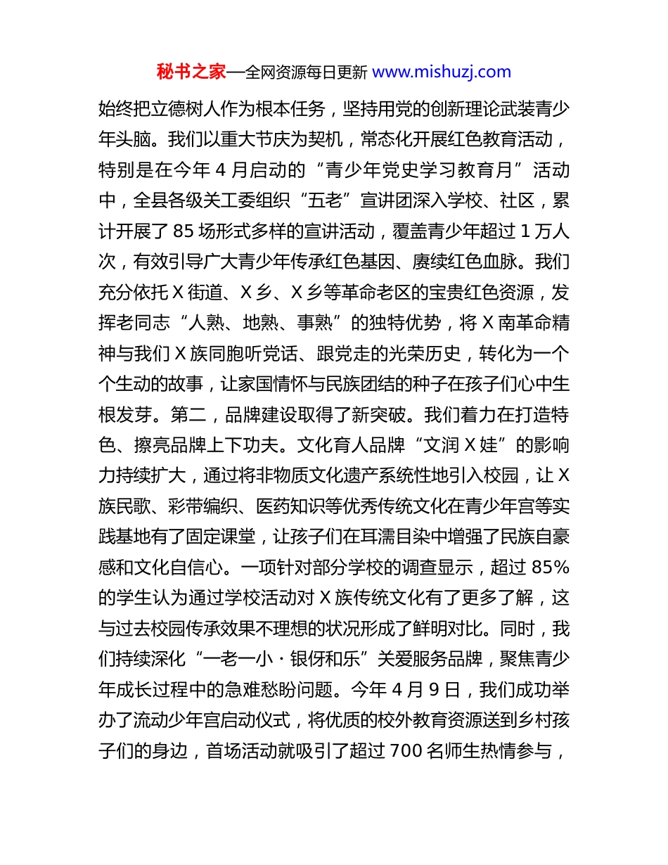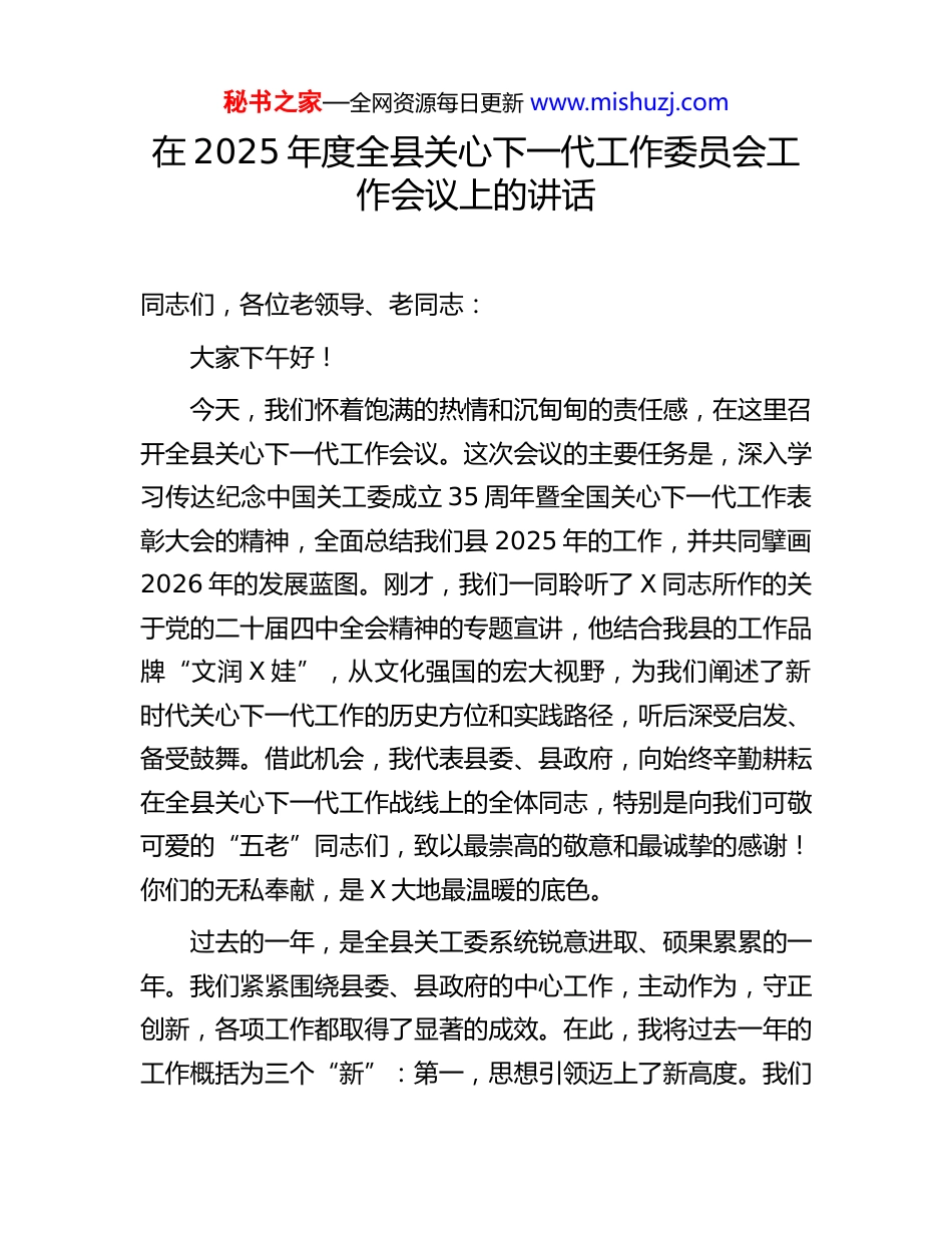 秘书之家—全网资源每日更新 www.mishuzj.com在 2025 年度全县关心下一代工作委员会工作会议上的讲话同志们,各位老领导、老同志:大家下午好!今天,我们怀着饱满的热情和沉甸甸的责任感,在这里召开全县关心下一代工作会议。这次会议的主要任务是,深入学习传达纪念中国关工委成立 35 周年暨全国关心下一代工作表彰大会的精神,全面总结我们县 2025 年的工作,并共同擘画2026 年的发展蓝图。刚才,我们一同聆听了 X 同志所作的关于党的二十届四中全会精神的专题宣讲,他结合我县的工作品牌“文润 X 娃”,从文化强国的宏大视野,为我们阐述了新时代关心下一代工作的历史方位和实践路径,听后深受启发、备受鼓舞。借此机会,我代表县委、县政府,向始终辛勤耕耘在全县关心下一代工作战线上的全体同志,特别是向我们可敬可爱的“五老”同志们,致以最崇高的敬意和最诚挚的感谢!你们的无私奉献,是 X 大地最温暖的底色。过去的一年,是全县关工委系统锐意进取、硕果累累的一年。我们紧紧围绕县委、县政府的中心工作,主动作为,守正创新,各项工作都取得了显著的成效。在此,我将过去一年的工作概括为三个“新”:第一,思想引领迈上了新高度。我们秘书之家—全网资源每日更新 www.mishuzj.com始终把立德树人作为根本任务,坚持用党的创新理论武装青少年头脑。我们以重大节庆为契机,常态化开展红色教育活动,特别是在今年 4 月启动的“青少年党史学习教育月”活动中,全县各级关工委组织“五老”宣讲团深入学校、社区,累计开展了 85 场形式多样的宣讲活动,覆盖青少年超过 1 万人次,有效引导广大青少年传承红色基因、赓续红色血脉。我们充分依托 X 街道、X 乡、X 乡等革命老区的宝贵红色资源,发挥老同志“人熟、地熟、事熟”的独特优势,将 X 南革命精神与我们 X 族同胞听党话、跟党走的光荣历史,转化为一个个生动的故事,让家国情怀与民族团结的种子在孩子们心中生根发芽。第二,品牌建设取得了新突破。我们着力在打造特色、擦亮品牌上下功夫。文化育人品牌“文润 X 娃”的影响力持续扩大,通过将非物质文化遗产系统性地引入校园,让 X族民歌、彩带编织、医药知识等优秀传统文化在青少年宫等实践基地有了固定课堂,让孩子们在耳濡目染中增强了民族自豪感和文化自信心。一项针对部分学校的调查显示,超过 85%的学生认为通过学校活动对 X 族传统文化有了更多了解,这与过去校园传承效果不理想的状况形成了鲜明对比。同时,我们持续深化“一老一小・银伢和乐”关爱服务品牌,聚焦青少年成长过程中的急难愁盼问题。今年 4 月 9 日,我们成功举办了流动少年宫启动仪式,将优质的校外教育资源送到乡村孩子们的身边,首场活动就吸引了超过 700 名师生热情参与,秘书之家—全网资源每日更新 www.mishuzj.com为促进教育公平、守护乡村儿童健康成长提供了有力支撑。第三,协同共治凝聚了新合力。关心下一代工作是一项系统工程,需要全社会共同参与。一年来,我们积极发挥平台优势,不断强化与各成员单位的协作联动。我们与县教育局、县民政局、县妇联、团县委等 8 家单位建立了常态化的活动共办机制,在扶贫助学、权益保护、家庭教育等领域形成了强大工作合力。例如,我们与县司法局、妇联等部门共同构建了信息互通机制,在预防青少年违法犯罪、化解家庭矛盾等方面取得了良好效果。我们还推动乡镇“五好”关工委和村级示范关工委的建设提质增效,基层组织的战斗堡垒作用愈发凸显,关心下一代日益成为 X 大地人人支持、人人参与的文明新风尚。同志们,成绩来之不易,经验弥足珍贵。这些成绩的取得,根本在于县委的坚强领导,关键在于各级各部门的通力协作,核心在于我们广大“五老”和关工委工作者的倾情投入。在肯定成绩的同时,我们也要清醒地认识到,对照新时代的新要求,对照广大青少年和家长的新期盼,我们的工作还存在一些需要加强和改进的地方,比如工作品牌的影响力还需要进一步扩大,部门协同的机制还需要进一步完善,对青少年心理健康等新问题的关注和服务还需要进一步深化。这些问题,需要我们在未来的工作中认真研究,并切实...