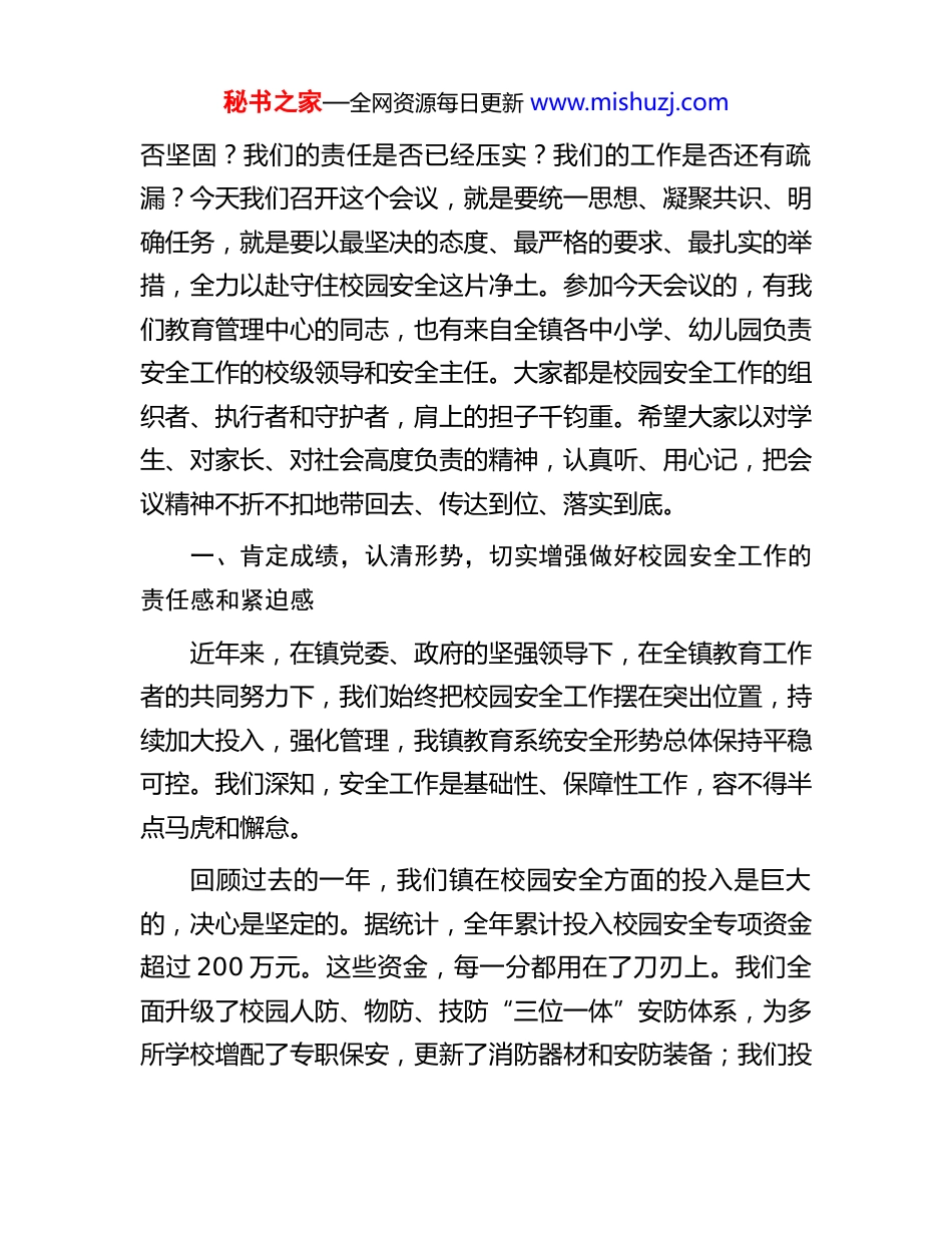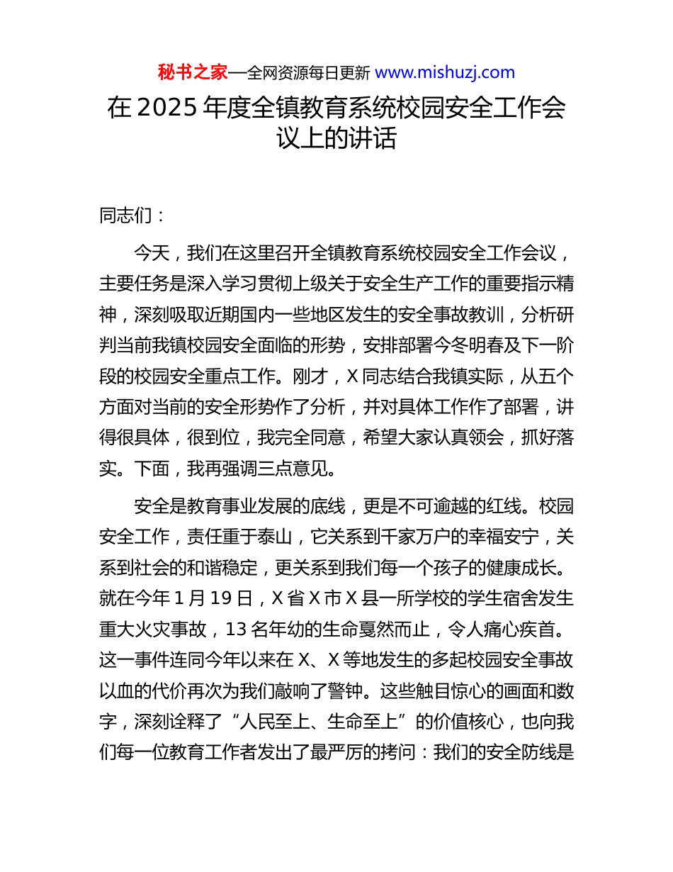 秘书之家—全网资源每日更新 www.mishuzj.com在 2025 年度全镇教育系统校园安全工作会议上的讲话同志们:今天,我们在这里召开全镇教育系统校园安全工作会议,主要任务是深入学习贯彻上级关于安全生产工作的重要指示精神,深刻吸取近期国内一些地区发生的安全事故教训,分析研判当前我镇校园安全面临的形势,安排部署今冬明春及下一阶段的校园安全重点工作。刚才,X 同志结合我镇实际,从五个方面对当前的安全形势作了分析,并对具体工作作了部署,讲得很具体,很到位,我完全同意,希望大家认真领会,抓好落实。下面,我再强调三点意见。安全是教育事业发展的底线,更是不可逾越的红线。校园安全工作,责任重于泰山,它关系到千家万户的幸福安宁,关系到社会的和谐稳定,更关系到我们每一个孩子的健康成长。就在今年 1 月 19 日,X 省 X 市 X 县一所学校的学生宿舍发生重大火灾事故,13 名年幼的生命戛然而止,令人痛心疾首。这一事件连同今年以来在 X、X 等地发生的多起校园安全事故以血的代价再次为我们敲响了警钟。这些触目惊心的画面和数字,深刻诠释了“人民至上、生命至上”的价值核心,也向我们每一位教育工作者发出了最严厉的拷问:我们的安全防线是秘书之家—全网资源每日更新 www.mishuzj.com否坚固?我们的责任是否已经压实?我们的工作是否还有疏漏?今天我们召开这个会议,就是要统一思想、凝聚共识、明确任务,就是要以最坚决的态度、最严格的要求、最扎实的举措,全力以赴守住校园安全这片净土。参加今天会议的,有我们教育管理中心的同志,也有来自全镇各中小学、幼儿园负责安全工作的校级领导和安全主任。大家都是校园安全工作的组织者、执行者和守护者,肩上的担子千钧重。希望大家以对学生、对家长、对社会高度负责的精神,认真听、用心记,把会议精神不折不扣地带回去、传达到位、落实到底。一、肯定成绩,认清形势,切实增强做好校园安全工作的责任感和紧迫感近年来,在镇党委、政府的坚强领导下,在全镇教育工作者的共同努力下,我们始终把校园安全工作摆在突出位置,持续加大投入,强化管理,我镇教育系统安全形势总体保持平稳可控。我们深知,安全工作是基础性、保障性工作,容不得半点马虎和懈怠。回顾过去的一年,我们镇在校园安全方面的投入是巨大的,决心是坚定的。据统计,全年累计投入校园安全专项资金超过 200 万元。这些资金,每一分都用在了刀刃上。我们全面升级了校园人防、物防、技防“三位一体”安防体系,为多所学校增配了专职保安,更新了消防器材和安防装备;我们投秘书之家—全网资源每日更新 www.mishuzj.com入专项资金 80 多万元,为重点学校安装了高清视频监控系统和红外线防盗系统,基本实现了校园重点区域监控全覆盖;我们还扎实开展了各类安全隐患大排查、大整治行动,对排查出的问题建立台账,逐一销号整改,确保不留死角、不留盲区。此外,我们高度重视师生的安全意识和应急能力培养,全年组织了包括消防、防震、反恐防暴在内的各类应急演练超过150 场次极大地提升了广大师生的自救互救能力。这些成绩的取得,离不开在座各位以及全镇广大教育同仁的辛勤付出和不懈努力。在此,我代表镇教育管理中心,向大家表示衷心的感谢!但是在肯定成绩的同时,我们必须清醒地认识到,校园安全工作只有起点,没有终点,永远在路上。当前,我镇校园安全工作依然面临着严峻复杂的形势,一些潜在的风险和薄弱环节不容忽视。我们全镇现有公民办中小学、幼儿园 X 所,在校学生超过 X 万人,教职工近 XX 人,这样一个庞大的群体,管理难度大,安全变数多。从内部看,一些学校和教职工中还存在麻痹思想和侥幸心理,认为安全事故离自己很远,“重教书、轻育人、安全工作说起来重要、做起来次要”的现象在个别单位还不同程度地存在。一些学校的安全制度悬在墙上、挂在嘴上,但在实际工作中没有得到严格执行。从外部看,校园周边环境复杂,交通、治安等问题交织,给校园安全带来持续压力。特别是随着社会的发展,学生心理健康问题、网络成瘾秘书之家—全网资源每日更新 www.mishuzj.com与网络欺凌、新型毒品伪装渗透等非...