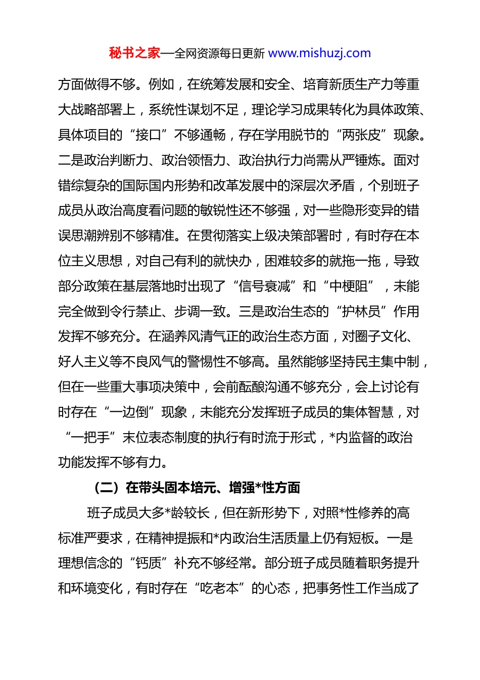 秘书之家—全网资源每日更新 www.mishuzj.com2025 年度党委领导班子民主生活会对照检查材料:查摆不足找准症结之源,真抓实干汇聚奋进之力按照中央及省委关于开好 2025 年度*员领导干部民主生活会的统一部署,党委领导班子紧扣会议主题,坚持以**************思想为指导,全面贯彻落实*的二十届四中全会精神。会前,班子成员通过个人自学、集体研讨、座谈交流等形式,认真研读规定篇目,广泛征求基层*组织、*员群众的意见建议,深入开展谈心谈话,系统梳理检视问题。在此基础上,班子紧密结合“十四五”规划收官及“十五五”谋划的实际,对照*章*规 dj,深刻查摆存在问题,剖析思想根源,明确整改方向。现将对照检查情况报告如下。一、存在的主要问题(一)在带头强化政治忠诚、提高政治能力方面党委班子始终坚持把*的政治建设摆在首位,但在学懂弄通做实**************思想,将其转化为推动高质量发展的生动实践上,仍存在“温差”与“落差”。一是理论武装的“厚度”与转化的“效度”不够匹配。在落实“第一议题”制度时,有时存在“为了学而学”的倾向,对******关于本领域工作的重要论述,虽然做到了第一时间传达学习,但在结合本地实际进行深度融合秘书之家—全网资源每日更新 www.mishuzj.com方面做得不够。例如,在统筹发展和安全、培育新质生产力等重大战略部署上,系统性谋划不足,理论学习成果转化为具体政策、具体项目的“接口”不够通畅,存在学用脱节的“两张皮”现象。二是政治判断力、政治领悟力、政治执行力尚需从严锤炼。面对错综复杂的国际国内形势和改革发展中的深层次矛盾,个别班子成员从政治高度看问题的敏锐性还不够强,对一些隐形变异的错误思潮辨别不够精准。在贯彻落实上级决策部署时,有时存在本位主义思想,对自己有利的就快办,困难较多的就拖一拖,导致部分政策在基层落地时出现了“信号衰减”和“中梗阻”,未能完全做到令行禁止、步调一致。三是政治生态的“护林员”作用发挥不够充分。在涵养风清气正的政治生态方面,对圈子文化、好人主义等不良风气的警惕性不够高。虽然能够坚持民主集中制,但在一些重大事项决策中,会前酝酿沟通不够充分,会上讨论有时存在“一边倒”现象,未能充分发挥班子成员的集体智慧,对“一把手”末位表态制度的执行有时流于形式,*内监督的政治功能发挥不够有力。(二)在带头固本培元、增强*性方面班子成员大多*龄较长,但在新形势下,对照*性修养的高标准严要求,在精神提振和*内政治生活质量上仍有短板。一是理想信念的“钙质”补充不够经常。部分班子成员随着职务提升和环境变化,有时存在“吃老本”的心态,把事务性工作当成了秘书之家—全网资源每日更新 www.mishuzj.com主要任务,对*性锻炼的主动性有所松懈。在运用红色资源涵养初心使命方面挖掘不够深,对*员干部开展理想信念教育时,形式还比较单一,缺乏感染力和穿透力,未能时刻保持“赶考”的清醒和坚定,对“两个确立”决定性意义的领悟有时停留在感性层面。二是*内政治生活的“熔炉”火候不够旺。尽管能够按规定召开民主生活会和组织生活会,但在开展批评与自我批评时,有时还存在“好人主义”思想。自我批评多是避重就轻、隔靴搔痒,相互批评则往往是先表扬后建议,以工作建议代替思想交锋,缺少“辣味”和“刺刀见红”的锋芒,未能真正达到红脸出汗、排毒治病的效果。双重组织生活制度落实不够严格,有时以指导工作代替以普通*员身份参加支部活动,未能真正把自己摆进去。三是弘扬优良传统的表率作用发挥不够充分。在传承艰苦奋斗、勤俭节约的优良作风方面,个别时候存在松懈情绪。面对财政收支紧平衡的现状,在预算管理、资源配置上,“过紧日子”的思想树得还不够牢,对于一些非急需、非刚性的开支控制不够严,在厉行节约、反对浪费方面,未能时刻做到率先垂范、以身作则,对基层的示范引领作用还有待加强。(三)在带头敬畏人民、敬畏组织、敬畏法纪方面班子在遵规守纪、服务群众方面总体情况良好,但对照全面从严治*的高标准,在作风建设的细节处仍存在不足。一是服务群众的宗旨意识存在“机关化”倾向。随着办公条件的改善和秘书之家—全...