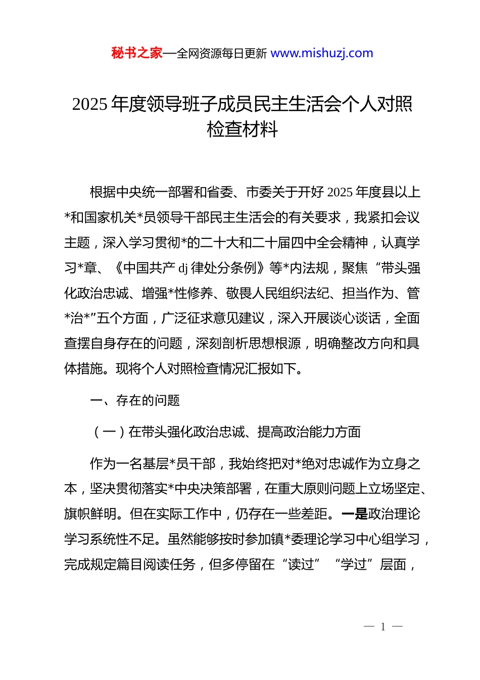 秘书之家—全网资源每日更新 www.mishuzj.com2025 年度领导班子成员民主生活会个人对照检查材料根据中央统一部署和省委、市委关于开好 2025 年度县以上*和国家机关*员领导干部民主生活会的有关要求,我紧扣会议主题,深入学习贯彻*的二十大和二十届四中全会精神,认真学习*章、《中国共产 dj 律处分条例》等*内法规,聚焦“带头强化政治忠诚、增强*性修养、敬畏人民组织法纪、担当作为、管*治*”五个方面,广泛征求意见建议,深入开展谈心谈话,全面查摆自身存在的问题,深刻剖析思想根源,明确整改方向和具体措施。现将个人对照检查情况汇报如下。一、存在的问题(一)在带头强化政治忠诚、提高政治能力方面作为一名基层*员干部,我始终把对*绝对忠诚作为立身之本,坚决贯彻落实*中央决策部署,在重大原则问题上立场坚定、旗帜鲜明。但在实际工作中,仍存在一些差距。一是政治理论学习系统性不足。虽然能够按时参加镇*委理论学习中心组学习,完成规定篇目阅读任务,但多停留在“读过”“学过”层面,— 1 —秘书之家—全网资源每日更新 www.mishuzj.com缺乏深度思考与转化运用。例如,在学习***关于“千万工程”的****精神时,虽组织了集中研讨,但未能结合本镇农村人居环境整治实际提出更具操作性的推进路径,导致部分村庄改造仍存在“重面子轻里子”现象。二是政治判断力有待提升。面对复杂社会舆情时,有时敏感度不够高。今年初,辖区内某村民因土地流转纠纷在社交平台发布不实视频,引发一定范围传播,我最初将其视为普通信访问题处理,未及时从维护基层稳定的政治高度进行研判,延误了最佳处置时机,暴露出风险预判能力和政治敏锐性还需加强。三是政治执行力需进一步增强。在落实耕地保护“非粮化”整治任务中,虽按上级要求完成了图斑整改,但个别地块复耕质量不高,后续管护不到位,出现反弹苗头,反映出工作推进中存在“重完成轻成效”的倾向,离“钉钉子”抓落实的要求还有差距。(二)在带头固本培元、增强*性方面始终坚持用*的创新理论武装头脑,坚定理想信念,但在日常锤炼中仍有薄弱环节。一是宗旨意识树得不够牢固。尽管每年参与“我为群众办实事”实践活动,推动解决了一批民生小事,但在回应群众关切的深层次问题上办法不多。如针对老年群体反映强烈的“买菜难”问题,虽协调设立了临时集市,但— 2 —秘书之家—全网资源每日更新 www.mishuzj.com缺乏长效运营机制,在雨雪天气或农忙时节仍难以保障供应,说明为民服务还停留在“救急”阶段,未能真正打通“最后一米”。二是*性锻炼的主动性有所减弱。作为班子成员,能够参加组织生活会、民主评议*员等活动,但以普通*员身份开展批评与自我批评时,存在“怕伤和气”心理,对其他同志的问题点到为止,对自己也回避深层次剖析,组织生活“辣味”不足,政治生活的严肃性打了折扣。三是在弘扬优良作风方面示范作用发挥不够。面对繁重的迎检迎考任务,偶尔产生急躁情绪,对村社干部提要求多、指导帮助少,特别在推进垃圾分类工作中,因进度滞后而当众批评村干部,挫伤了基层积极性,反映出群众工作方式方法还需改进。(三)在带头敬畏人民、敬畏组织、敬畏法纪方面始终牢记权力来自人民,坚持依法依规办事,但在细节之处仍需警醒。一是对人民群众的敬畏之心需再强化。在推动乡村振兴项目落地过程中,过于强调效率目标,听取群众意见不够充分。今年实施的某村道路拓宽工程,设计方案未充分征求沿线农户意见,导致施工中发生多起邻里纠纷,影响了工程进度,也损害了干群关系。事后反思,根本原因在于没有真正把群众当作决策参与者,而是简单视为执行对象。二是执行组织— 3 —秘书之家—全网资源每日更新 www.mishuzj.com程序不够严谨。在村级组织换届“回头看”人选推荐中,虽坚持集体讨论决定,但前期曾私下向个别村干部了解情况,并表达过倾向性意见,虽出于掌握实情考虑,但客观上可能影响公平公正,不符合组织纪律的刚性要求。三是纪律规矩意识需时刻绷紧。在公务活动中虽能严守标准,但对一些“擦边球”行为警惕性不高。例如,接受企业负责人赠送的本地特产,虽价值不大且当场拒收,但仍存在廉政风...