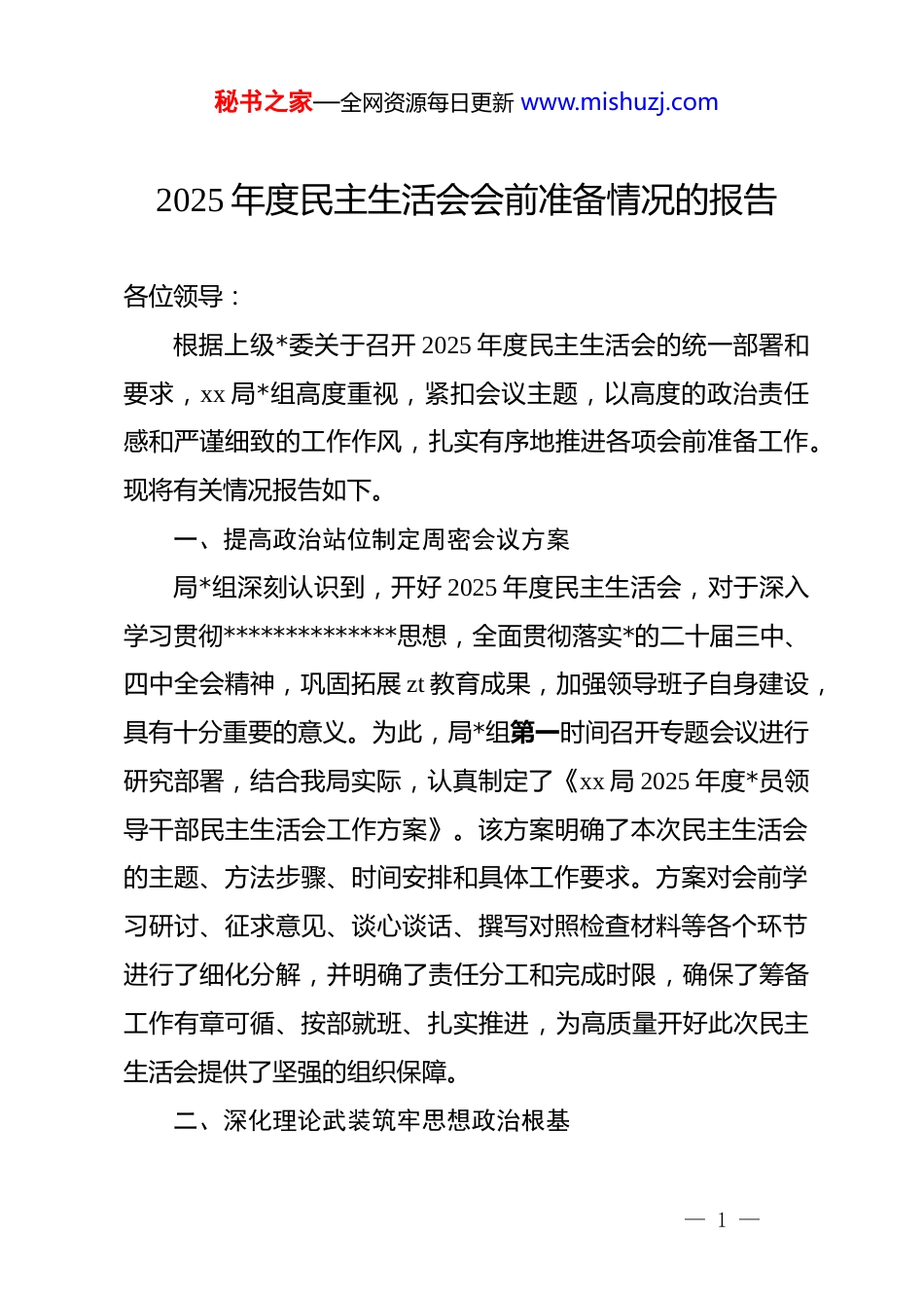 秘书之家—全网资源每日更新 www.mishuzj.com2025 年度民主生活会会前准备情况的报告各位领导:根据上级*委关于召开 2025 年度民主生活会的统一部署和要求,xx 局*组高度重视,紧扣会议主题,以高度的政治责任感和严谨细致的工作作风,扎实有序地推进各项会前准备工作。现将有关情况报告如下。一、提高政治站位制定周密会议方案局*组深刻认识到,开好 2025 年度民主生活会,对于深入学习贯彻**************思想,全面贯彻落实*的二十届三中、四中全会精神,巩固拓展 zt 教育成果,加强领导班子自身建设,具有十分重要的意义。为此,局*组第一时间召开专题会议进行研究部署,结合我局实际,认真制定了《xx 局 2025 年度*员领导干部民主生活会工作方案》。该方案明确了本次民主生活会的主题、方法步骤、时间安排和具体工作要求。方案对会前学习研讨、征求意见、谈心谈话、撰写对照检查材料等各个环节进行了细化分解,并明确了责任分工和完成时限,确保了筹备工作有章可循、按部就班、扎实推进,为高质量开好此次民主生活会提供了坚强的组织保障。二、深化理论武装筑牢思想政治根基— 1 —秘书之家—全网资源每日更新 www.mishuzj.com局*组坚持把理论学习作为开好民主生活会的重要前提和基础,贯穿于筹备工作的全过程。为确保学深悟透、融会贯通,局*组理论学习中心组于 2026 年 1 月 4 日举行了会前集中学习研讨会。会议采取集体研讨与个人自学相结合的方式,组织班子成员深入学习领会******关于*的建设的重要思想、关于*的自我革命的重要思想、关于作风建设的重要论述,系统学习*的二十届三中、四中全会精神和******最新重要讲话精神,并重温了*章、《关于新形势下*内政治生活的若干准则》、《中国共产 dj 律处分条例》等*内法规。在集中学习研讨中,班子成员紧扣会议主题,结合分管工作和思想实际,逐一进行交流发言,深入探讨如何以打攻坚战、持久战的决心和恒心,锲而不舍落实中央八项规定精神,推进作风建设常态化长效化。通过系统深入的学习,班子成员进一步深化了对“两个确立”决定性意义的认识,增强了“四个意识”、坚定了“四个自信”、做到了“两个维护”,为开好民主生活会打牢了坚实的思想基础。三、广开言路纳谏全面深入征求意见为确保问题查摆得准、找得实、挖得深,局*组坚持开门纳谏,发扬民主,通过多种渠道、多种方式广泛征求意见建议。我们综合运用了下发征求意见函、召开座谈会、设置意见箱、— 2 —秘书之家—全网资源每日更新 www.mishuzj.com开通网络信箱、深入基层调研等多种方式面向全局系统各单位、全体*员干部职工以及服务对象等,广泛征求对局*组领导班子及成员在五个重点方面的意见建议。此次征求意见活动覆盖面广、参与度高,共征求到各类原汁原味的意见建议 68 条。其中,对局*组班子的意见建议 25 条,对班子成员个人的意见建议 43条。局*组办公室对征集到的意见建议进行了认真梳理、逐条分析,确保“原汁原味”反馈给领导班子和每位成员。这些意见建议主要集中在加强政治理论与业务实践的深度融合、密切联系群众、改进工作作风、强化担当作为、履行管*治*责任等方面为领导班子和成员个人深入查摆问题、深刻剖析根源提供了重要依据。四、坦诚交流思想深入开展谈心谈话根据工作方案安排,局*组班子成员在认真学习和广泛征求意见的基础上,扎实开展了谈心谈话工作。严格按照“四必谈”要求,局*组书记 xx 同志与班子成员逐一谈心,班子成员之间互相谈心,班子成员与分管单位主要负责同志、与本人组织关系所在*支部*员代表之间深入开展了谈心谈话。在谈话过程中,大家本着对组织、对同志、对事业高度负责的态度,开诚布公、坦诚相见,既交流思想、沟通工作,又主动亮明自身存在的问题,诚恳指出对方的不足,相互交换对班子存在问题— 3 —秘书之家—全网资源每日更新 www.mishuzj.com的看法,并就拟在民主生活会上开展批评的意见进行了充分沟通、达成了共识。谈心谈话重点围绕“五个带头”,特别是聚焦作风建设突出问题,把自己摆进去、把职责摆进去、把工作摆进去,真正做到了把问题谈开、把思想谈通、把意见谈...