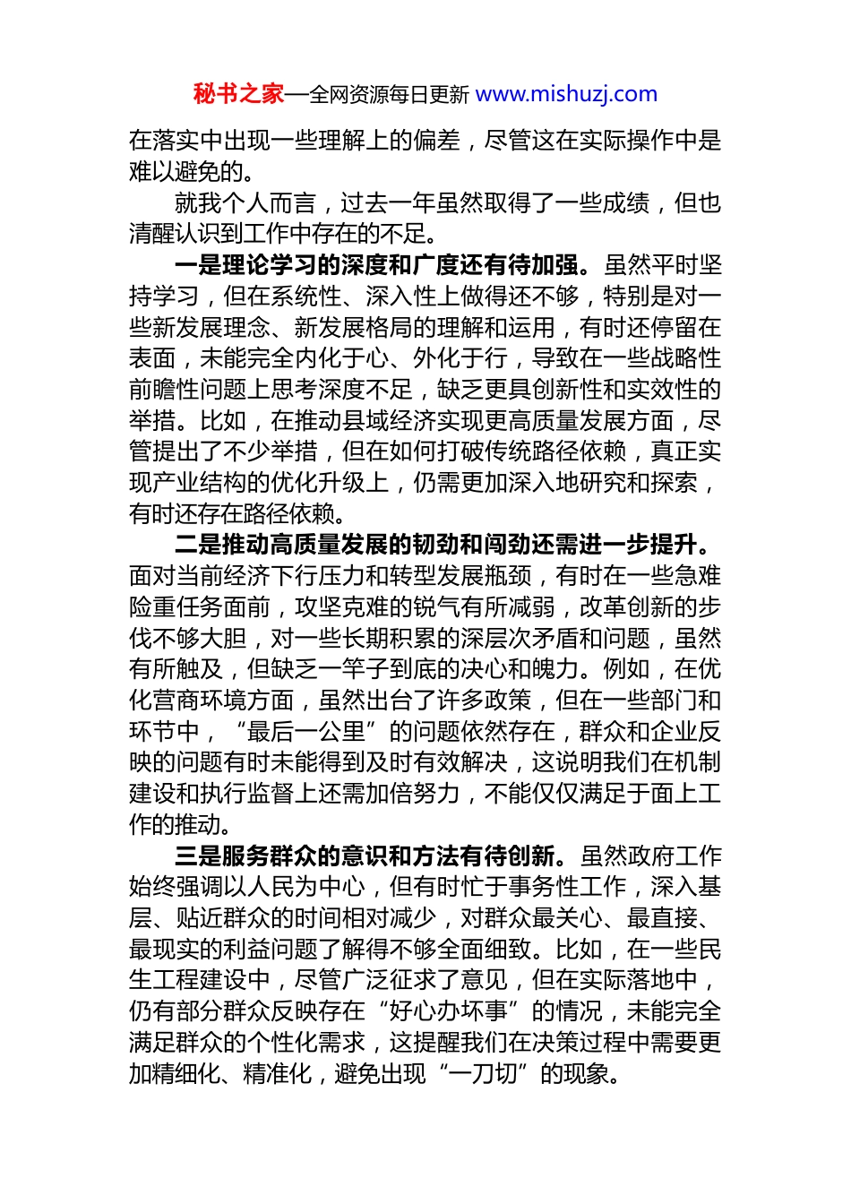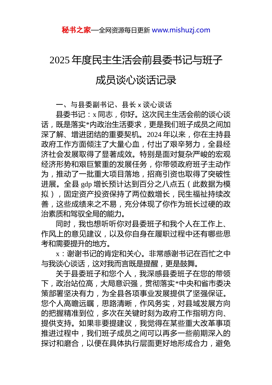 秘书之家—全网资源每日更新 www.mishuzj.com2025 年度民主生活会前县委书记与班子成员谈心谈话记录一、与县委副书记、县长 x 谈心谈话县委书记:x 同志,你好。这次民主生活会前的谈心谈话,既是落实*内政治生活要求,更是我们班子成员之间加深了解、增进团结的重要契机。2024 年以来,你在主持县政府工作方面倾注了大量心血,付出了艰辛努力,全县经济社会发展取得了显著成效。特别是面对复杂严峻的宏观经济形势和艰巨繁重的发展任务,你带领政府班子主动作为,推动了一批重大项目落地,招商引资也取得了突破性进展。全县 gdp 增长预计达到百分之八点五(此数据为模拟),固定资产投资保持了两位数增长,民生福祉持续改善,这些成绩来之不易,充分体现了你作为班长过硬的政治素质和驾驭全局的能力。 同时,我也想听听你对县委班子和我个人在工作上、作风上的意见建议,以及你自身在履职过程中还有哪些思考和需要提升的地方。x:谢谢书记的肯定和关心。非常感谢书记在百忙之中与我谈心谈话,这对我而言既是提醒,更是鼓舞。关于县委班子和您个人,我深感县委班子在您的带领下,政治站位高,大局意识强,贯彻落实*中央和省市委决策部署坚决有力,为全县各项事业发展提供了坚强保证。您个人高瞻远瞩,思路清晰,作风务实,对县域发展方向的把握精准到位,多次在关键时刻为政府工作指明方向、提供支持。如果非要提建议,我觉得在某些重大改革事项推进过程中,我们班子成员之间可以再多一些前期深入的探讨和磨合,以便在具体执行层面更好地形成合力,避免秘书之家—全网资源每日更新 www.mishuzj.com在落实中出现一些理解上的偏差,尽管这在实际操作中是难以避免的。就我个人而言,过去一年虽然取得了一些成绩,但也清醒认识到工作中存在的不足。一是理论学习的深度和广度还有待加强。虽然平时坚持学习,但在系统性、深入性上做得还不够,特别是对一些新发展理念、新发展格局的理解和运用,有时还停留在表面,未能完全内化于心、外化于行,导致在一些战略性前瞻性问题上思考深度不足,缺乏更具创新性和实效性的举措。比如,在推动县域经济实现更高质量发展方面,尽管提出了不少举措,但在如何打破传统路径依赖,真正实现产业结构的优化升级上,仍需更加深入地研究和探索,有时还存在路径依赖。二是推动高质量发展的韧劲和闯劲还需进一步提升。面对当前经济下行压力和转型发展瓶颈,有时在一些急难险重任务面前,攻坚克难的锐气有所减弱,改革创新的步伐不够大胆,对一些长期积累的深层次矛盾和问题,虽然有所触及,但缺乏一竿子到底的决心和魄力。例如,在优化营商环境方面,虽然出台了许多政策,但在一些部门和环节中,“最后一公里”的问题依然存在,群众和企业反映的问题有时未能得到及时有效解决,这说明我们在机制建设和执行监督上还需加倍努力,不能仅仅满足于面上工作的推动。三是服务群众的意识和方法有待创新。虽然政府工作始终强调以人民为中心,但有时忙于事务性工作,深入基层、贴近群众的时间相对减少,对群众最关心、最直接、最现实的利益问题了解得不够全面细致。比如,在一些民生工程建设中,尽管广泛征求了意见,但在实际落地中,仍有部分群众反映存在“好心办坏事”的情况,未能完全满足群众的个性化需求,这提醒我们在决策过程中需要更加精细化、精准化,避免出现“一刀切”的现象。秘书之家—全网资源每日更新 www.mishuzj.com下一步,我将针对这些问题,深入学习,强化担当,创新方法,切实提升政府治理能力,努力让全县人民共享更多发展成果。县委书记: 你的剖析很深刻,也很坦诚,点到的问题很实在。对县委班子和我个人的意见建议,我虚心接受,在今后的工作中一定会认真加以改进。你刚才谈到的几个方面,我深有同感。一是关于理论学习。这确实是我们所有领导干部都必须常抓不懈的重大课题。当前国际国内形势复杂多变,新理念、新思想、新战略层出不穷,如果我们不能及时跟进深入学习,就很容易陷入思维定势,难以适应新形势、新任务的要求。要坚持读原著、学原文、悟原理,特别要与我们县情实际相结合,将理论学习成果转化为推动县域高质量发展...