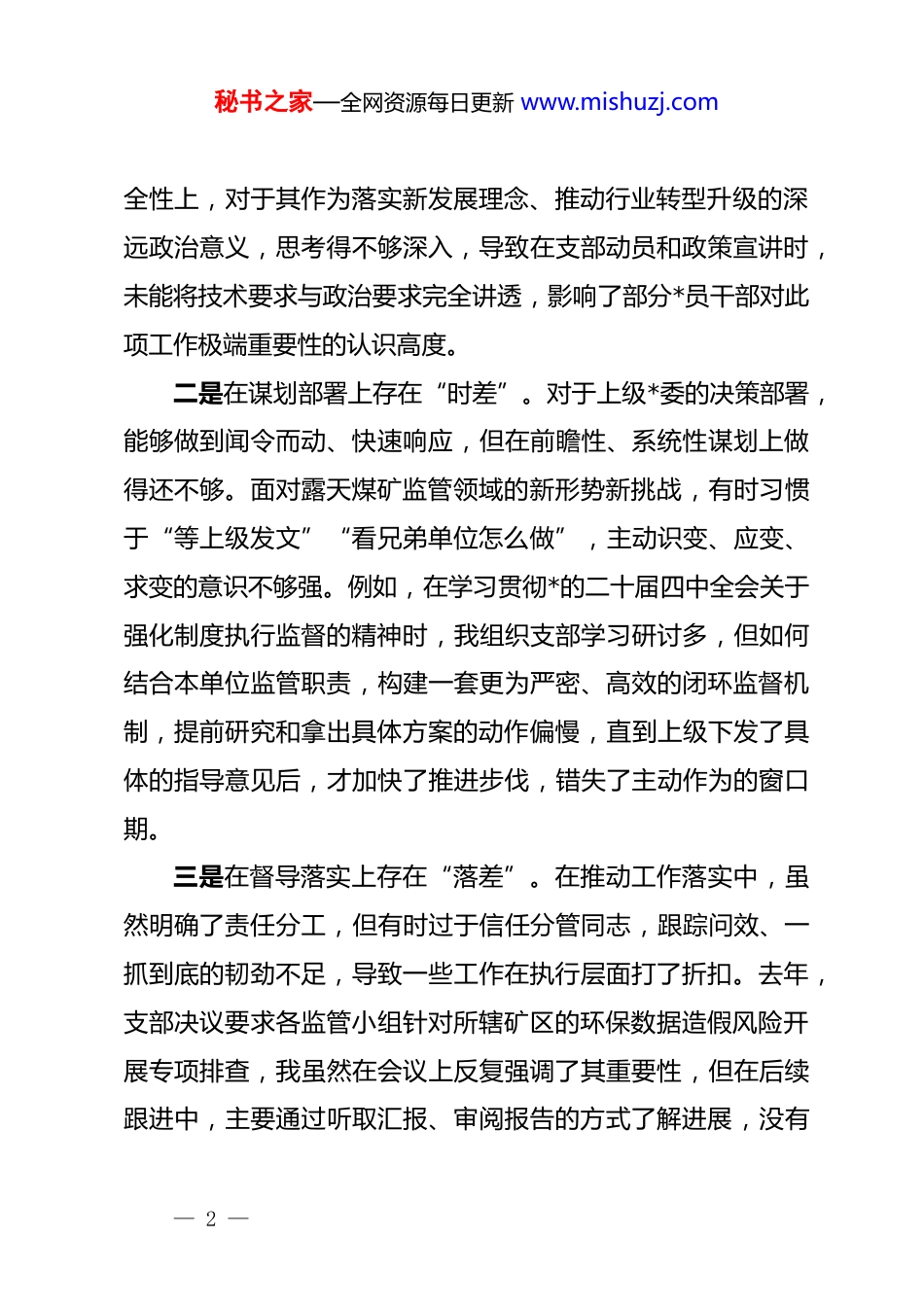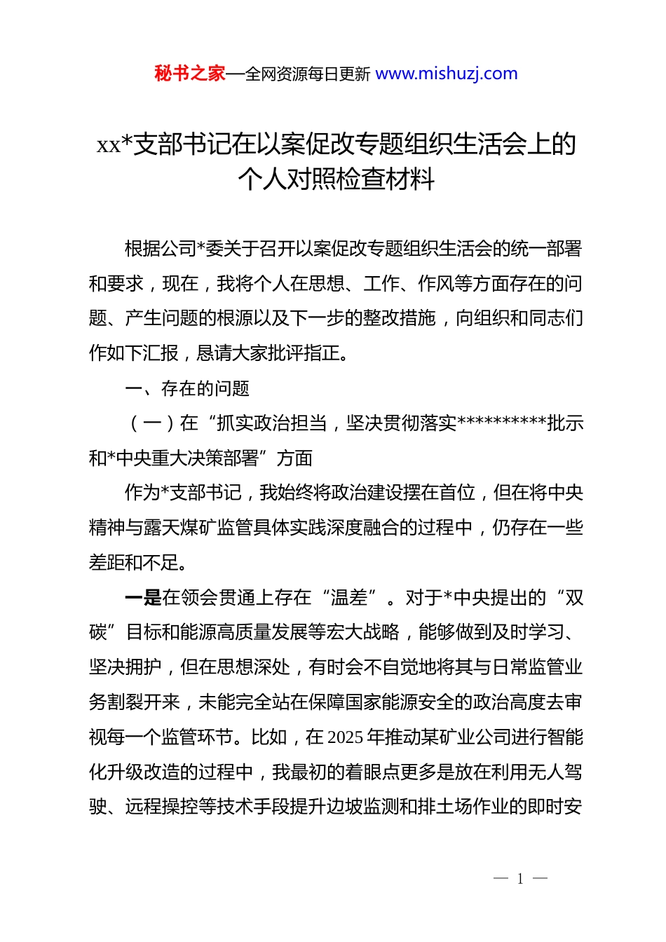 秘书之家—全网资源每日更新 www.mishuzj.comxx*支部书记在以案促改专题组织生活会上的个人对照检查材料根据公司*委关于召开以案促改专题组织生活会的统一部署和要求,现在,我将个人在思想、工作、作风等方面存在的问题、产生问题的根源以及下一步的整改措施,向组织和同志们作如下汇报,恳请大家批评指正。一、存在的问题(一)在“抓实政治担当,坚决贯彻落实**********批示和*中央重大决策部署”方面作为*支部书记,我始终将政治建设摆在首位,但在将中央精神与露天煤矿监管具体实践深度融合的过程中,仍存在一些差距和不足。一是在领会贯通上存在“温差”。对于*中央提出的“双碳”目标和能源高质量发展等宏大战略,能够做到及时学习、坚决拥护,但在思想深处,有时会不自觉地将其与日常监管业务割裂开来,未能完全站在保障国家能源安全的政治高度去审视每一个监管环节。比如,在 2025 年推动某矿业公司进行智能化升级改造的过程中,我最初的着眼点更多是放在利用无人驾驶、远程操控等技术手段提升边坡监测和排土场作业的即时安— 1 —秘书之家—全网资源每日更新 www.mishuzj.com全性上,对于其作为落实新发展理念、推动行业转型升级的深远政治意义,思考得不够深入,导致在支部动员和政策宣讲时,未能将技术要求与政治要求完全讲透,影响了部分*员干部对此项工作极端重要性的认识高度。二是在谋划部署上存在“时差”。对于上级*委的决策部署,能够做到闻令而动、快速响应,但在前瞻性、系统性谋划上做得还不够。面对露天煤矿监管领域的新形势新挑战,有时习惯于“等上级发文”“看兄弟单位怎么做”,主动识变、应变、求变的意识不够强。例如,在学习贯彻*的二十届四中全会关于强化制度执行监督的精神时,我组织支部学习研讨多,但如何结合本单位监管职责,构建一套更为严密、高效的闭环监督机制,提前研究和拿出具体方案的动作偏慢,直到上级下发了具体的指导意见后,才加快了推进步伐,错失了主动作为的窗口期。三是在督导落实上存在“落差”。在推动工作落实中,虽然明确了责任分工,但有时过于信任分管同志,跟踪问效、一抓到底的韧劲不足,导致一些工作在执行层面打了折扣。去年,支部决议要求各监管小组针对所辖矿区的环保数据造假风险开展专项排查,我虽然在会议上反复强调了其重要性,但在后续跟进中,主要通过听取汇报、审阅报告的方式了解进展,没有— 2 —秘书之家—全网资源每日更新 www.mishuzj.com采取“四不两直”的方式深入一线核实排查的深度和广度。直到上级通报相关问题后才发现,个别小组的排查工作存在“走过场”现象,对一些隐蔽性较强的伪造手段未能及时发现,这暴露了我在狠抓落实上存在“最后一公里”的短板。(二)在“抓实‘一岗双责’,筑牢职责与廉政双重防线”方面我深刻认识到,“一岗双责”是*支部书记不可推卸的政治责任。但在实际工作中,统筹业务与 dj、抓好廉政与履职的平衡点有时找得不够精准。一是从*员职责来看,*性锤炼融入日常监管不够。在处理复杂棘手的监管问题时,有时更多地是以一名业务干部的身份出现,强调技术规范、管理标准,而未能时刻以*员的身份,将思想政治工作贯穿始终。在一次处理某煤矿因排土场作业不规范导致出现滑坡隐患的事件中,我与矿方管理人员进行了严肃的约谈,重点剖析了技术漏洞和管理缺陷,并提出了限期整改的刚性要求。但回过头来看,我当时未能敏锐地抓住这一契机,与该单位的*员干部进行一次深入的*性教育,从理想信念、责任担当的高度,引导他们反思安全生产背后的政治责任和民生关怀,使得业务警示多于思想洗礼。二是从工作职责来看,廉政风险防控抓得不够细致。自认— 3 —秘书之家—全网资源每日更新 www.mishuzj.com为身处监管岗位,只要自己行得正、坐得端,就能起到表率作用,但在抓实支部全员廉政风险防控方面,还存在薄弱环节。对关键岗位人员的廉政风险排查和动态监督,更多依赖于制度规定和定期谈话,对其“八小时之外”的社交圈、生活圈了解不深,预防性、保护性措施不够有力。去年,我与一名负责环保验收审批的关键岗位同志进行廉备谈话,主要围绕工作纪律和审批流程的风...