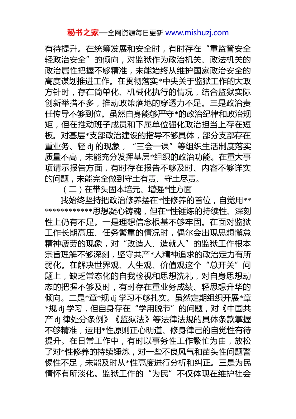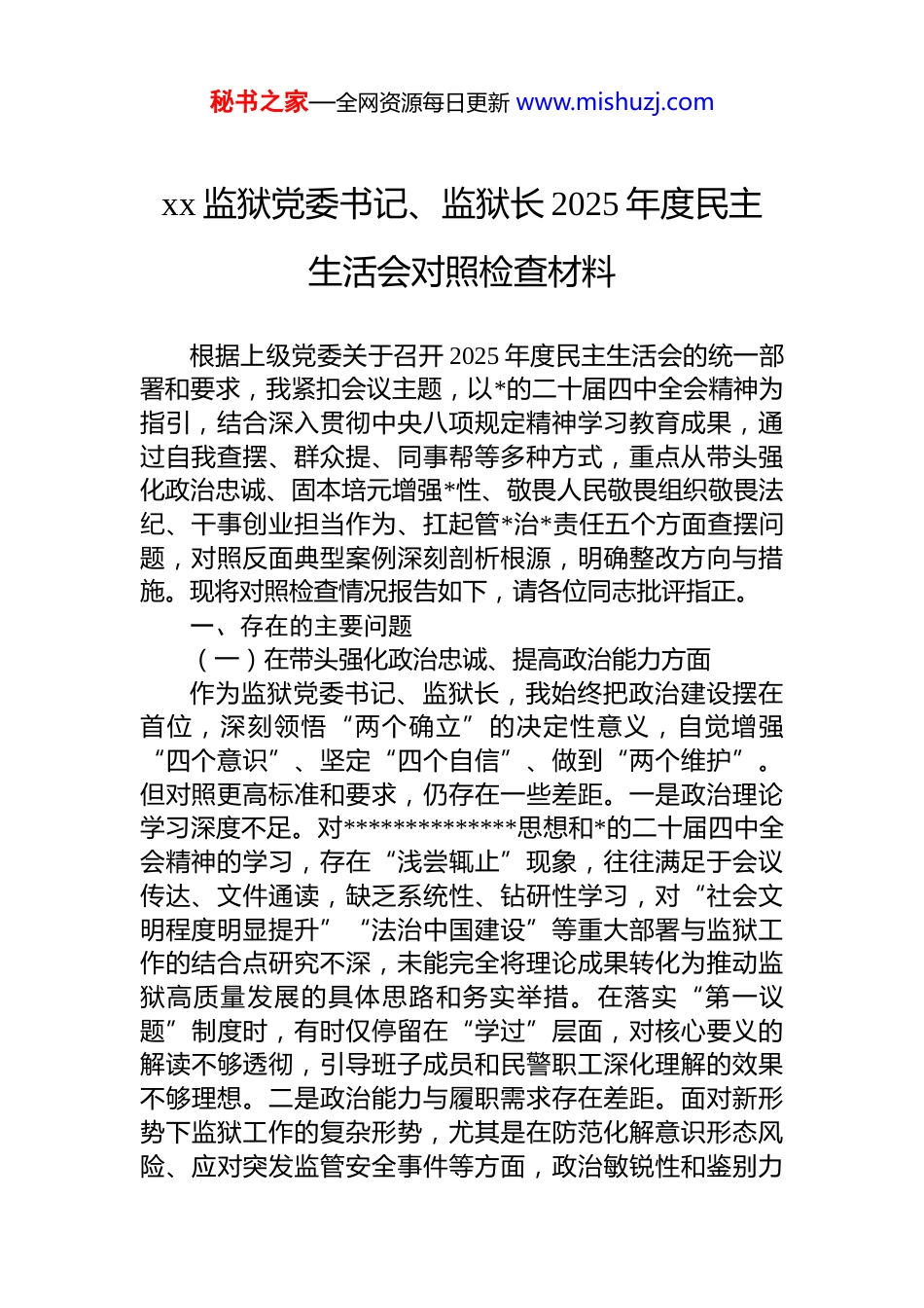 秘书之家—全网资源每日更新 www.mishuzj.comxx 监狱党委书记、监狱长 2025 年度民主生活会对照检查材料根据上级党委关于召开 2025 年度民主生活会的统一部署和要求,我紧扣会议主题,以*的二十届四中全会精神为指引,结合深入贯彻中央八项规定精神学习教育成果,通过自我查摆、群众提、同事帮等多种方式,重点从带头强化政治忠诚、固本培元增强*性、敬畏人民敬畏组织敬畏法纪、干事创业担当作为、扛起管*治*责任五个方面查摆问题,对照反面典型案例深刻剖析根源,明确整改方向与措施。现将对照检查情况报告如下,请各位同志批评指正。一、存在的主要问题(一)在带头强化政治忠诚、提高政治能力方面作为监狱党委书记、监狱长,我始终把政治建设摆在首位,深刻领悟“两个确立”的决定性意义,自觉增强“四个意识”、坚定“四个自信”、做到“两个维护”。但对照更高标准和要求,仍存在一些差距。一是政治理论学习深度不足。对**************思想和*的二十届四中全会精神的学习,存在“浅尝辄止”现象,往往满足于会议传达、文件通读,缺乏系统性、钻研性学习,对“社会文明程度明显提升”“法治中国建设”等重大部署与监狱工作的结合点研究不深,未能完全将理论成果转化为推动监狱高质量发展的具体思路和务实举措。在落实“第一议题”制度时,有时仅停留在“学过”层面,对核心要义的解读不够透彻,引导班子成员和民警职工深化理解的效果不够理想。二是政治能力与履职需求存在差距。面对新形势下监狱工作的复杂形势,尤其是在防范化解意识形态风险、应对突发监管安全事件等方面,政治敏锐性和鉴别力秘书之家—全网资源每日更新 www.mishuzj.com有待提升。在统筹发展和安全时,有时存在“重监管安全轻政治安全”的倾向,对监狱作为政治机关、政法机关的政治属性把握不够精准,未能始终从维护国家政治安全的高度谋划推进工作。在贯彻落实*中央关于监狱工作的大政方针时,存在简单化、机械化执行的情况,结合监狱实际创新举措不多,推动政策落地的穿透力不足。三是政治责任传导不够到位。虽然自身能够严守*的政治纪律和政治规矩,但在推动班子成员和下属单位强化政治担当上存在短板。对基层*支部政治建设的指导不够具体,部分支部存在重业务、轻 dj 的现象,“三会一课”等组织生活制度落实质量不高,未能充分发挥基层*组织的政治功能。在重大事项请示报告方面,有时存在报告不够及时、内容不够详实的问题,未能完全做到守土有责、守土尽责。(二)在带头固本培元、增强*性方面我始终坚持把政治修养摆在*性修养的首位,自觉用**************思想凝心铸魂,但在*性锤炼的持续性、深刻性上仍有不足。一是理想信念根基不够牢固。在面对监狱工作长期高压、任务繁重的情况时,偶尔会出现思想懈怠精神疲劳的现象,对“改造人、造就人”的监狱工作根本宗旨理解不够深刻,坚守共产*人精神追求的政治定力有所弱化。在解决世界观、人生观、价值观这个“总开关”问题上,缺乏常态化的自我检视和思想洗礼,对自身思想动态的把握不够及时,有时存在重业务成绩、轻思想升华的倾向。二是*章*规 dj 学习不够扎实。虽然定期组织开展*章*规 dj 学习,但自身存在“学用脱节”的问题,对《中国共产 dj 律处分条例》《监狱法》等法律法规的具体条款掌握不够精准,运用*性原则正心明道、修身律己的自觉性有待提升。在日常工作中,有时以事务性工作繁忙为由,放松了对*性修养的持续锤炼,对一些不良风气和苗头性问题警惕性不足,未能及时从*性高度进行分析和纠正。三是为民情怀有所淡化。监狱工作的“为民”不仅体现在维护社会秘书之家—全网资源每日更新 www.mishuzj.com安全稳定上,更体现在对罪犯的教育改造和对民警职工的关心关爱上。但在实际工作中,我更多关注监管安全和执法规范,对罪犯的教育改造方式创新不足,未能充分结合罪犯个体特点开展精准改造,帮助其顺利回归社会的力度有待加强。对民警职工的“急难愁盼”问题解决不够及时尤其是在民警职业发展、工作压力缓解、生活保障改善等方面,政策措施的针对性和实效性不够强,未能充分激发队伍的凝聚力和向心力。(三)在带头敬畏人...