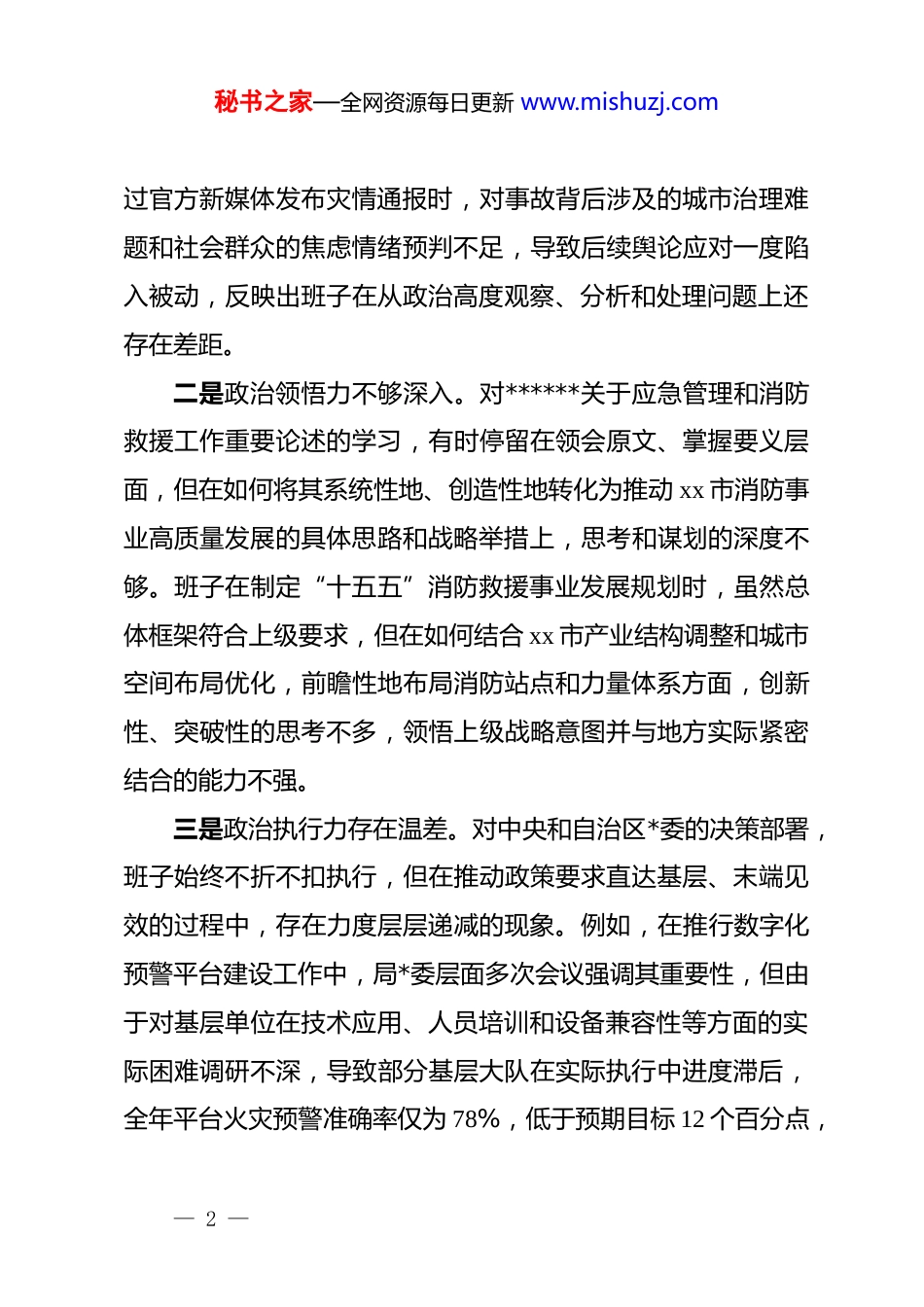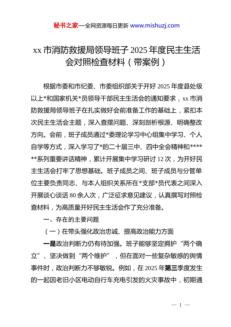 秘书之家—全网资源每日更新 www.mishuzj.comxx 市消防救援局领导班子 2025 年度民主生活会对照检查材料(带案例)根据市委和市纪委、市委组织部关于开好 2025 年度县处级以上*和国家机关*员领导干部民主生活会的通知要求,xx 市消防救援局领导班子在扎实做好会前准备工作的基础上,紧扣本次民主生活会主题,深入查摆问题、深刻剖析根源、明确整改方向。会前,班子成员通过*委理论学习中心组集中学习、个人自学等方式,深入学习了*的二十届三中、四中全会精神和******系列重要讲话精神,累计开展集中学习研讨 12 次,为开好民主生活会打牢了思想基础。班子成员之间、班子成员与分管单位主要负责同志、与本人组织关系所在*支部*员代表之间深入开展谈心谈话 80 余人次,广泛征求意见建议,认真撰写对照检查材料,为高质量开好民主生活会作了充分准备。一、存在的主要问题(一)在带头强化政治忠诚、提高政治能力方面一是政治判断力仍有待加强。班子能够坚定拥护“两个确立”、坚决做到“两个维护”,但在面对一些复杂敏感的舆情事件时,政治判断力不够敏锐。例如,在 2025 年第三季度发生的一起因老旧小区电动自行车充电引发的火灾事故中,初期通— 1 —秘书之家—全网资源每日更新 www.mishuzj.com过官方新媒体发布灾情通报时,对事故背后涉及的城市治理难题和社会群众的焦虑情绪预判不足,导致后续舆论应对一度陷入被动,反映出班子在从政治高度观察、分析和处理问题上还存在差距。二是政治领悟力不够深入。对******关于应急管理和消防救援工作重要论述的学习,有时停留在领会原文、掌握要义层面,但在如何将其系统性地、创造性地转化为推动 xx 市消防事业高质量发展的具体思路和战略举措上,思考和谋划的深度不够。班子在制定“十五五”消防救援事业发展规划时,虽然总体框架符合上级要求,但在如何结合 xx 市产业结构调整和城市空间布局优化,前瞻性地布局消防站点和力量体系方面,创新性、突破性的思考不多,领悟上级战略意图并与地方实际紧密结合的能力不强。三是政治执行力存在温差。对中央和自治区*委的决策部署,班子始终不折不扣执行,但在推动政策要求直达基层、末端见效的过程中,存在力度层层递减的现象。例如,在推行数字化预警平台建设工作中,局*委层面多次会议强调其重要性,但由于对基层单位在技术应用、人员培训和设备兼容性等方面的实际困难调研不深,导致部分基层大队在实际执行中进度滞后,全年平台火灾预警准确率仅为 78%,低于预期目标 12 个百分点,— 2 —秘书之家—全网资源每日更新 www.mishuzj.com反映出抓落实的穿透力不强,政治执行的全过程闭环管理不彻底。(二)在带头固本培元、增强*性方面一是理论武装的转化效果不好。班子成员能够坚持读原著、学原文、悟原理,但将学习成果内化为坚定理想信念、外化为指导实践行动的转化链条不顺畅。在 2025 年组织的 12 次*委理论学习中心组学习中,有几次的研讨交流环节变成了简单的工作汇报,未能真正围绕理论学习进行思想碰撞和*性淬炼。这说明在运用*的创新理论改造主观世界、解决“总开关”问题上,下的功夫还不够扎实。二是*性修养的日常锤炼不严。在严肃的*内政治生活中能够严格要求自己,但在日常工作和生活中,对*性修养的自我要求有所放松。个别班子成员习惯于在办公室听取汇报、电话遥控指挥,而不是第一时间深入火场、深入基层一线与指战员共同战斗。这种工作习惯的背后,反映出对“我是谁、为了谁、依靠谁”的根本性问题思考不深,共产*人艰苦奋斗的精神底色有所褪化。三是红色基因的传承弘扬不力。对消防救援队伍红色基因和优良传统的挖掘、宣传和弘扬力度不够。虽然也组织参观红色教育基地、学习英模事迹,但形式较为单一,未能将其与新— 3 —秘书之家—全网资源每日更新 www.mishuzj.com时代消防救援队伍的职责使命进行深度融合。例如,在队伍内部开展的“队史荣誉”教育活动中,满足于讲述历史、展示荣誉,但在如何激励年轻指战员在新征程上续写辉煌、再创佳绩方面,缺乏触及灵魂的引导和感召,导致部分年轻干部精神状态出现钝化迹象。(三)在带头敬畏人...
