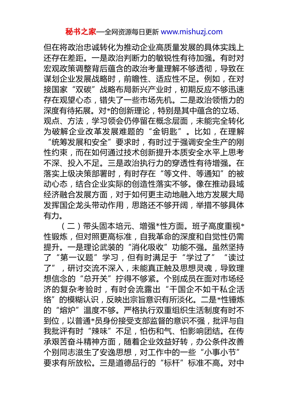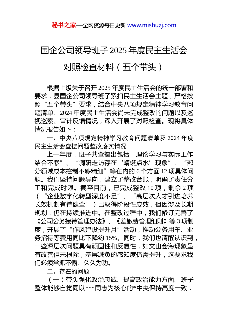 秘书之家—全网资源每日更新 www.mishuzj.com国企公司领导班子 2025 年度民主生活会对照检查材料(五个带头)根据上级关于召开 2025 年度民主生活会的统一部署和要求,县国企公司领导班子紧扣民主生活会主题,严格按照“五个带头”要求,结合中央八项规定精神学习教育问题清单、2024 年度民主生活会尚未完成整改的问题以及巡视巡察、审计反馈情况,深入开展了对照检查。现将具体情况报告如下:一、中央八项规定精神学习教育问题清单及 2024 年度民主生活会查摆问题整改落实情况上一年度,班子共查摆出包括“理论学习与实际工作结合不紧”、“调研走访存在‘蜻蜓点水’现象”、“部分领域成本控制不够精细”等在内的 6 个方面 12 项具体问题。我们坚持问题导向,建立了整改台账,明确了责任分工和完成时限。截至目前,已完成整改 10 项,剩余 2 项(“企业数字化转型深度不足”、“高层次人才引进培养长效机制有待健全”)已取得阶段性成效,但因涉及长期规划,仍在持续推进中。在整改过程中,我们修订完善了《公司公务接待管理办法》、《差旅费管理细则》等 3 项制度,开展了“作风建设提升月”活动,推动公务用车、业务招待等费用同比下降约 15%。同时,我们也清醒认识到,一些深层次问题具有顽固性和反复性,如文山会海现象虽有改善但未根除,基层减负的感知度仍需提升,这要求我们必须常抓不懈、久久为功。二、存在的问题(一)带头强化政治忠诚、提高政治能力方面。班子整体能够自觉同以***同志为核心的*中央保持高度一致,秘书之家—全网资源每日更新 www.mishuzj.com但在将政治忠诚转化为推动企业高质量发展的具体实践上还存在差距。一是政治判断力的敏锐性有待加强。有时对宏观政策调整背后蕴含的政治考量理解不够透彻,导致在谋划企业发展战略时,前瞻性、适应性不足。例如,在对接国家“双碳”战略布局新兴产业时,初期反应不够迅速存在观望心态,错失了一些市场先机。二是政治领悟力的深度有待拓展。对*的创新理论,特别是其中蕴含的立场、观点、方法,学习领会仍停留在概念层面,未能完全转化为破解企业改革发展难题的“金钥匙”。比如,在理解“统筹发展和安全”要求时,有时过于强调安全生产的刚性约束,而在如何通过技术创新提升本质安全水平上思考不深、投入不足。三是政治执行力的穿透性有待增强。在落实上级决策部署时,有时存在“等文件、等通知”的被动心态,结合企业实际的创造性落实不够。像在推动县域经济融合发展方面,对于如何更主动地融入地方发展大局发挥国企龙头带动作用,思路还不够开阔,举措不够具体有力。(二)带头固本培元、增强*性方面。班子高度重视*性锻炼,但对照更高标准,自我革命的深度和自觉性仍需提升。一是理论武装的“消化吸收”功能不强。虽然坚持了“第一议题”学习,但有时满足于“学过了”“读过了”,研讨交流不深入,未能真正触及思想灵魂,导致理想信念的“总开关”拧得不够紧。个别成员在面对市场经济的复杂考验时,有时会流露出“干国企不如干私企活络”的模糊认识,反映出宗旨意识有所淡化。二是*性锤炼的“熔炉”温度不够。严格执行双重组织生活制度有时不到位,以普通*员身份接受支部监督的意识不强,批评与自我批评有时“辣味”不足,怕伤和气、怕影响团结。在传承艰苦奋斗精神方面,随着企业效益好转,办公条件改善个别同志滋生了安逸思想,对工作中的一些“小事小节”要求有所放松。三是道德品行的“标杆”标准不高。对中秘书之家—全网资源每日更新 www.mishuzj.com华优秀传统文化、革命文化和社会主义先进文化的学习践行不够自觉,在涵养廉洁文化、培育良好家风方面表率作用发挥不充分。有时对社会上的一些不良风气和错误言论未能旗帜鲜明地进行抵制和斗争。(三)带头敬畏人民、敬畏组织、敬畏法纪方面。班子能够认识到权力是人民赋予的,但在具体行权用权中,敬畏之心仍需时刻保持。一是敬畏人民,但“接地气”不够。虽然建立了基层联系点,但“下沉”深度不足,听汇报多、直接倾听一线职工心声少,对职工群众在薪酬福利职业发展、工作环境等方面的急难愁盼问题,了解不够全面、回应不够及时...