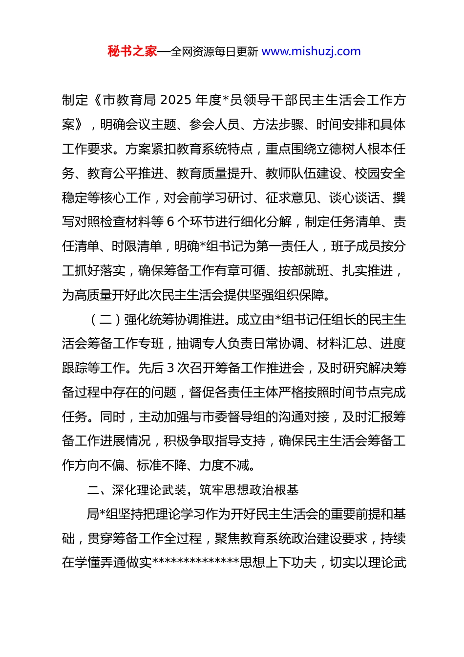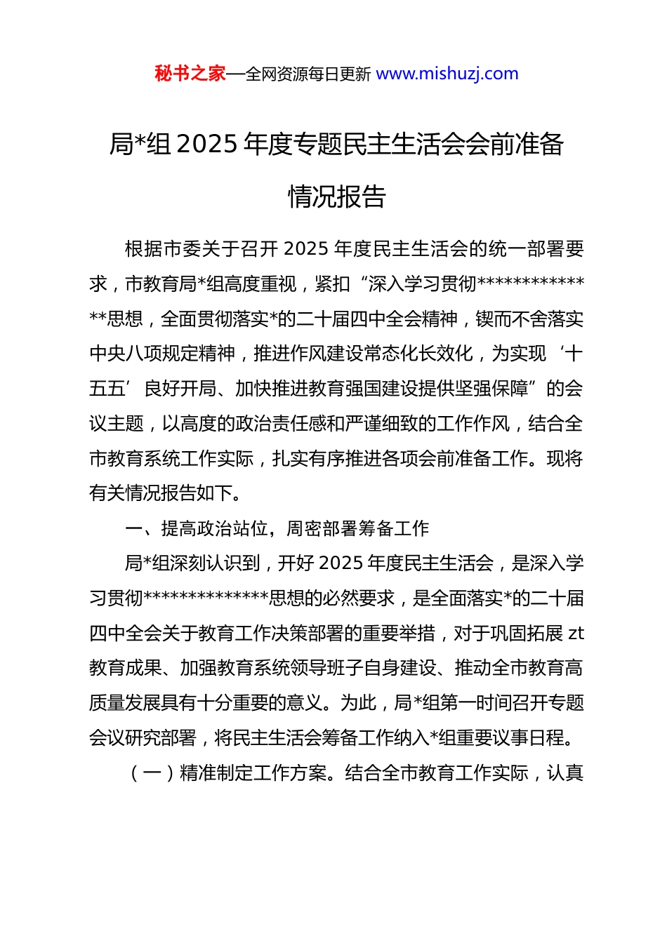 秘书之家—全网资源每日更新 www.mishuzj.com局*组 2025 年度专题民主生活会会前准备情况报告根据市委关于召开 2025 年度民主生活会的统一部署要求,市教育局*组高度重视,紧扣“深入学习贯彻**************思想,全面贯彻落实*的二十届四中全会精神,锲而不舍落实中央八项规定精神,推进作风建设常态化长效化,为实现‘十五五’良好开局、加快推进教育强国建设提供坚强保障”的会议主题,以高度的政治责任感和严谨细致的工作作风,结合全市教育系统工作实际,扎实有序推进各项会前准备工作。现将有关情况报告如下。一、提高政治站位,周密部署筹备工作局*组深刻认识到,开好 2025 年度民主生活会,是深入学习贯彻**************思想的必然要求,是全面落实*的二十届四中全会关于教育工作决策部署的重要举措,对于巩固拓展 zt教育成果、加强教育系统领导班子自身建设、推动全市教育高质量发展具有十分重要的意义。为此,局*组第一时间召开专题会议研究部署,将民主生活会筹备工作纳入*组重要议事日程。(一)精准制定工作方案。结合全市教育工作实际,认真秘书之家—全网资源每日更新 www.mishuzj.com制定《市教育局 2025 年度*员领导干部民主生活会工作方案》,明确会议主题、参会人员、方法步骤、时间安排和具体工作要求。方案紧扣教育系统特点,重点围绕立德树人根本任务、教育公平推进、教育质量提升、教师队伍建设、校园安全稳定等核心工作,对会前学习研讨、征求意见、谈心谈话、撰写对照检查材料等 6 个环节进行细化分解,制定任务清单、责任清单、时限清单,明确*组书记为第一责任人,班子成员按分工抓好落实,确保筹备工作有章可循、按部就班、扎实推进,为高质量开好此次民主生活会提供坚强组织保障。(二)强化统筹协调推进。成立由*组书记任组长的民主生活会筹备工作专班,抽调专人负责日常协调、材料汇总、进度跟踪等工作。先后 3 次召开筹备工作推进会,及时研究解决筹备过程中存在的问题,督促各责任主体严格按照时间节点完成任务。同时,主动加强与市委督导组的沟通对接,及时汇报筹备工作进展情况,积极争取指导支持,确保民主生活会筹备工作方向不偏、标准不降、力度不减。二、深化理论武装,筑牢思想政治根基局*组坚持把理论学习作为开好民主生活会的重要前提和基础,贯穿筹备工作全过程,聚焦教育系统政治建设要求,持续在学懂弄通做实**************思想上下功夫,切实以理论武秘书之家—全网资源每日更新 www.mishuzj.com装凝聚思想共识、提升政治能力。(一)明确学习重点内容。制定专题学习计划,明确学习重点,组织班子成员深入学习领会******关于*的建设的重要思想、关于*的自我革命的重要思想、关于作风建设的重要论述,系统学习*的二十届四中全会精神和******最新重要讲话精神,重点研读******关于教育的重要论述及对教育工作的****批示精神。同时,重温*章、《关于新形势下*内政治生活的若干准则》《中国共产 dj 律处分条例》等*内法规,以及教育部关于推进教育高质量发展的相关政策文件,切实把准教育系统民主生活会的政治方向和实践要求。(二)丰富学习方式载体。采取“集体研讨+个人自学+专题辅导”相结合的方式,扎实开展理论学习。2026 年 1 月 4日,局*组理论学习中心组举行会前集中学习研讨会,*组书记带头领学导学,班子成员结合分管工作逐一交流发言。邀请市委*校专家围绕“教育系统如何践行自我革命精神”作专题辅导报告,组织观看《作风建设永远在路上》等警示教育片。班子成员结合自学情况,撰写心得体会 12 篇,深入探讨如何以打攻坚战、持久战的决心和恒心,锲而不舍落实中央八项规定精神,切实解决教育系统存在的形式主义、官僚主义问题,推进作风建设常态化长效化。秘书之家—全网资源每日更新 www.mishuzj.com(三)提升学用结合成效。坚持学思用贯通、知信行统一,引导班子成员把理论学习与推动教育工作实际相结合,聚焦“双减”政策深化、义务教育优质均衡发展创建、职业教育产教融合、校园安全专项整治等重点工作,深入思考破解难题的思路举措。通过系统深入学习,班子成员进一步深化对“两个确立”决...