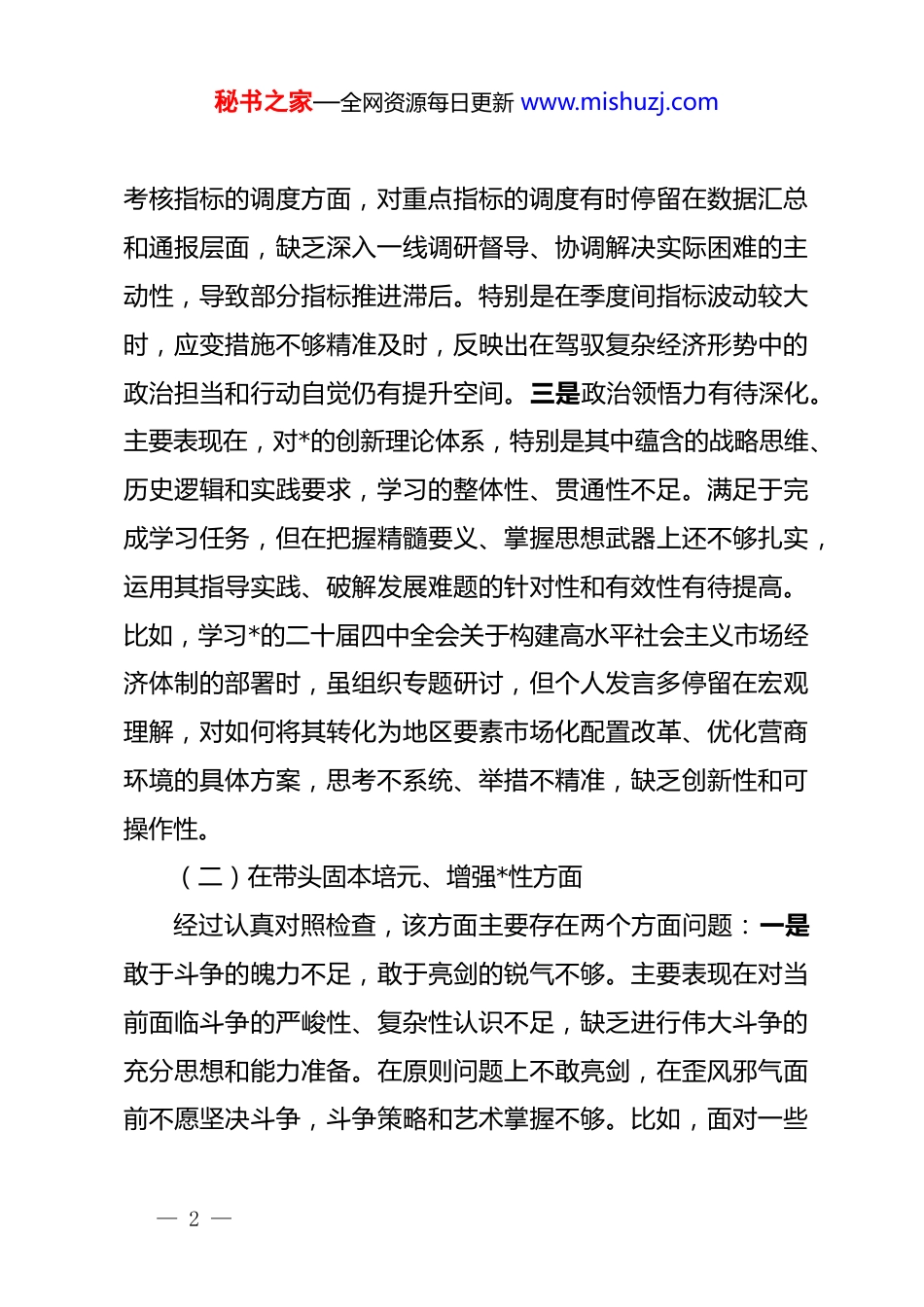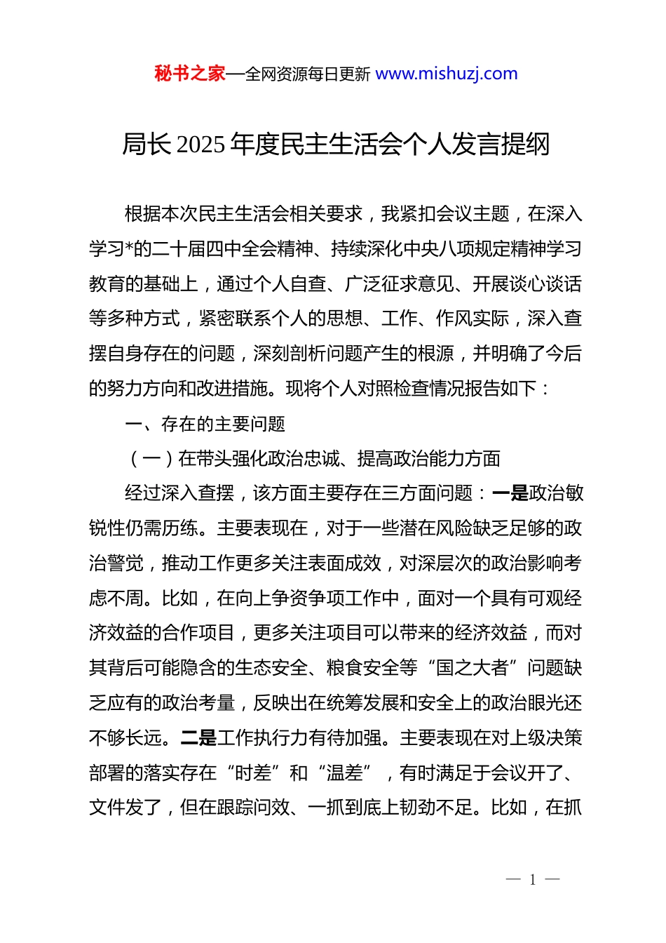 秘书之家—全网资源每日更新 www.mishuzj.com局长 2025 年度民主生活会个人发言提纲根据本次民主生活会相关要求,我紧扣会议主题,在深入学习*的二十届四中全会精神、持续深化中央八项规定精神学习教育的基础上,通过个人自查、广泛征求意见、开展谈心谈话等多种方式,紧密联系个人的思想、工作、作风实际,深入查摆自身存在的问题,深刻剖析问题产生的根源,并明确了今后的努力方向和改进措施。现将个人对照检查情况报告如下:一、存在的主要问题(一)在带头强化政治忠诚、提高政治能力方面 经过深入查摆,该方面主要存在三方面问题:一是政治敏锐性仍需历练。主要表现在,对于一些潜在风险缺乏足够的政治警觉,推动工作更多关注表面成效,对深层次的政治影响考虑不周。比如,在向上争资争项工作中,面对一个具有可观经济效益的合作项目,更多关注项目可以带来的经济效益,而对其背后可能隐含的生态安全、粮食安全等“国之大者”问题缺乏应有的政治考量,反映出在统筹发展和安全上的政治眼光还不够长远。二是工作执行力有待加强。主要表现在对上级决策部署的落实存在“时差”和“温差”,有时满足于会议开了、文件发了,但在跟踪问效、一抓到底上韧劲不足。比如,在抓— 1 —秘书之家—全网资源每日更新 www.mishuzj.com考核指标的调度方面,对重点指标的调度有时停留在数据汇总和通报层面,缺乏深入一线调研督导、协调解决实际困难的主动性,导致部分指标推进滞后。特别是在季度间指标波动较大时,应变措施不够精准及时,反映出在驾驭复杂经济形势中的政治担当和行动自觉仍有提升空间。三是政治领悟力有待深化。主要表现在,对*的创新理论体系,特别是其中蕴含的战略思维、历史逻辑和实践要求,学习的整体性、贯通性不足。满足于完成学习任务,但在把握精髓要义、掌握思想武器上还不够扎实,运用其指导实践、破解发展难题的针对性和有效性有待提高。比如,学习*的二十届四中全会关于构建高水平社会主义市场经济体制的部署时,虽组织专题研讨,但个人发言多停留在宏观理解,对如何将其转化为地区要素市场化配置改革、优化营商环境的具体方案,思考不系统、举措不精准,缺乏创新性和可操作性。(二)在带头固本培元、增强*性方面经过认真对照检查,该方面主要存在两个方面问题:一是敢于斗争的魄力不足,敢于亮剑的锐气不够。主要表现在对当前面临斗争的严峻性、复杂性认识不足,缺乏进行伟大斗争的充分思想和能力准备。在原则问题上不敢亮剑,在歪风邪气面前不愿坚决斗争,斗争策略和艺术掌握不够。比如,面对一些— 2 —秘书之家—全网资源每日更新 www.mishuzj.com情况复杂的历史遗留问题,存在“新官不理旧账”的畏难情绪,协调推动化解力度不够,导致部分问题久拖不决,影响了群众利益和政府公信力。又如,面对部分干部思想松懈,精神状态不佳、进取意识弱化等问题,提醒谈话不够及时,批评教育失之于宽,存在一定的“老好人”思想,反映出在履行全面从严治*政治责任上还不够严实。二是推动工作的思路不宽,破解难题的办法不多。主要表现在,工作中习惯于按部就班、沿用传统模式,缺乏主动创新的意识和魄力,面对新情况新问题仍习惯于套用旧办法、老经验,缺乏前瞻性思考和系统性谋划。比如,在产业转型升级方面,对传统制造业技改升级的推动仍停留在政策补贴、会议动员层面,未能结合我区实际探索数字化、绿色化融合发展的新路径。面对招商引资竞争加剧的形势,仍依赖“筑巢引凤”的传统模式,对新模式、新手段研究不深、尝试不多,导致优质项目储备不足的问题未能得到根本改善。(三)在带头敬畏人民、敬畏组织、敬畏法纪方面经过深入检查,该方面主要存在两个方面问题:一是政绩观存在偏差,未能始终把打基础、利长远作为工作导向。主要表现在推动工作中,对短期内能见效、易出彩的项目投入精力较多,而对一些周期长、见效慢但事关长远发展的基础性工作重视不够、谋划不深。有时不能完全正确处理显绩与潜绩、当— 3 —秘书之家—全网资源每日更新 www.mishuzj.com前与长远的关系,存在急于求成的心态。比如,在争资争项工作中,对项目安全、生态环保等底线要...